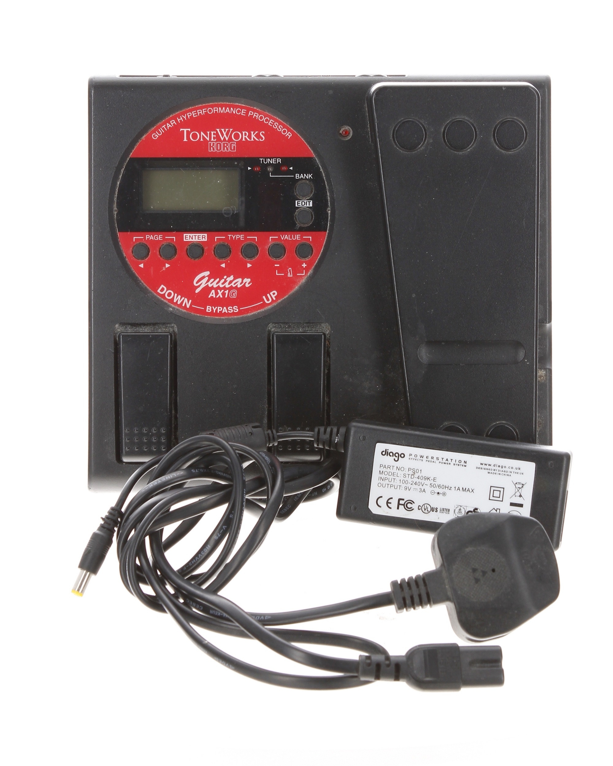 Korg Toneworks AX1G multi-effects guitar pedal; together with a Diago power supply