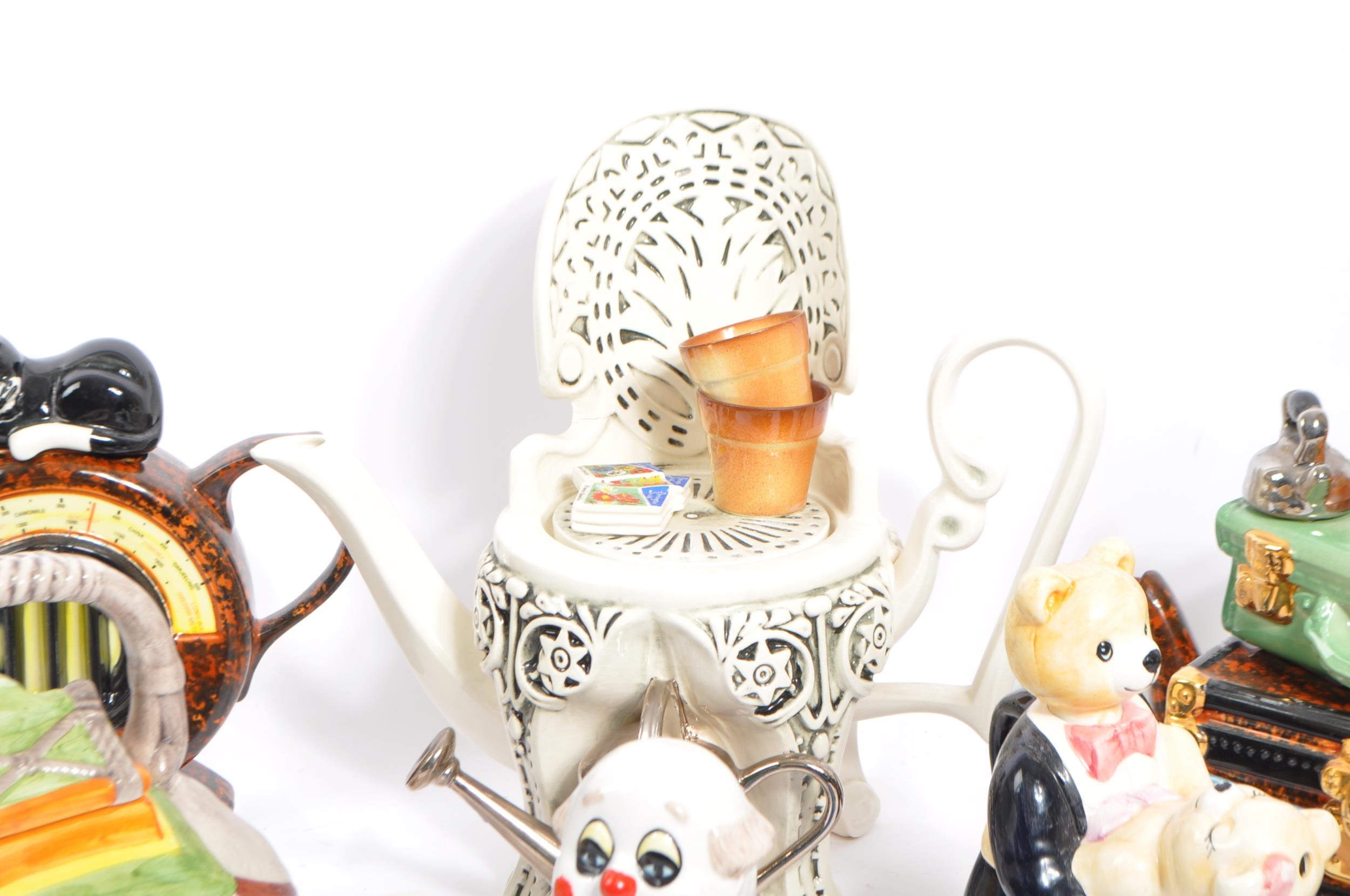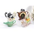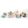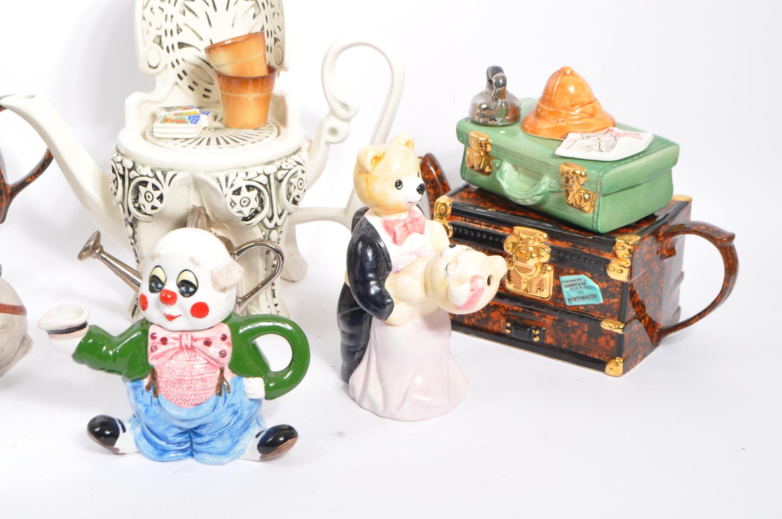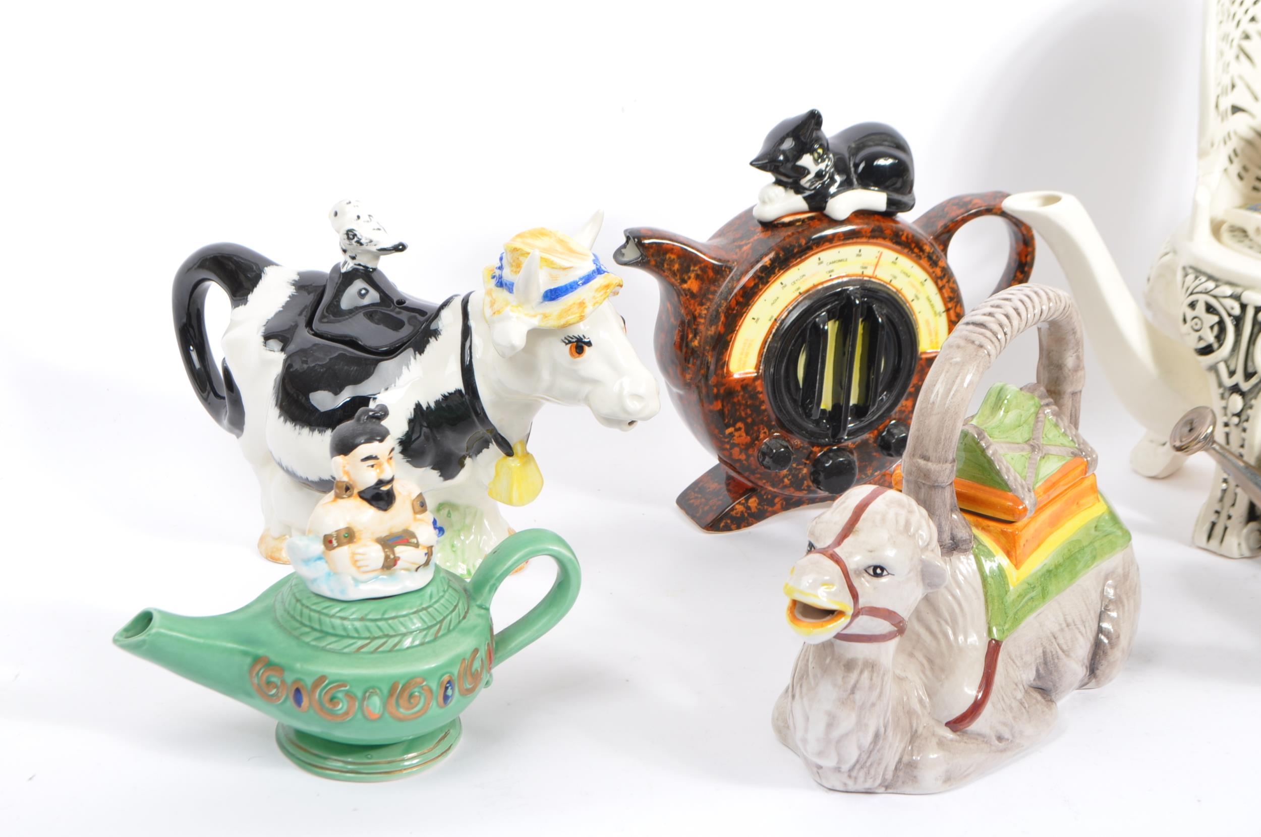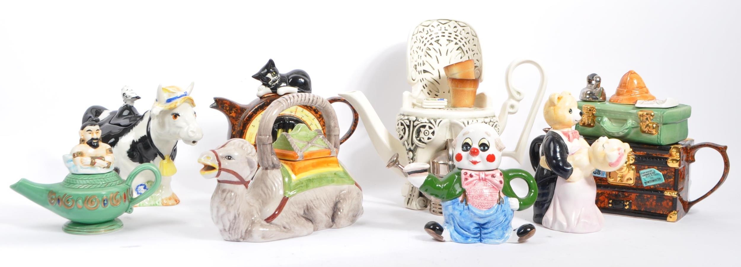 A collection of eight vintage later 20th century novelty teapots. Comprising of a various examples; Luggage/suitcase & bakelite effect radio/cat example by Swineside Ceramics - England, garden seat by Richard Parrington - Whitstable/Kent, resting camel marked Italy, Cow in summer hat marked P&K - England, genie lamp and genie, clown example by Leonardo and dancing bears. Largest measures 26cm.