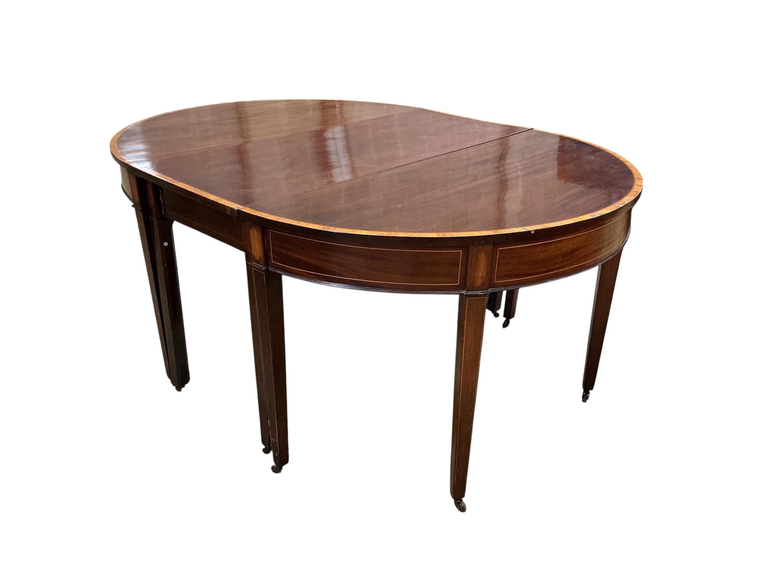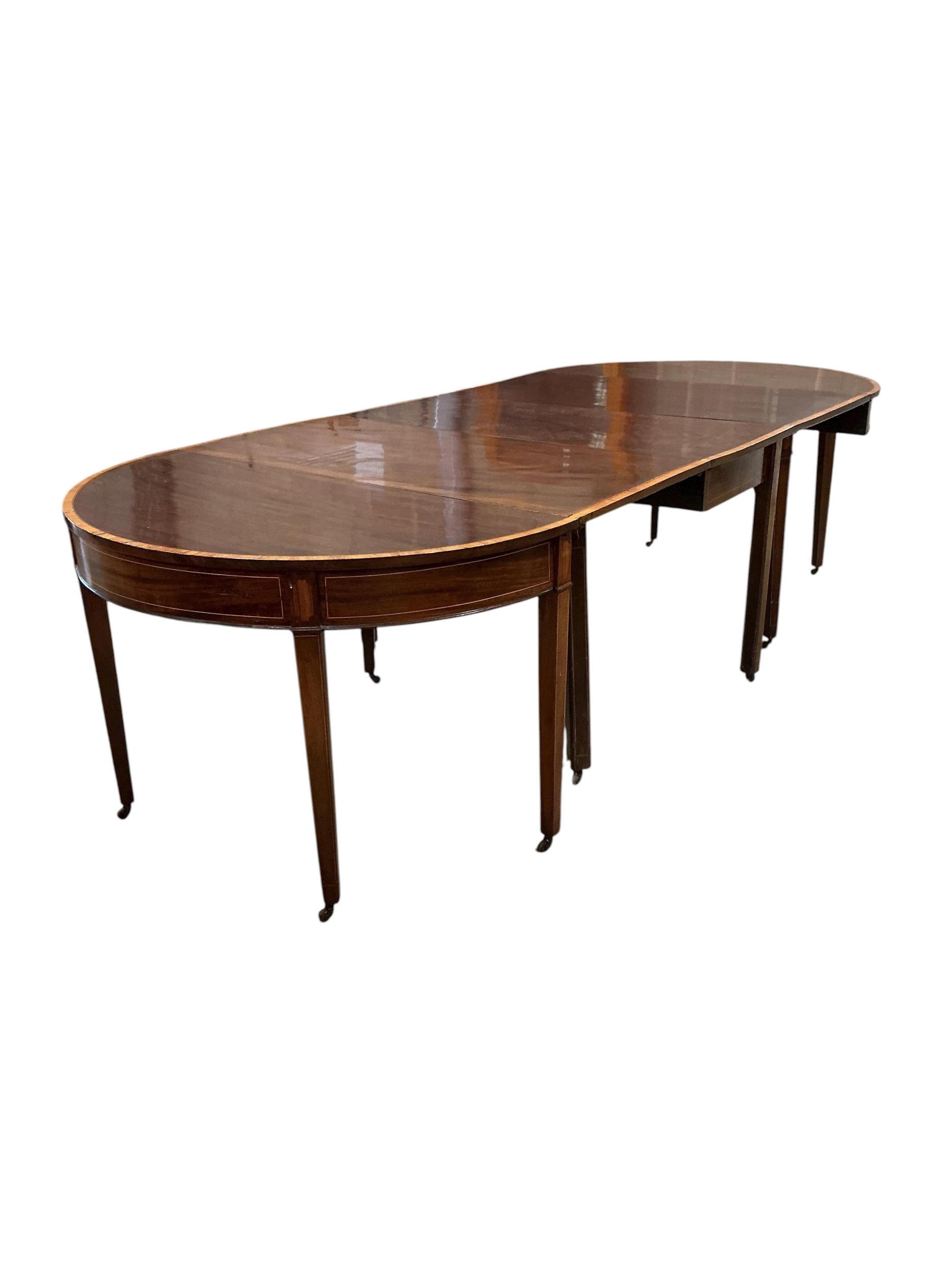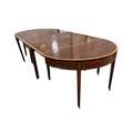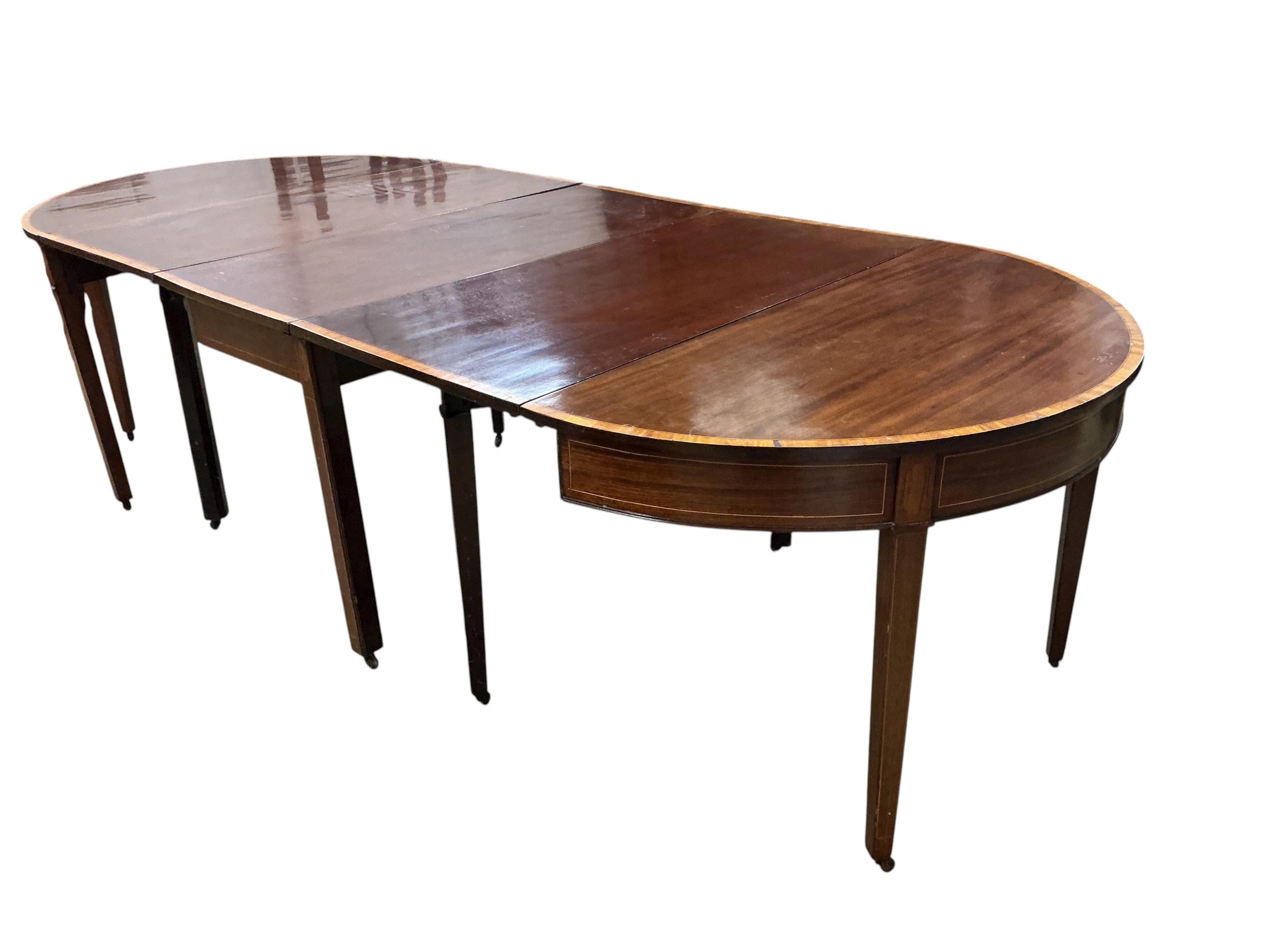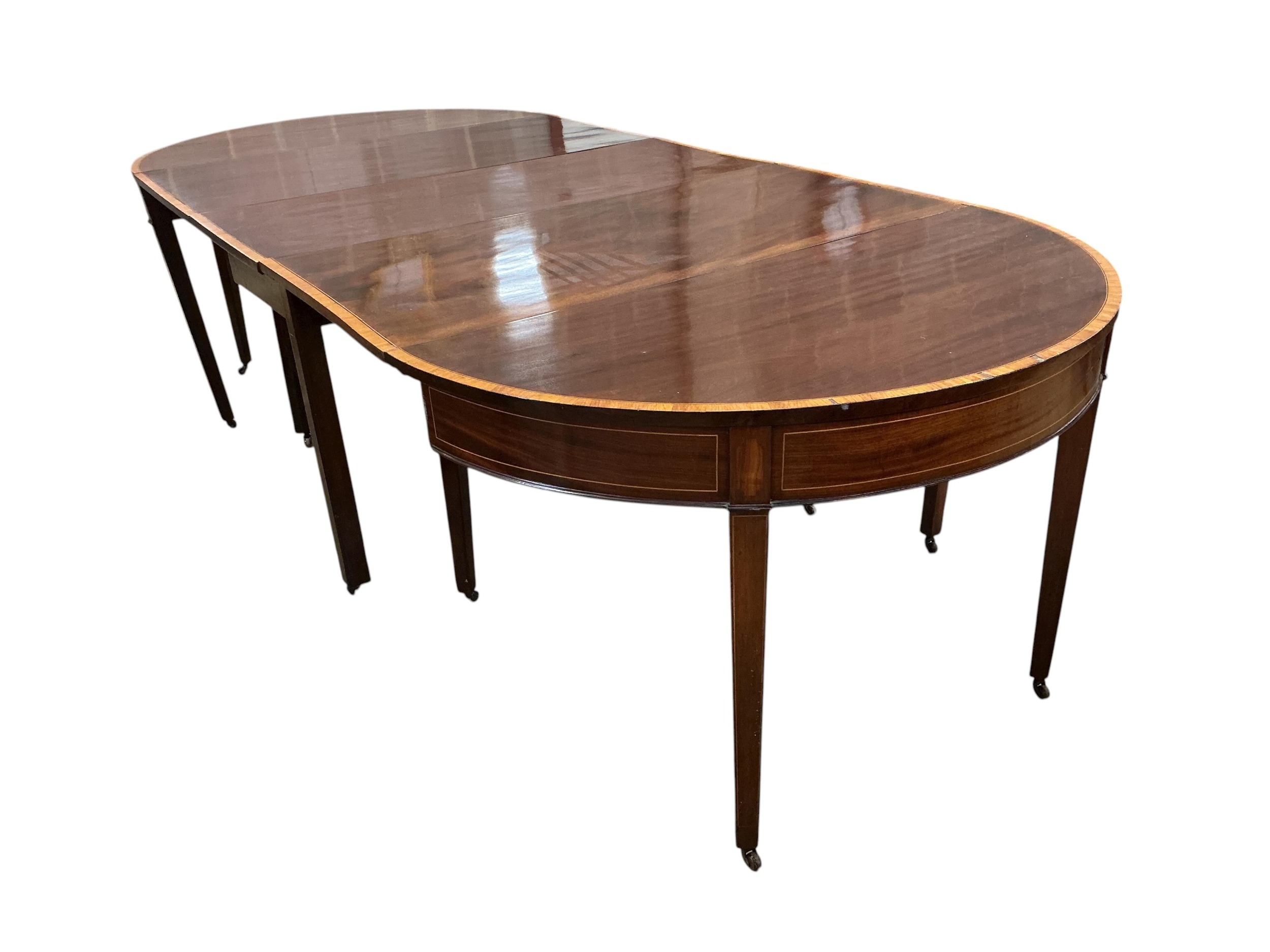 A George III satinwood banded mahogany D end extending dining table, with two spare leaves, 284cm extended, depth 120cm, height 74cm, together with a set of eight Victorian mahogany balloon back dining chairs
