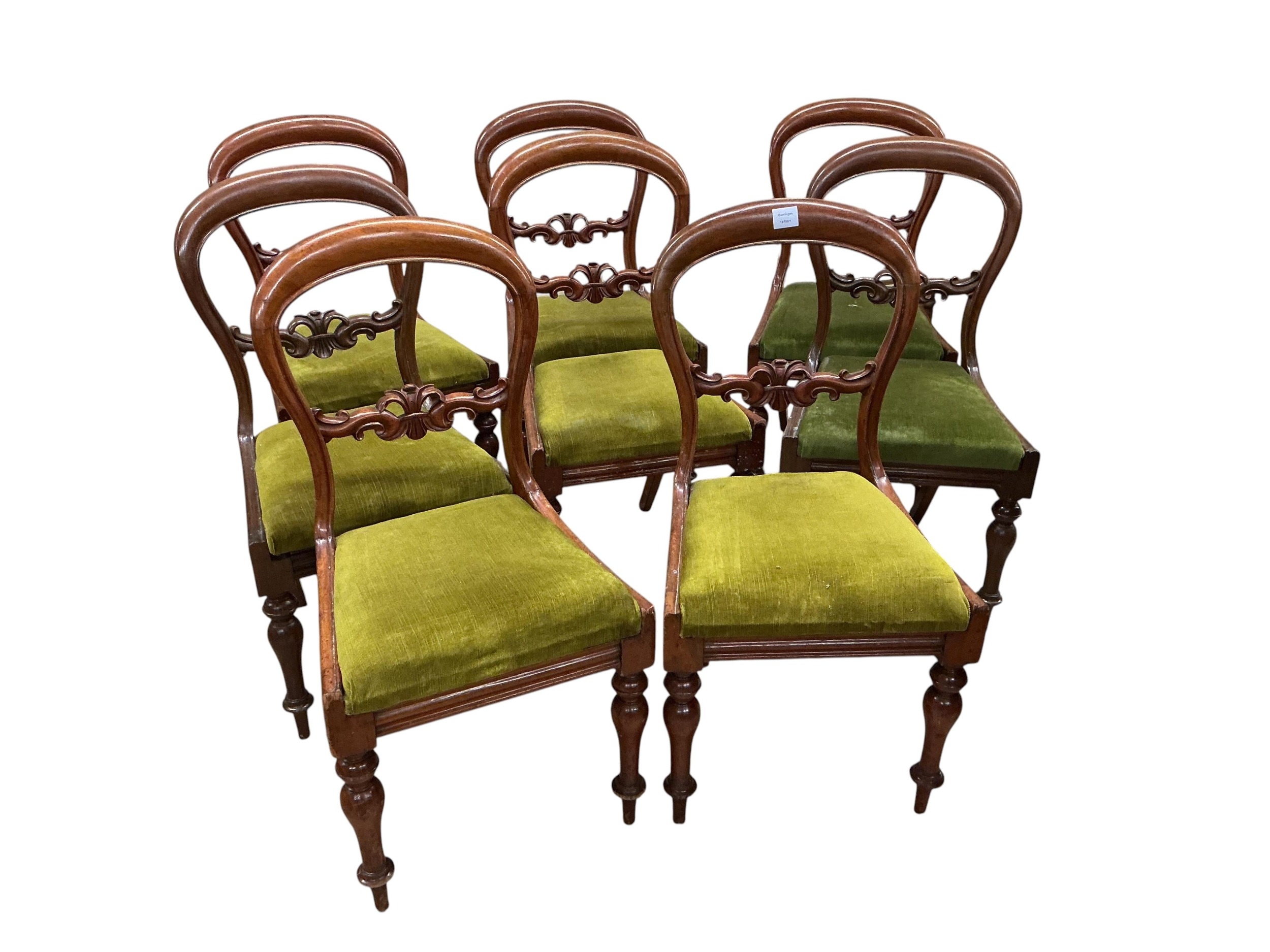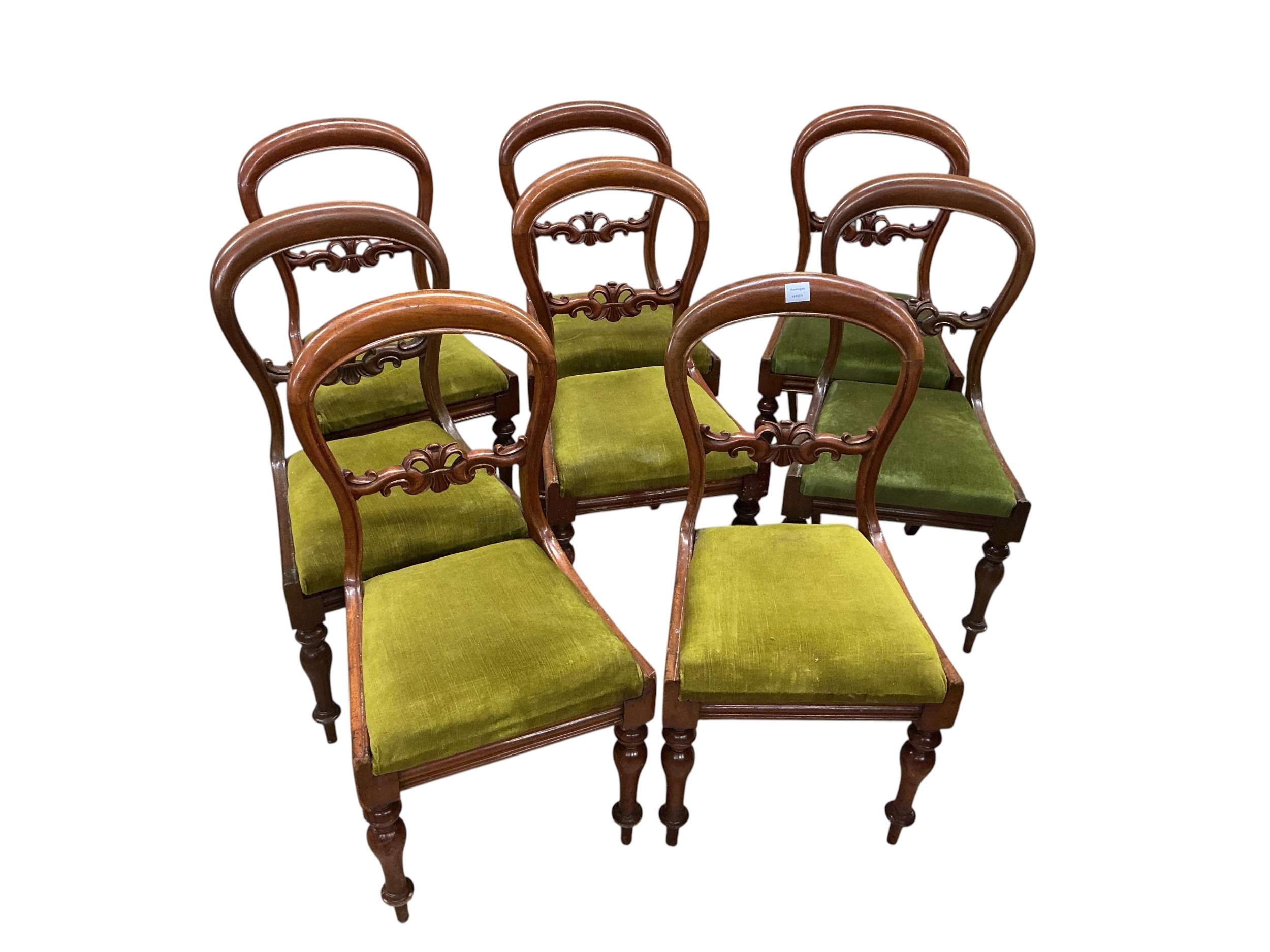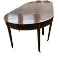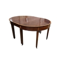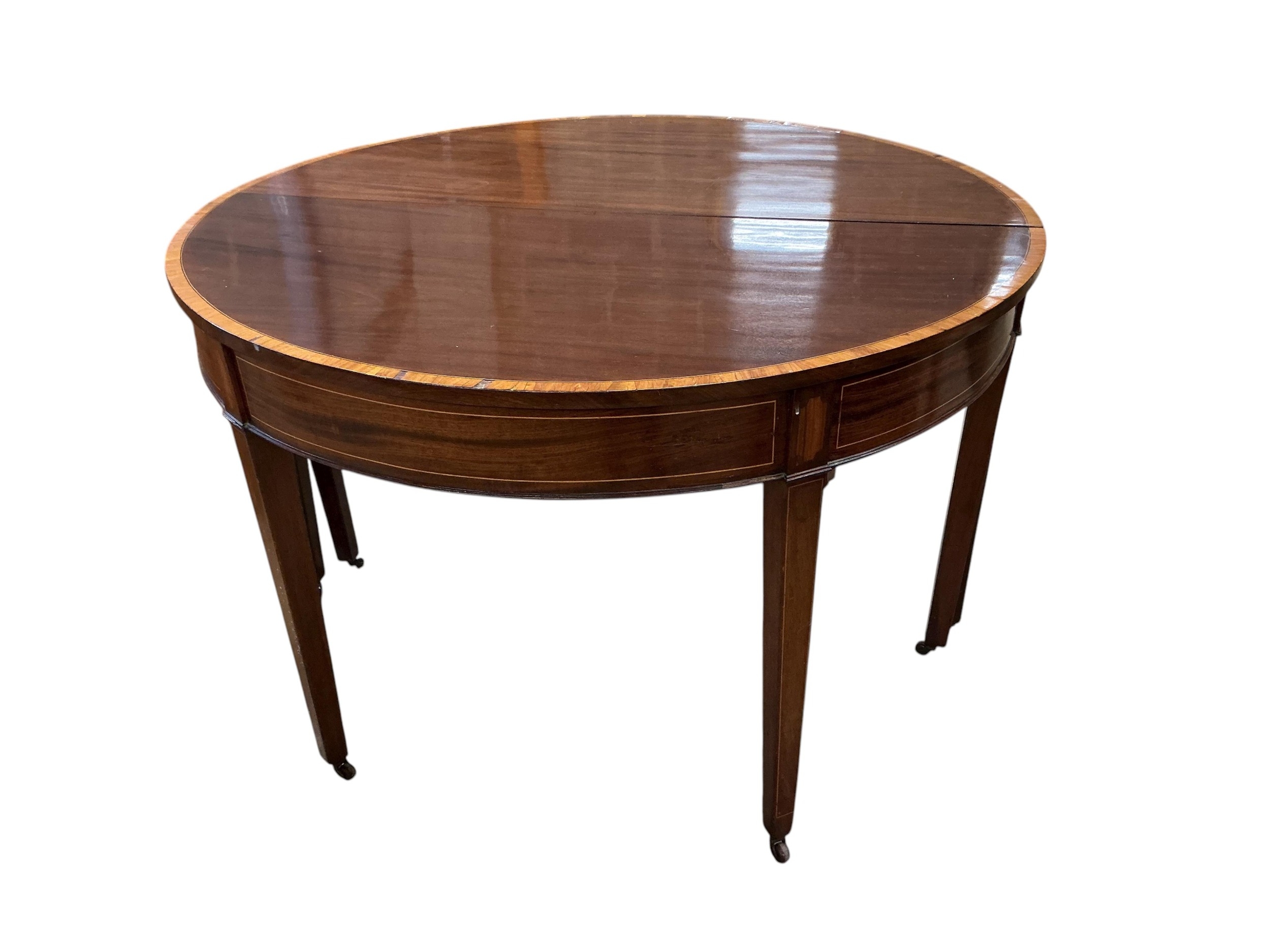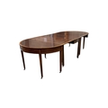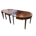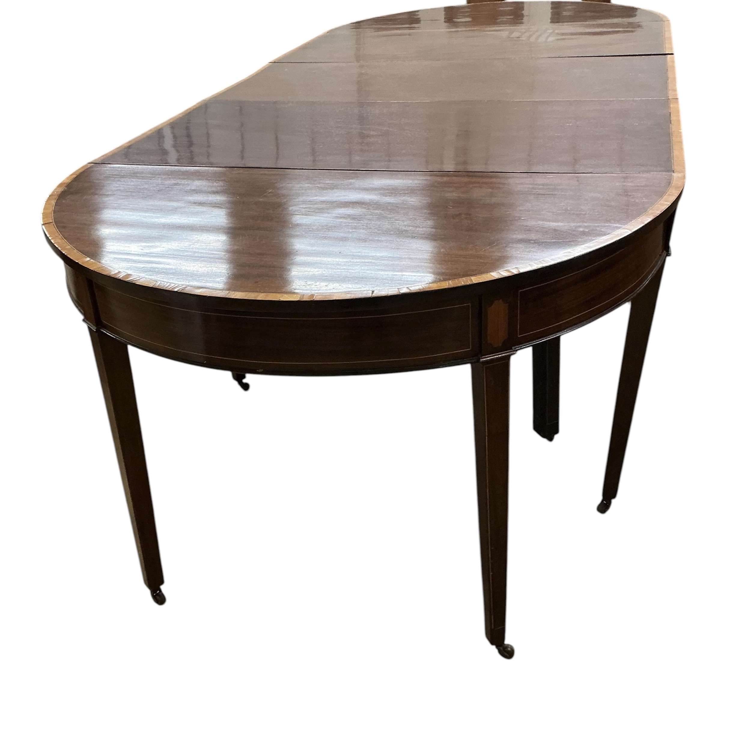 A George III satinwood banded mahogany D end extending dining table, with two spare leaves, 284cm extended, depth 120cm, height 74cm, together with a set of eight Victorian mahogany balloon back dining chairs