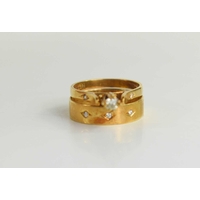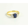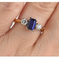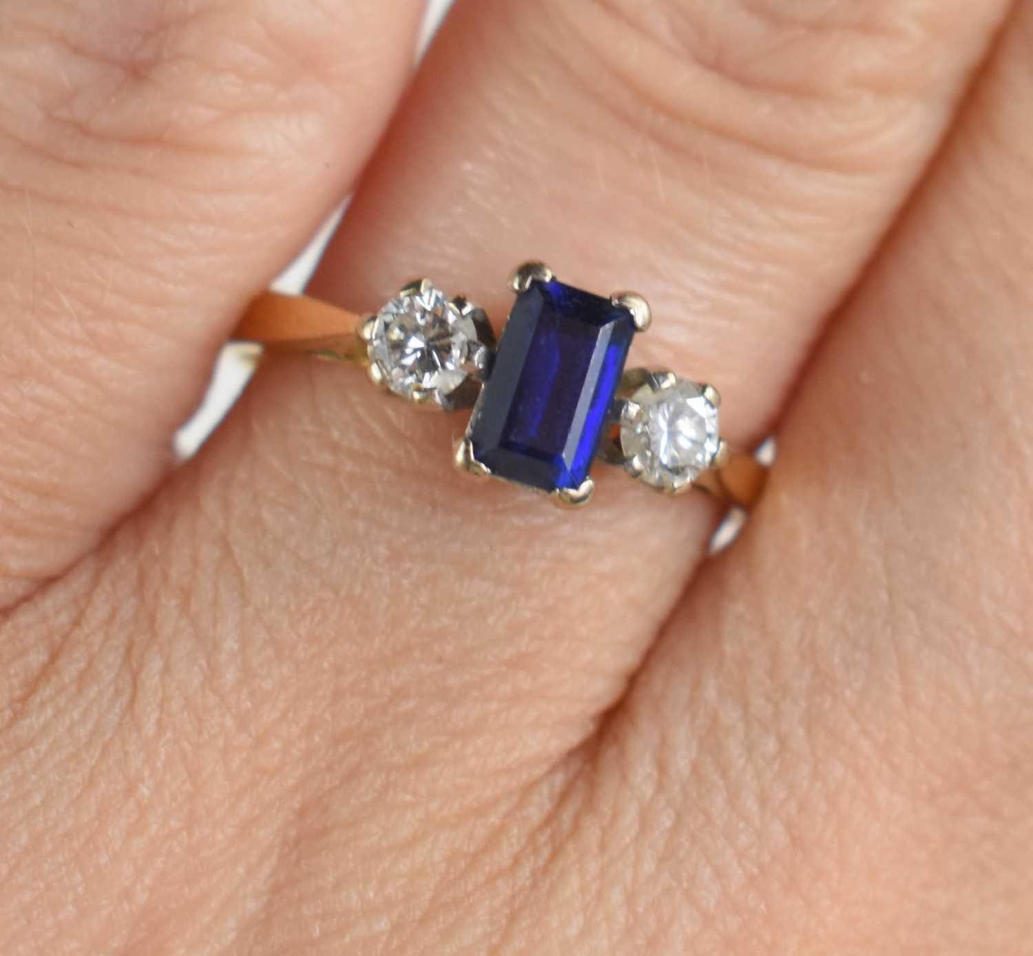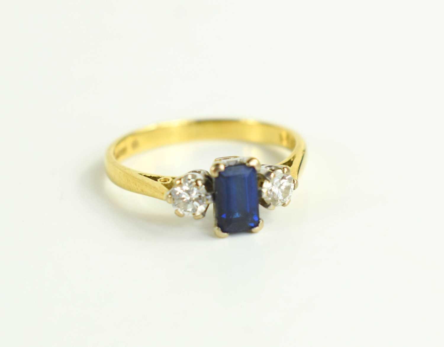 An 18ct gold, cornflower blue sapphire and diamond ring, the baguette cut sapphire 5mm by 4mm, flanked by two brilliant cut diamonds, size P/Q, 3.5g.