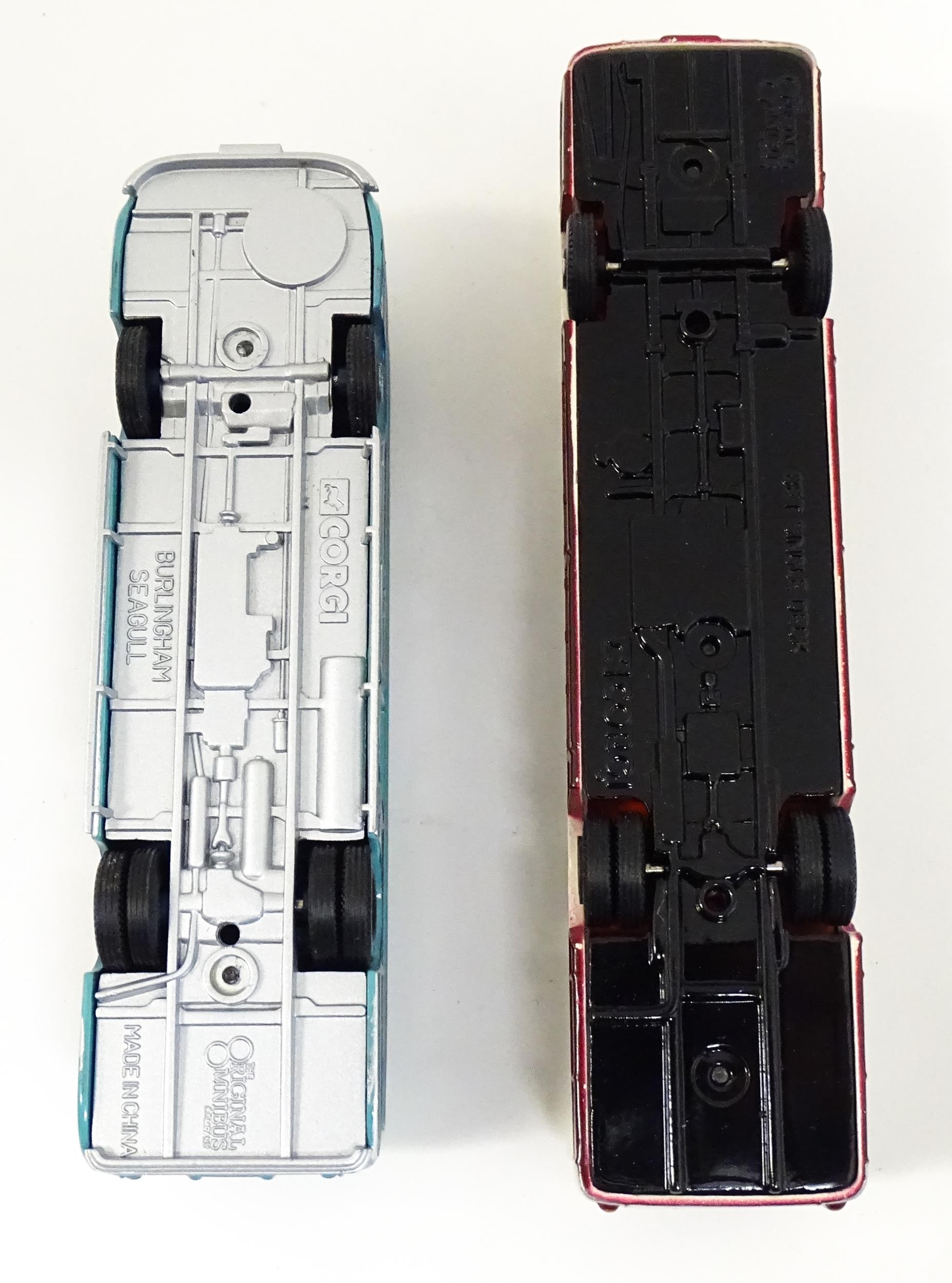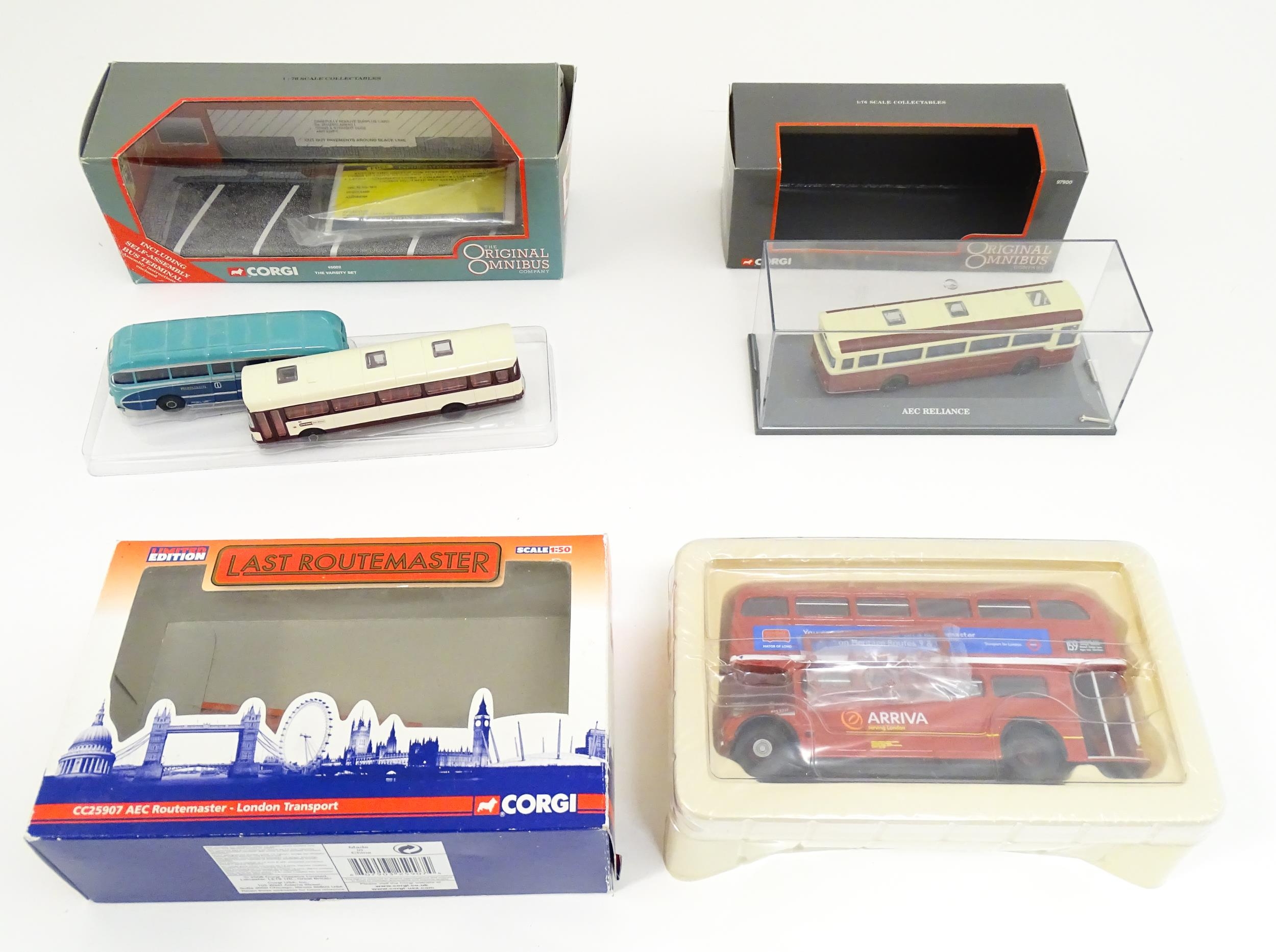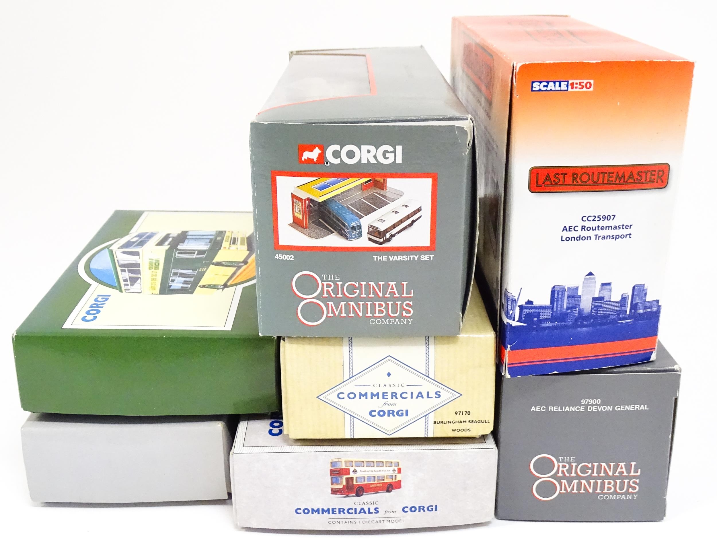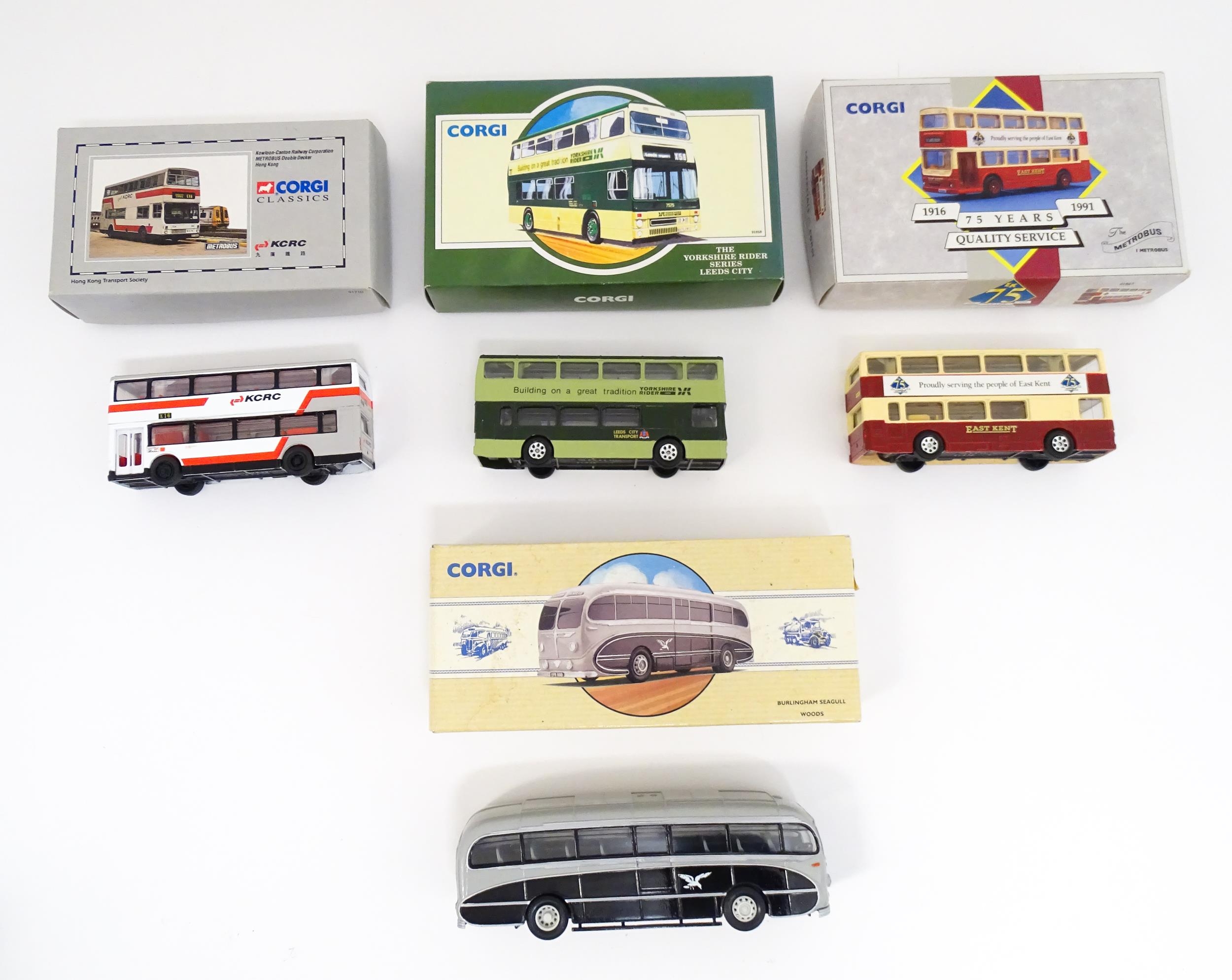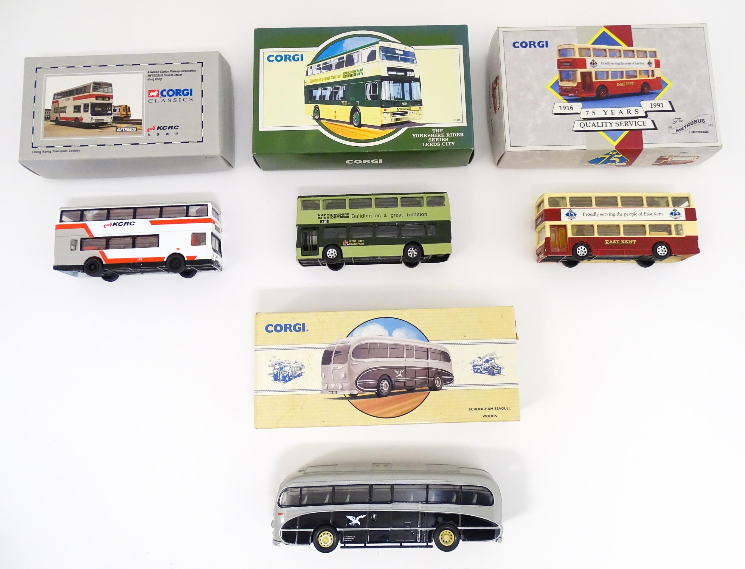 Toys: A quantity of boxed Corgi Toys die cast scale model buses / coaches comprising Corgi Classics Kowloon-Canton Railway Corporation Metrobus Double Decker Hong Kong, Burlingham Seagull Woods, 1916-1991 75 Years Service The Metrobus, The Varsity Set, AEC Routemaster, Yorkshire Rider, and AEC Reliance Devon General. (7)