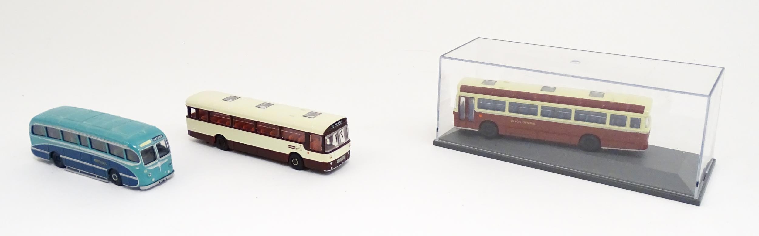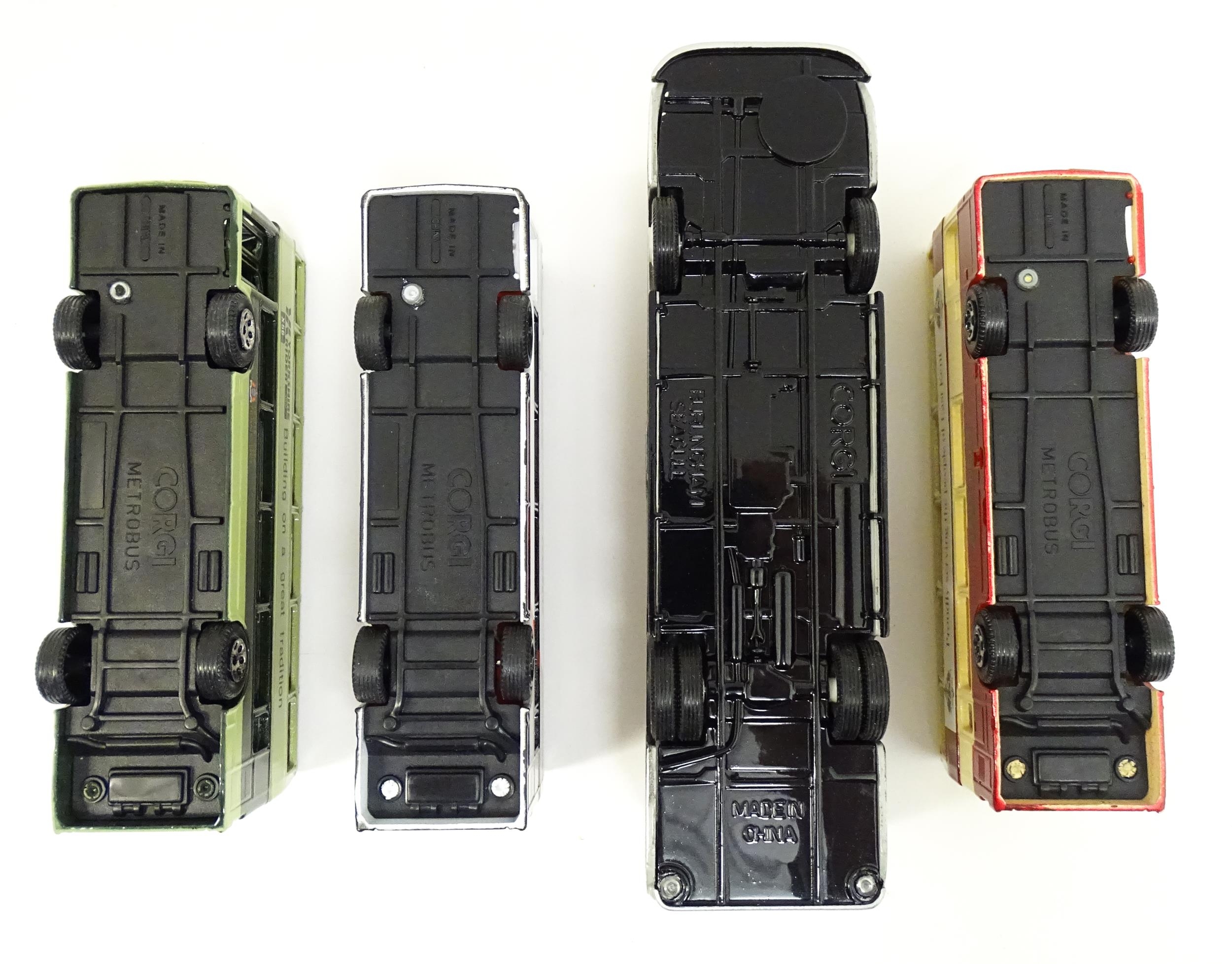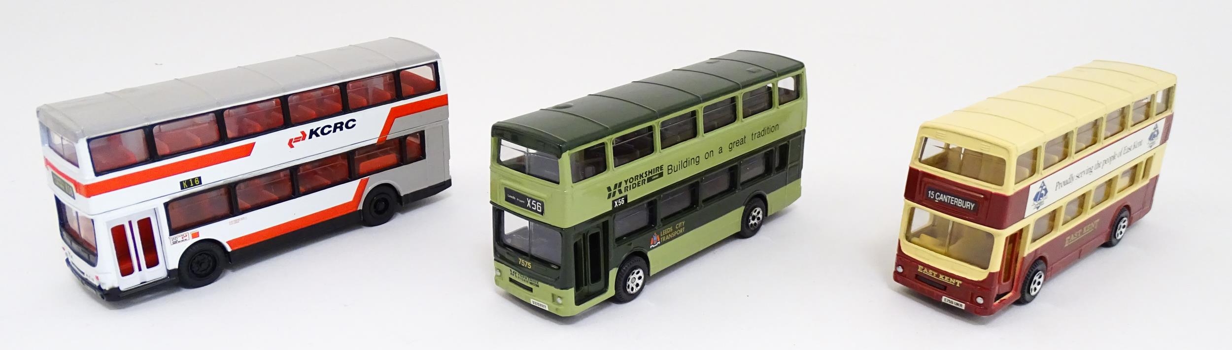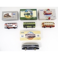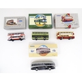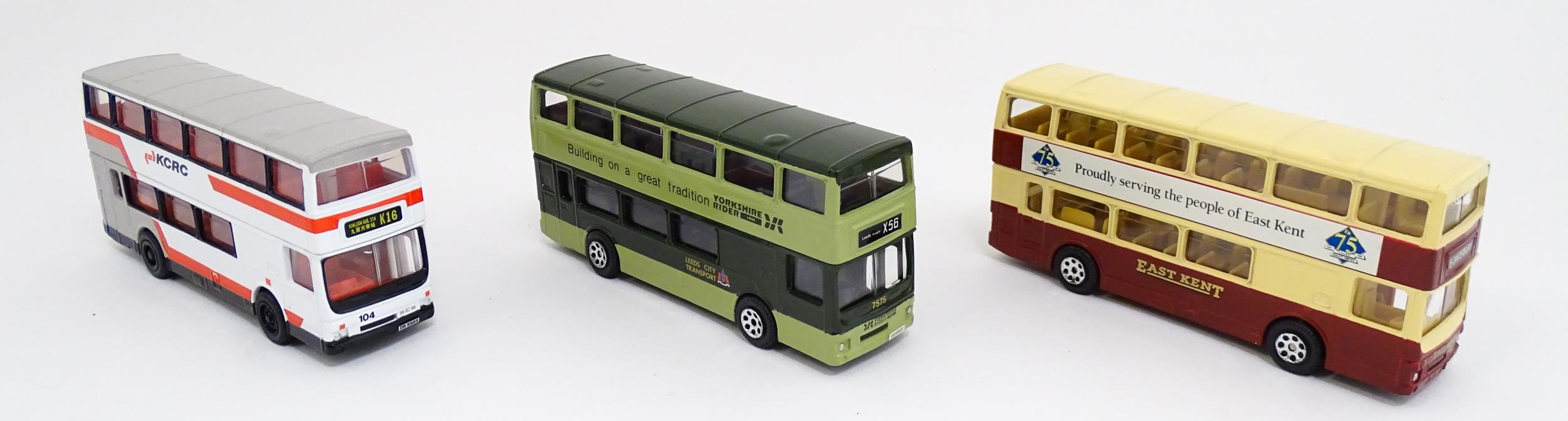 Toys: A quantity of boxed Corgi Toys die cast scale model buses / coaches comprising Corgi Classics Kowloon-Canton Railway Corporation Metrobus Double Decker Hong Kong, Burlingham Seagull Woods, 1916-1991 75 Years Service The Metrobus, The Varsity Set, AEC Routemaster, Yorkshire Rider, and AEC Reliance Devon General. (7)