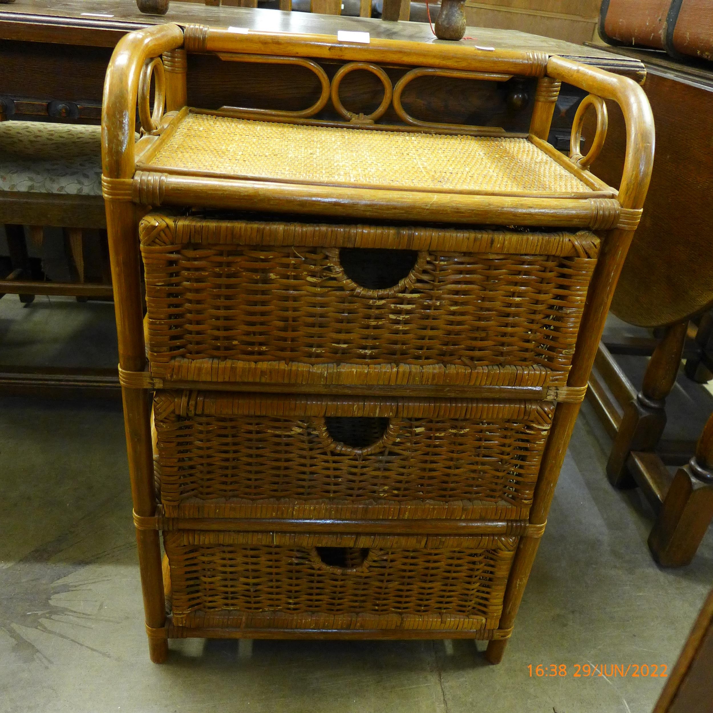 A bamboo and wicker chest of drawers