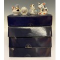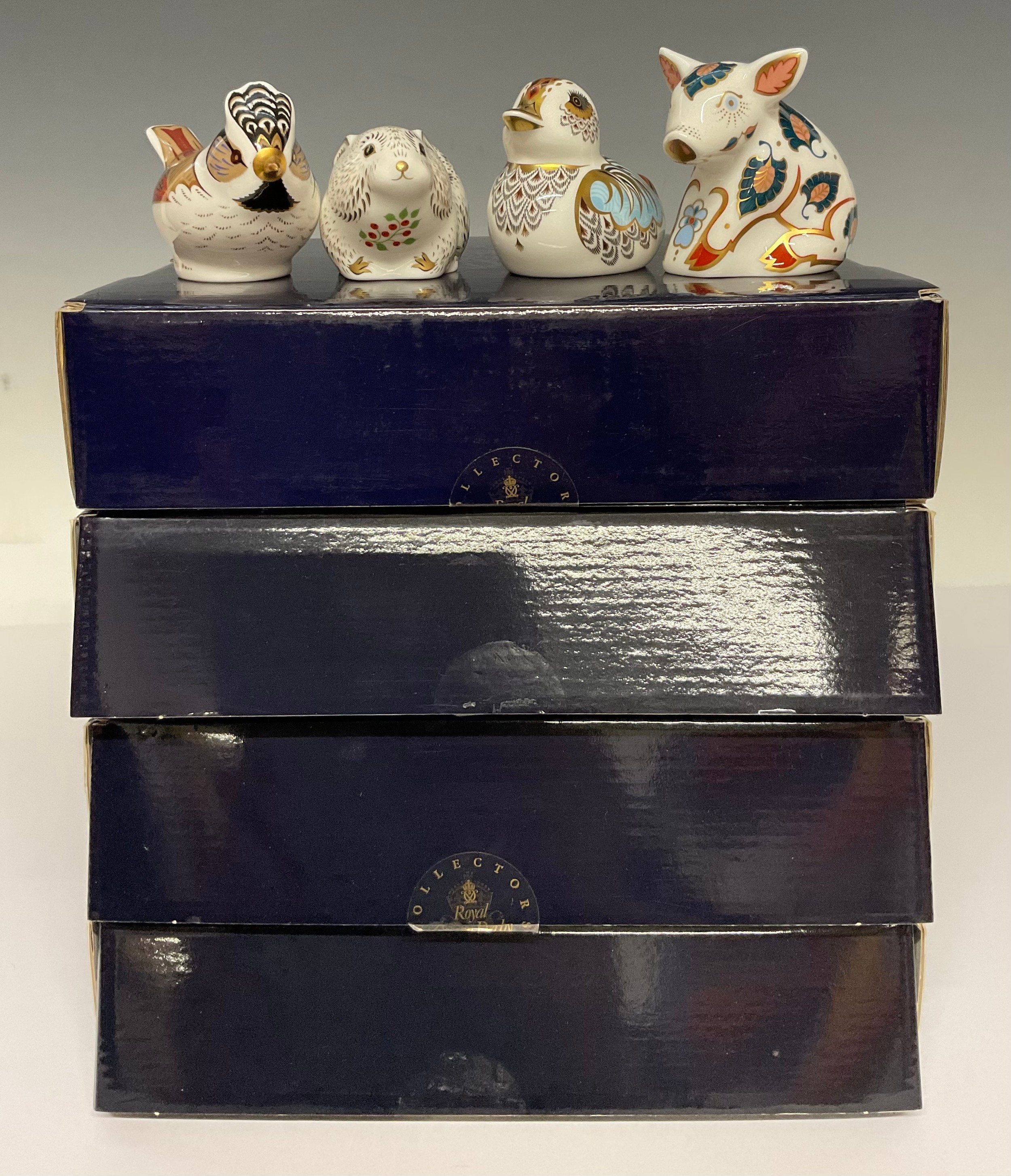 A Royal Crown Derby paperweight, Snuffle Piglet, Collector's Society Member's Pack exclusive, 6cm high, gold stopper, presentation box; other similar Collector's Guild member's packs, Duckling, gold stopper, 5.5cm, boxed; Crested Tit, gold stopper, 9cm long, boxed; River Bank Vole, gold stopper, 4cm, boxed (4)
