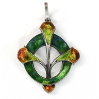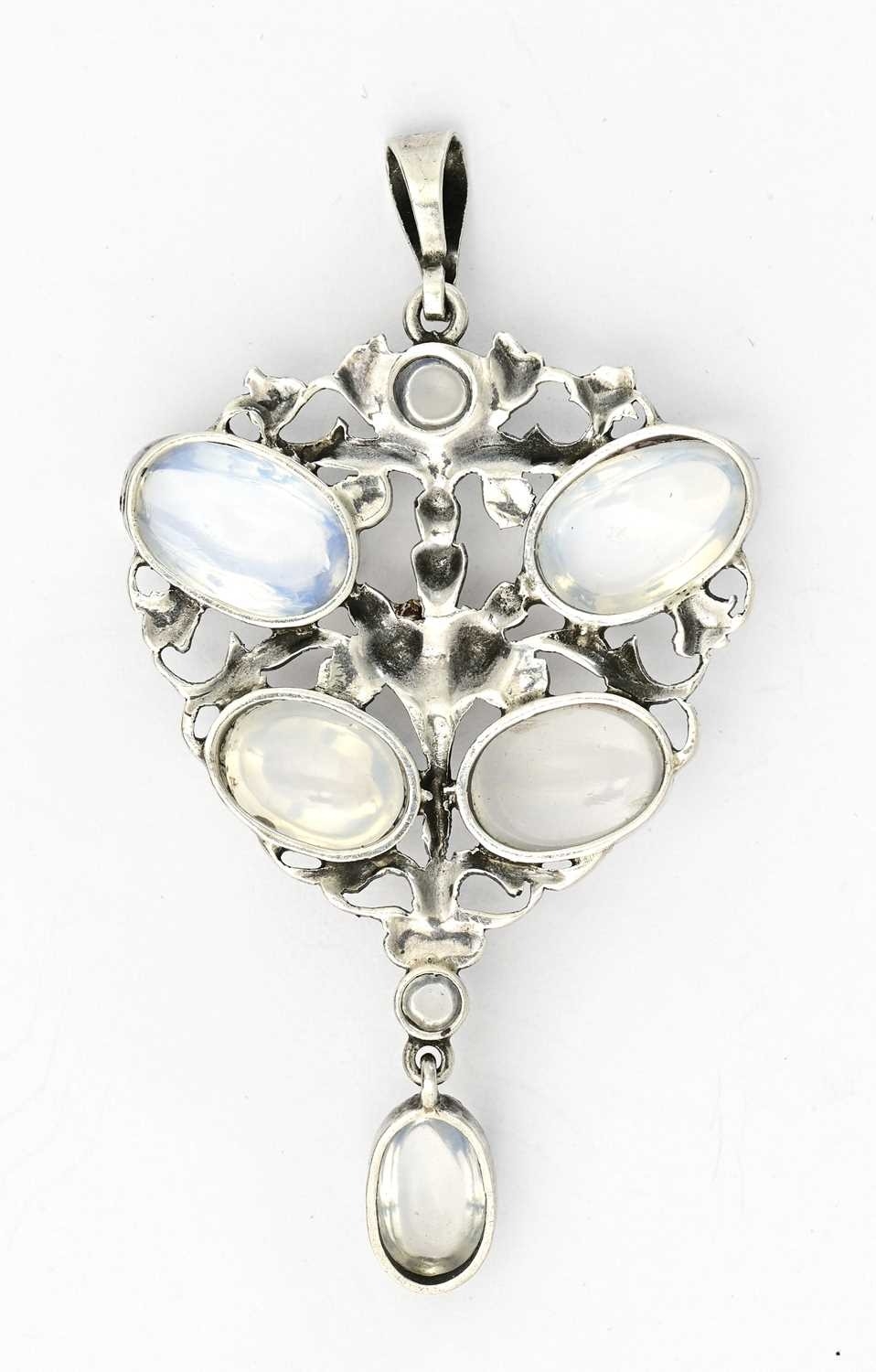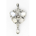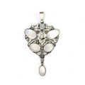 Liberty and Co., a silver and moonstone pendant, circa 1917, cast and reticulated with Renaissance style foliate scrolls and set with graduated cabochons, 5.5cm long, 5.2g Note: illustrated in the 1917 Yuletide catalogue for Liberty