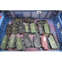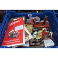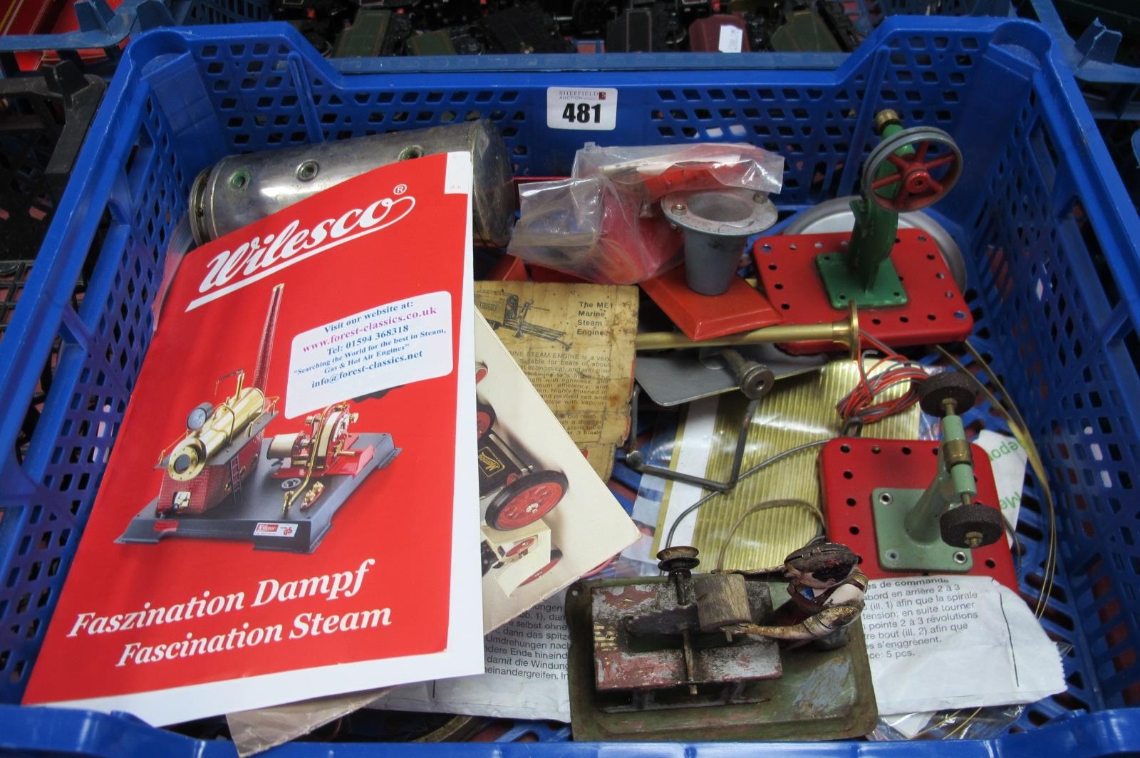 A Collection of Toy Live Steam Accessories and Parts, including Mamod Grinder Stamper, a Pre-War German Love Steam Accessory 'Man with log at Steam Saw', funnels, wires, wheel, lighting, product catalogues.