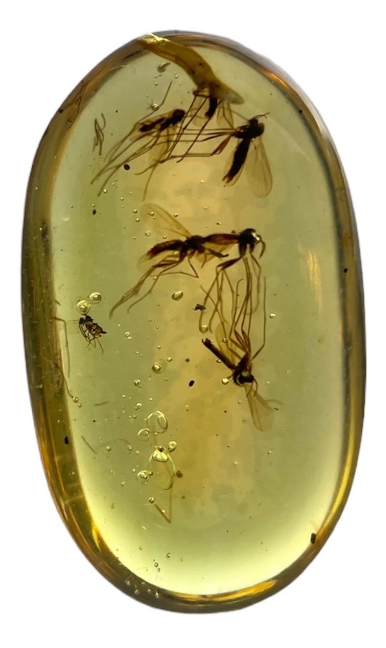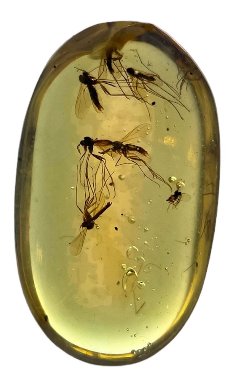 Mosquito swarm in dinosaur-aged Burmese amber. From the mines of Kachin, Myanmar. Cretaceous circa 99 million years ago. A single Mosquito fossil in amber is a rarity, Mosquito remains in amber are uncommon compared to fungus gnats. To have a swarm is highly unusual.