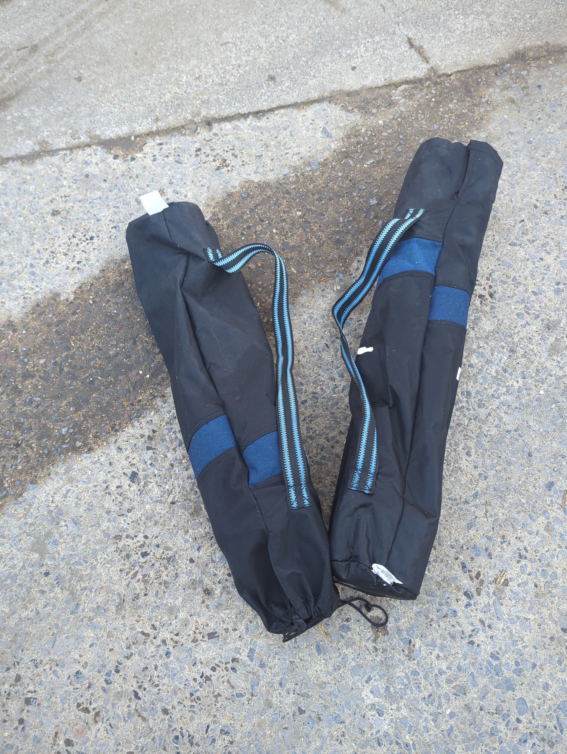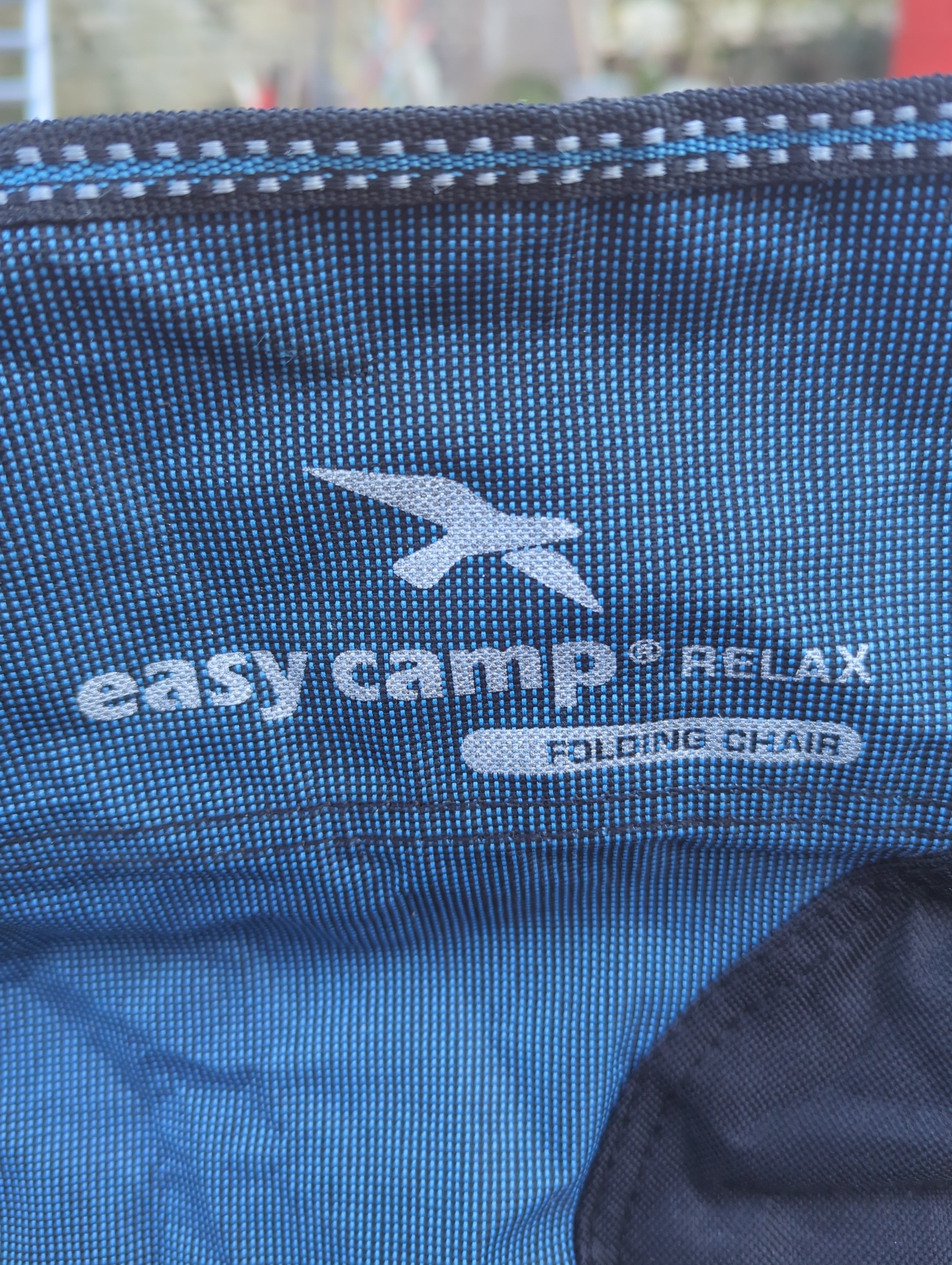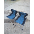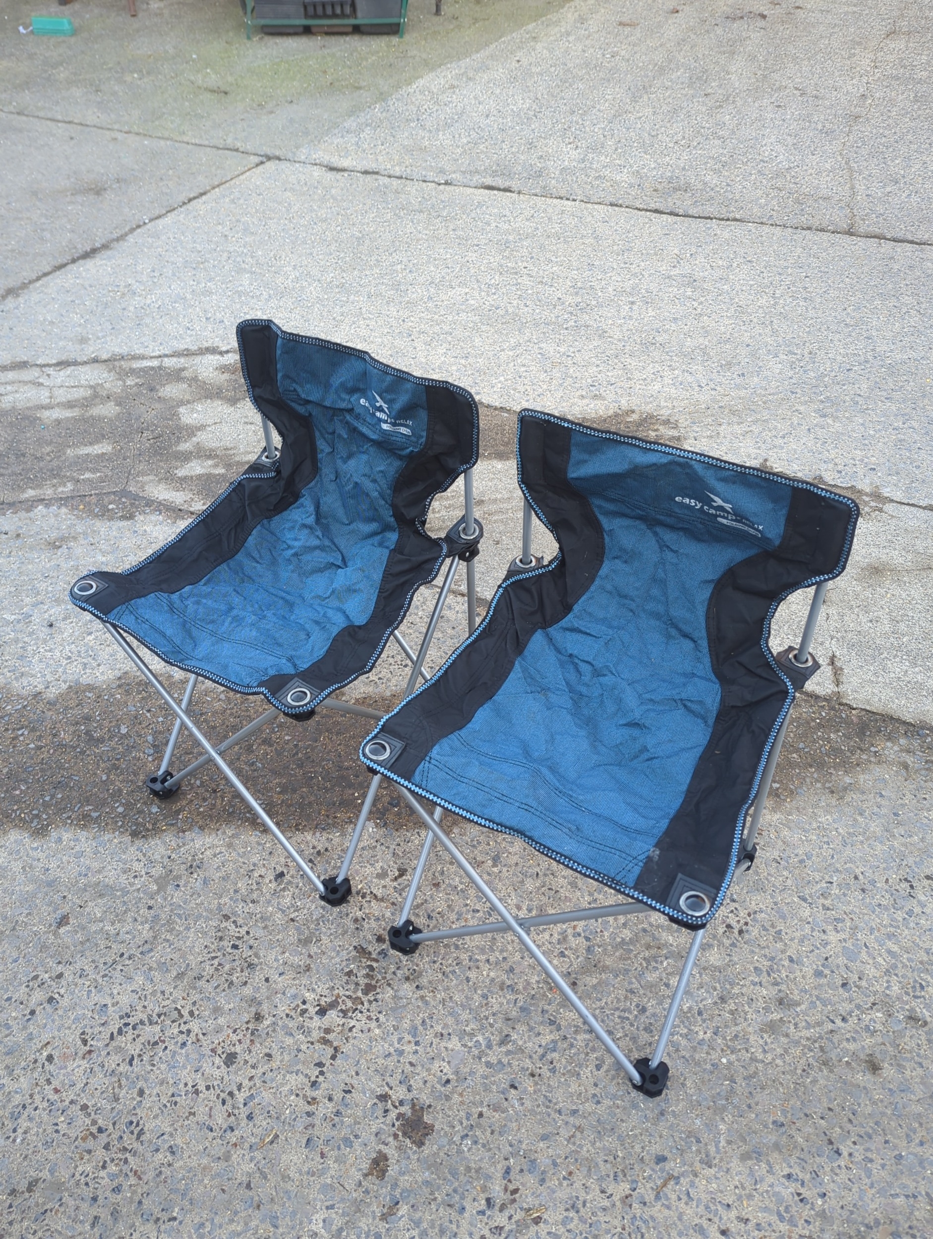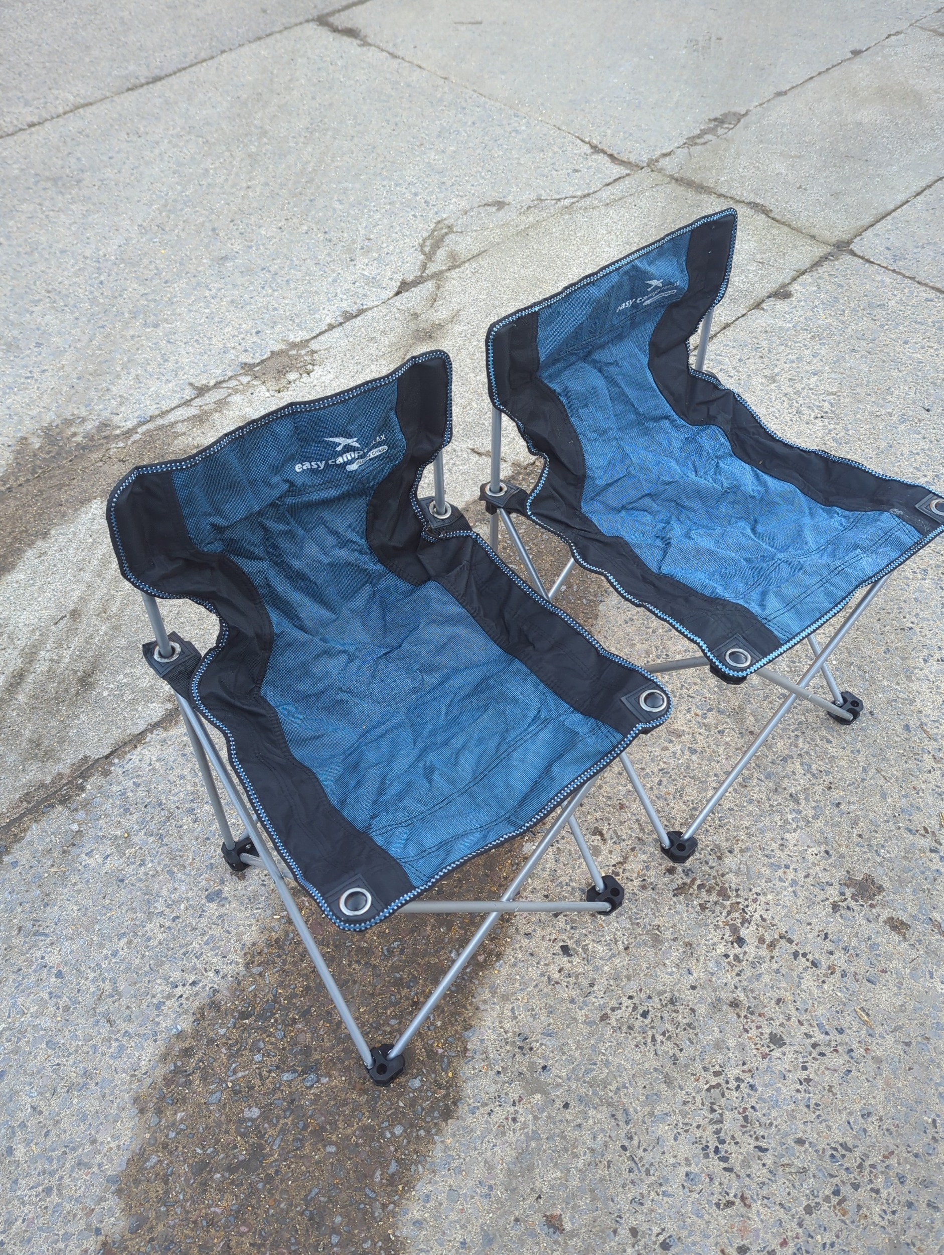 This lot includes two Easy Camp Relax folding chairs, designed for outdoor use. The chairs feature a sturdy metal frame with durable blue fabric seating. Each chair comes with a matching carry bag, making them convenient for camping or outdoor events. The compact design allows for easy portability and storage.