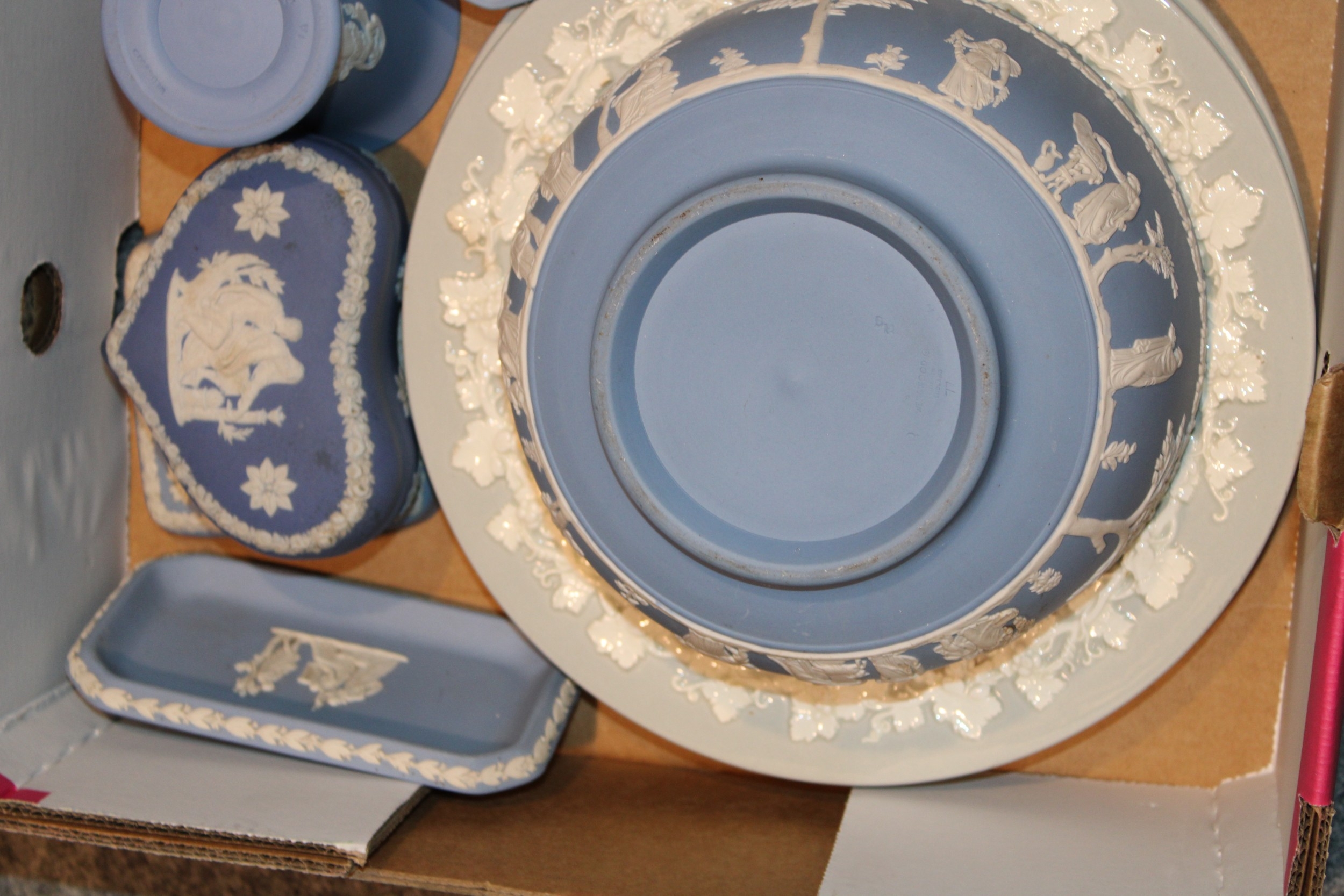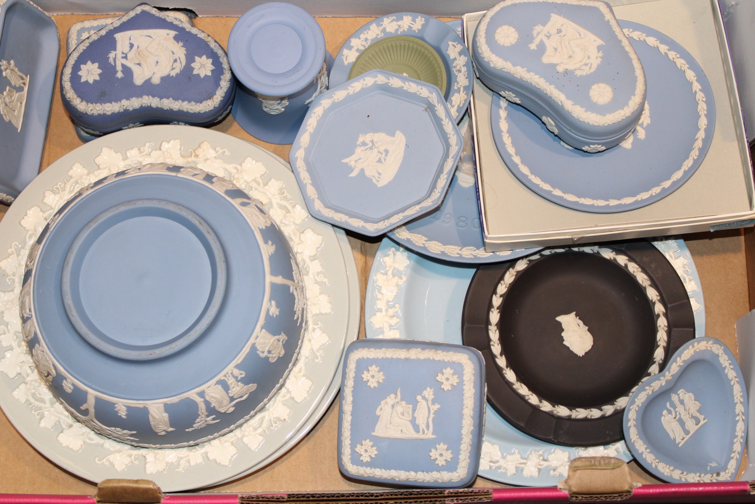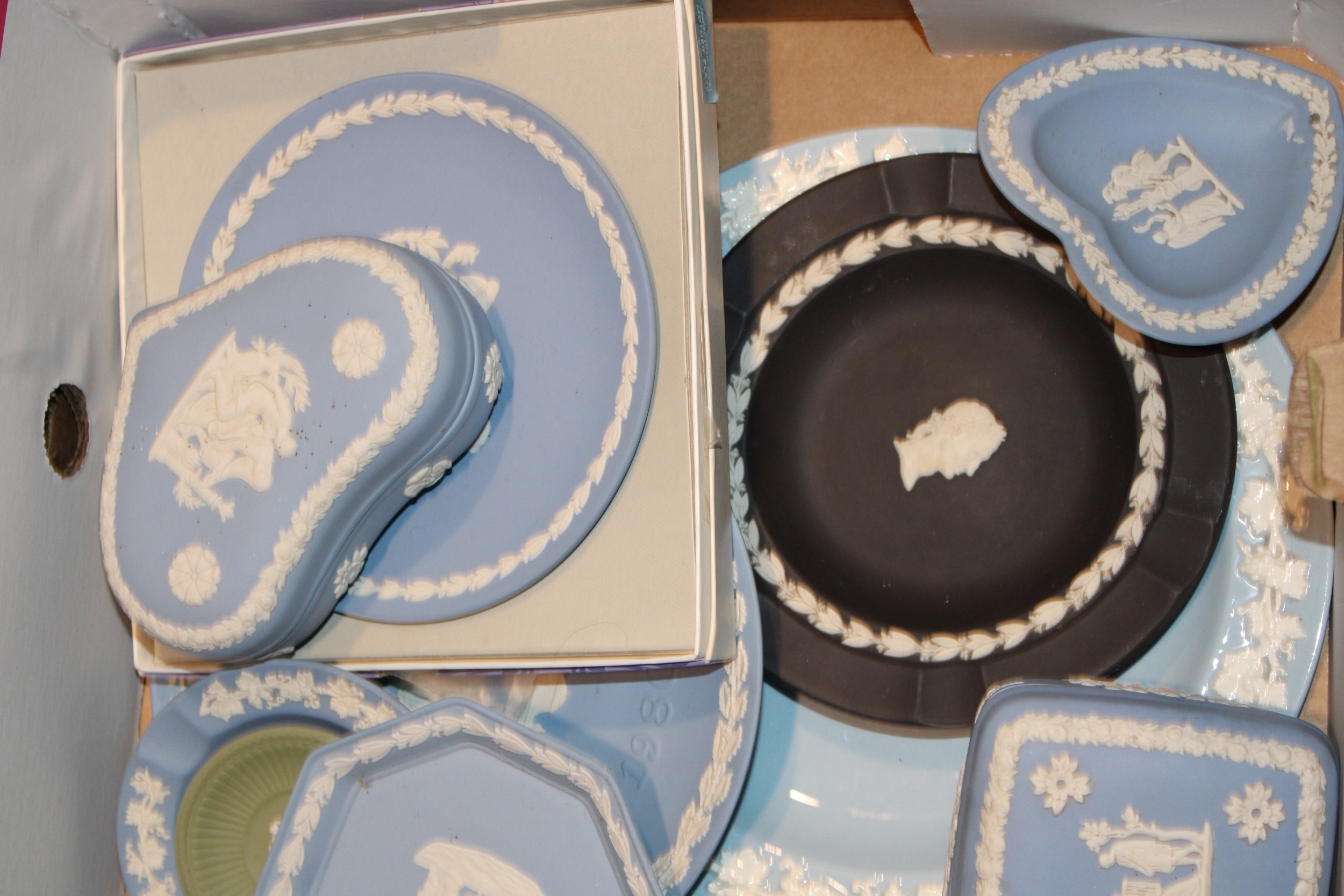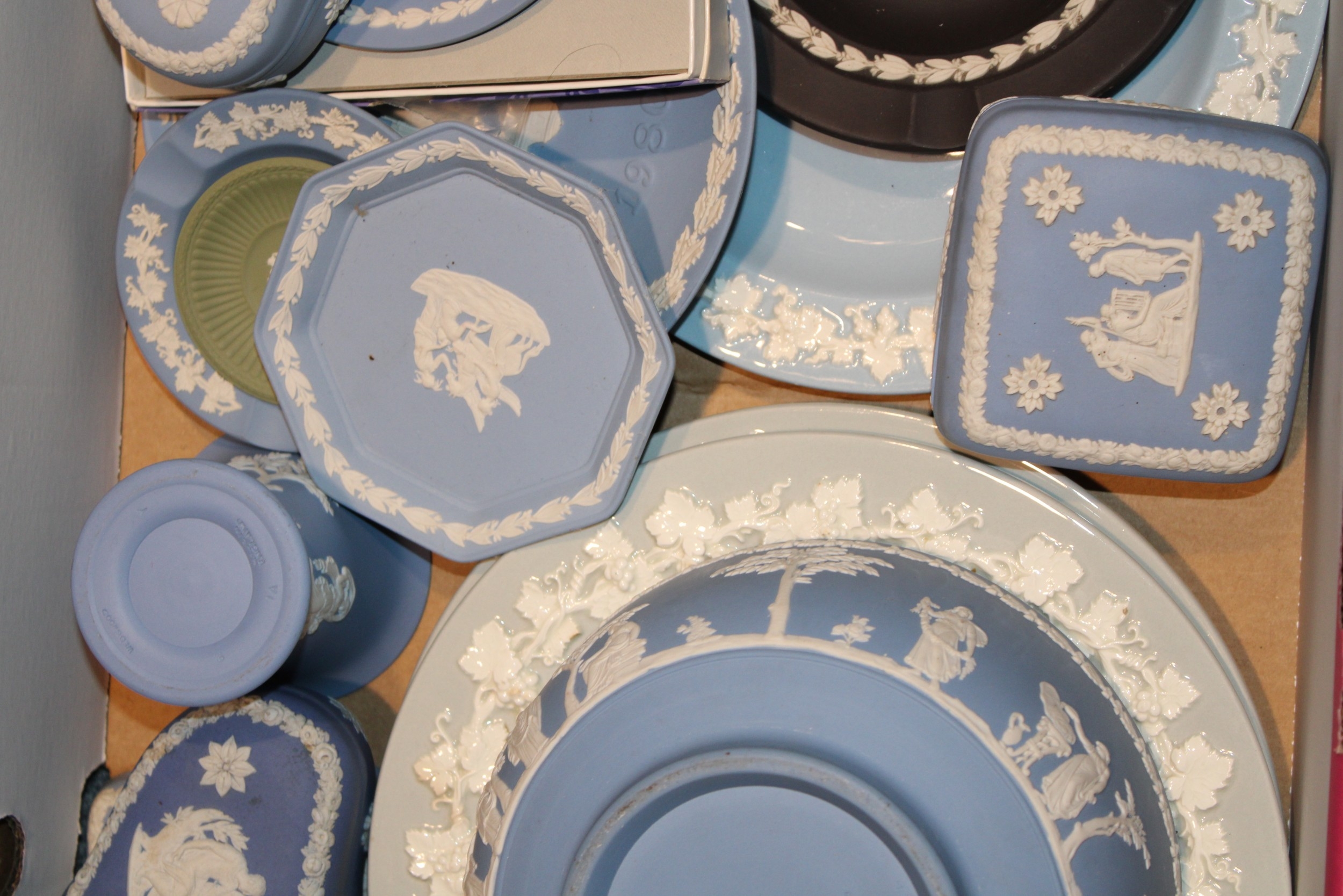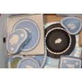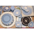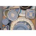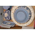 A mixed collection of Wedgwood Jasperware and Queensware items to include, 8" Jasperware sacrifice bowl, Queensware plates and other similar items in blue, blue dip, sage green and grey, (Qty).