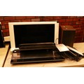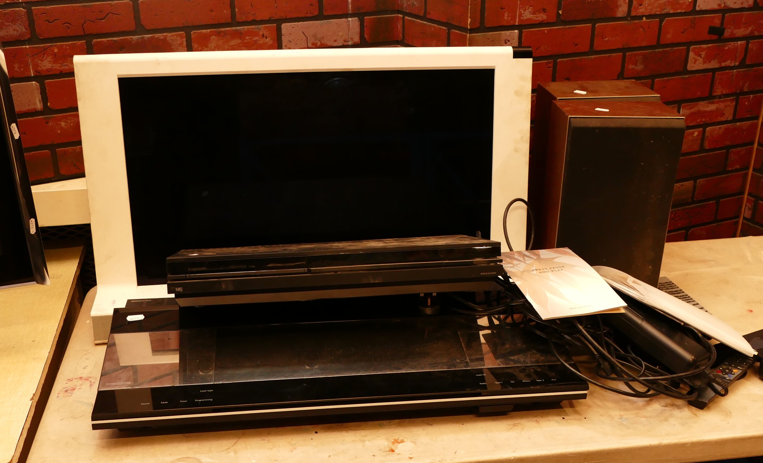 Bang & Olufsen; Beovision 8 TV, 32 inch screen, having booklet and remote, together with a Beocenter 9500, a VHS recorder, and a pair of Beovox S22 shelf speakers.