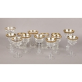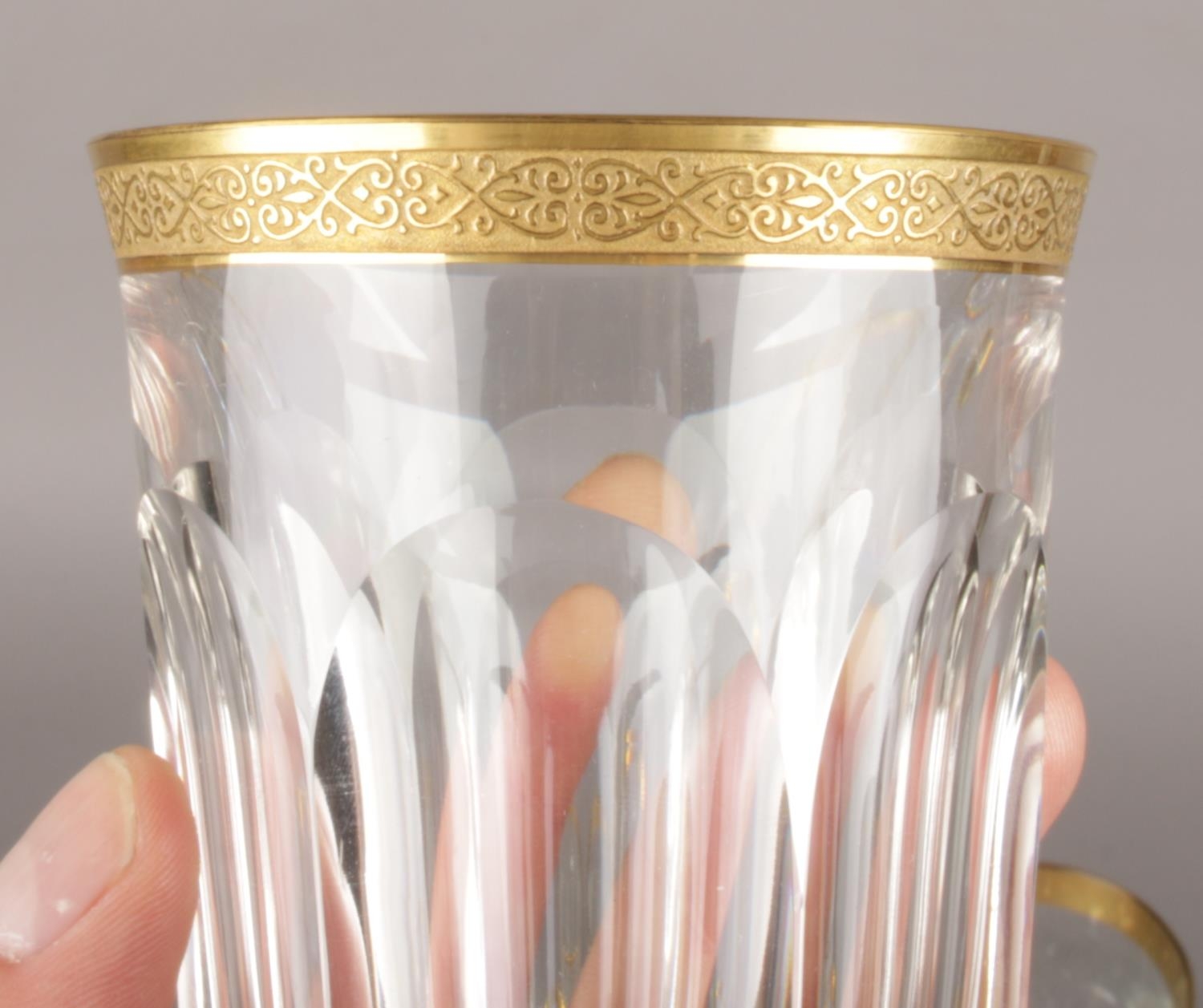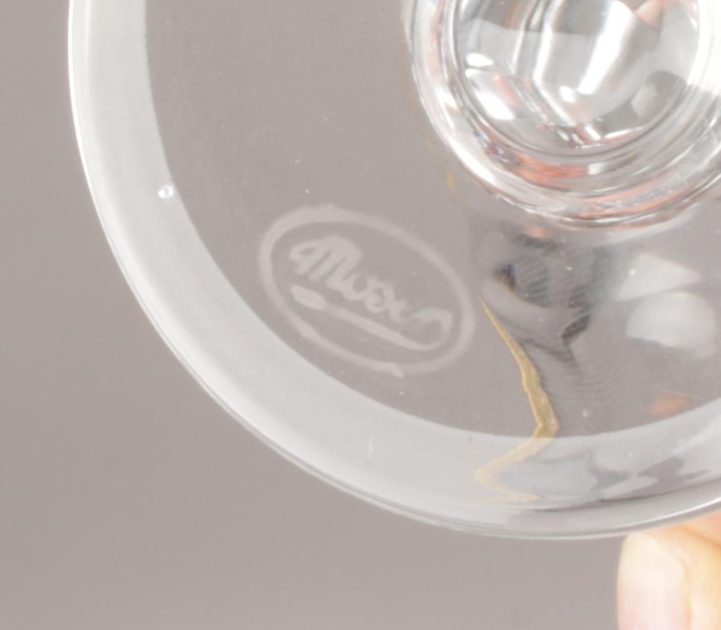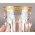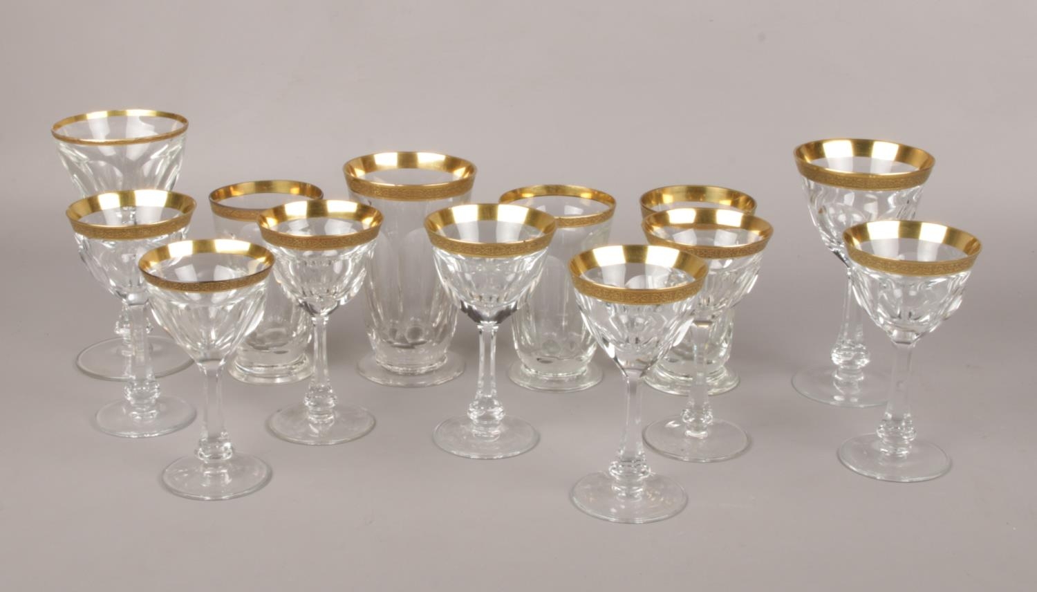 A mixed suite of Moser crystal glassware in the Lady Hamilton pattern. With etched gold borders and flat cut decoration. Comprising four beakers, six liqueur glasses and a pair of wine glasses. Acid etched marks.