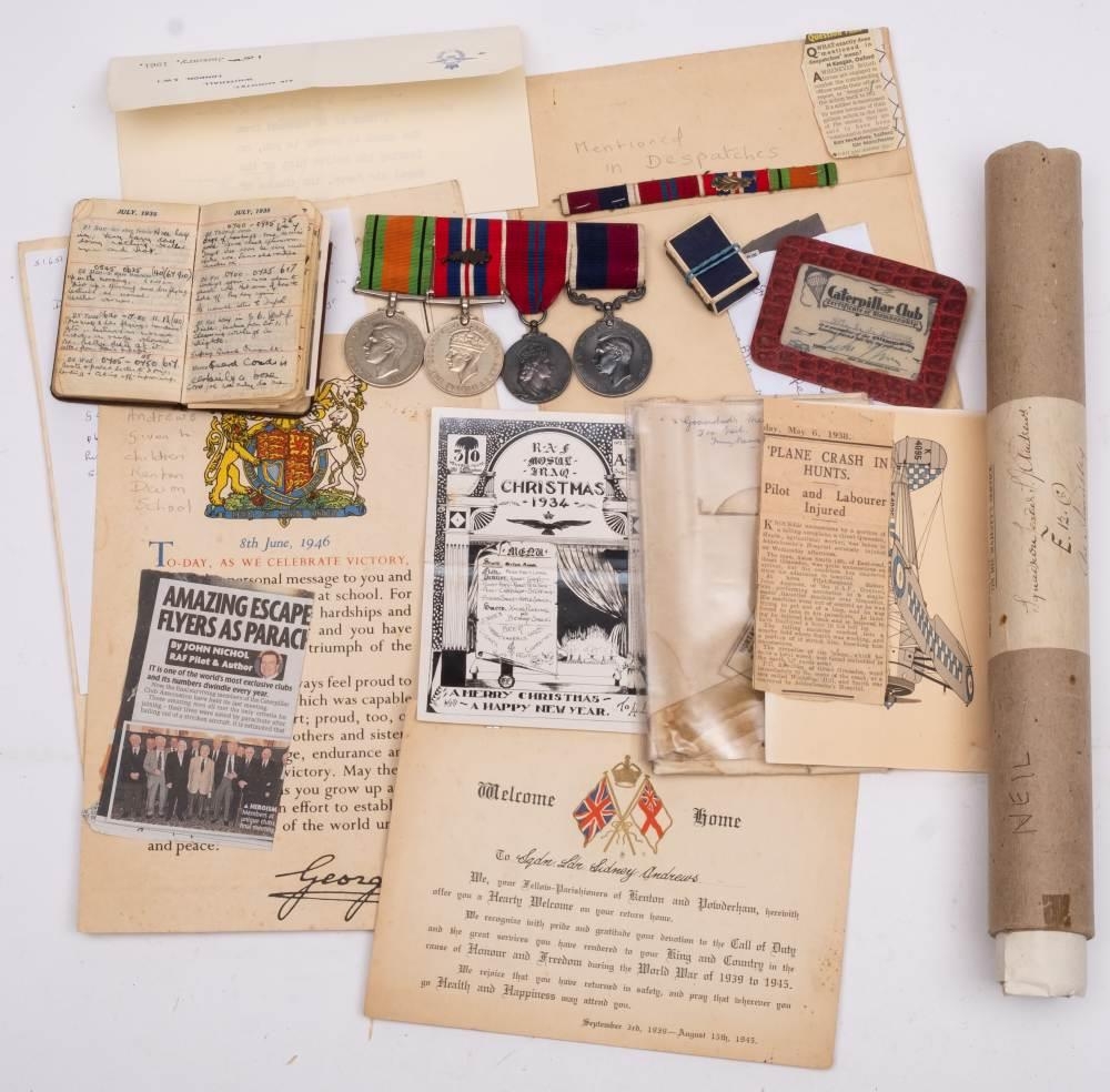 A WWII group of four to SGT. S. J Andrews RAF: Defence medal, War medal, 1953 Coronation medal and RAF LSGC, together with gold Caterpillar Club badge and membership certificate, diary and related ephemera. *Notes - SJT Andrews became a member of the Caterpillar Club on May 4th 1938 whilst attempting a loop in a Gloster Gauntlet.