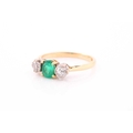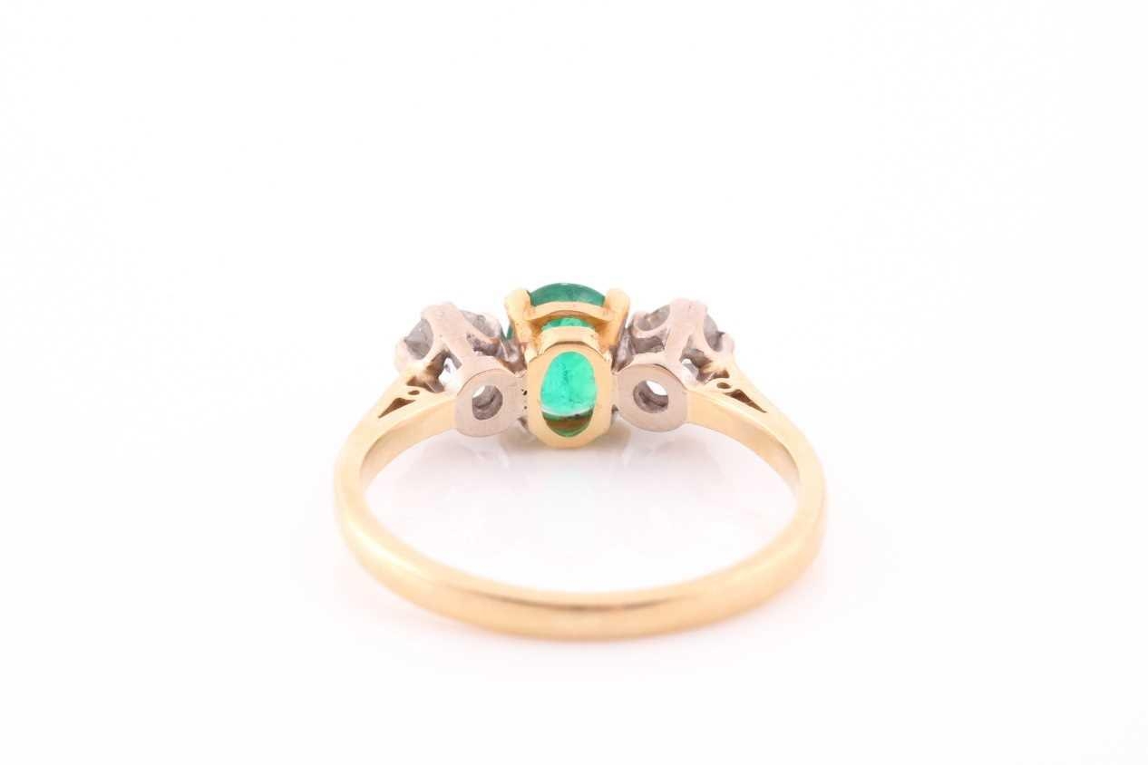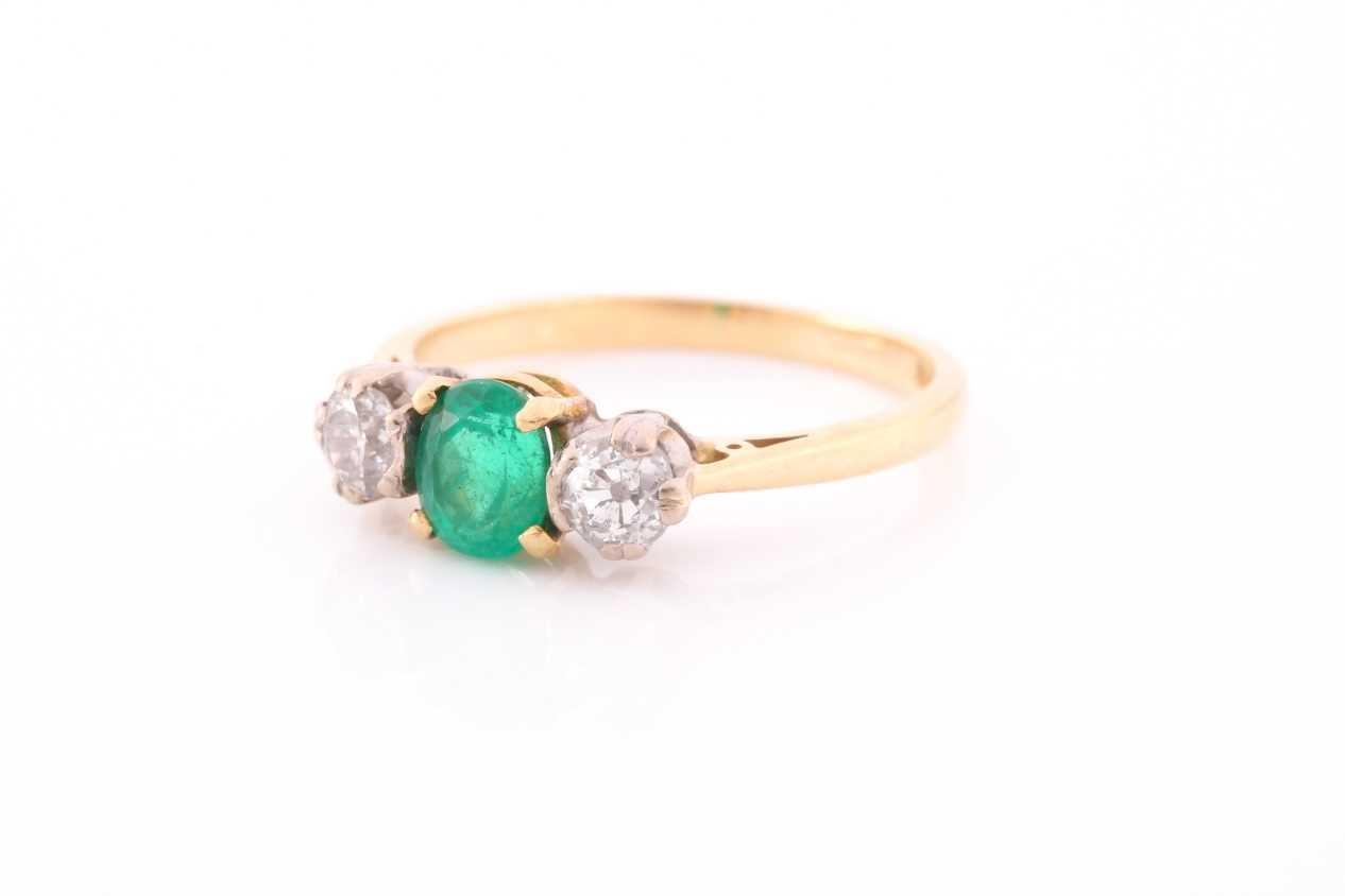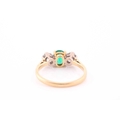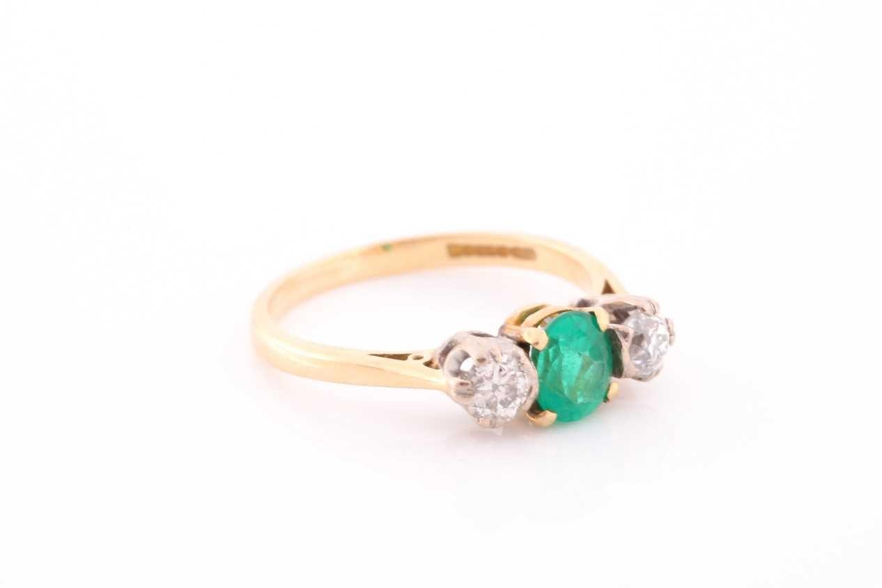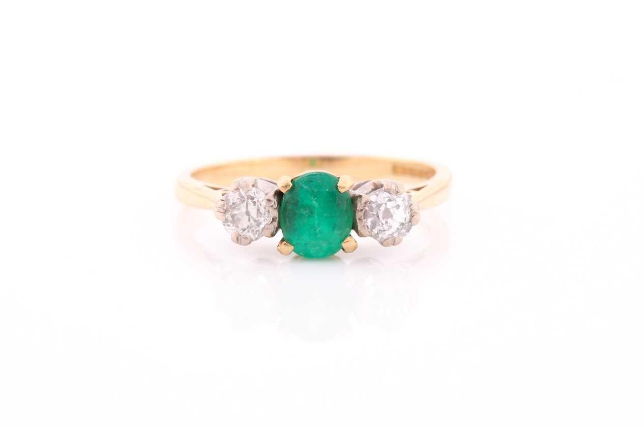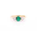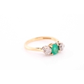 A three stone half hoop emerald and diamond ring. The oval cut emerald in four claw mount flanked by two old round brilliant cur diamonds, to a plain 18 carat gold shank. 3.2 grams; size O. Can be resized.