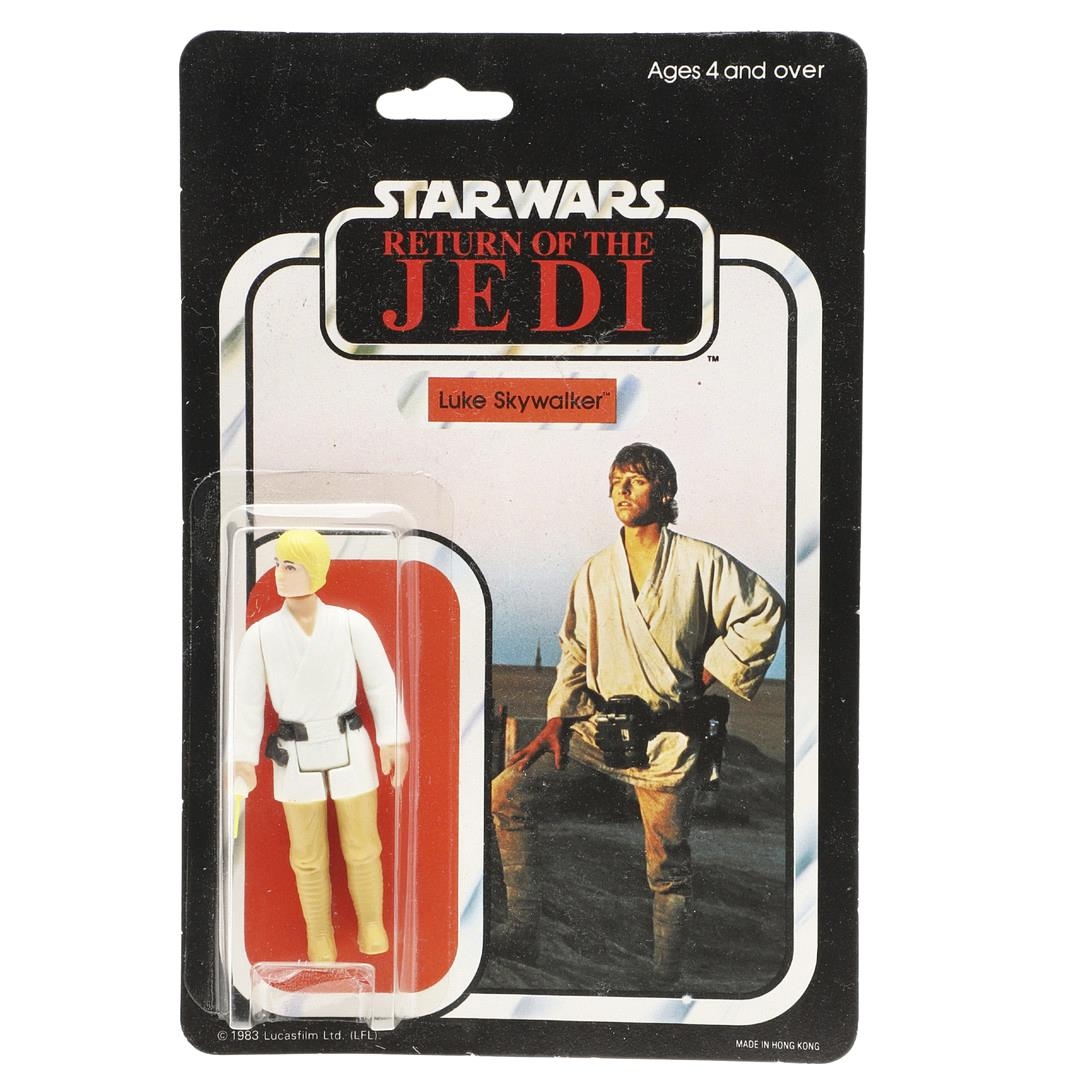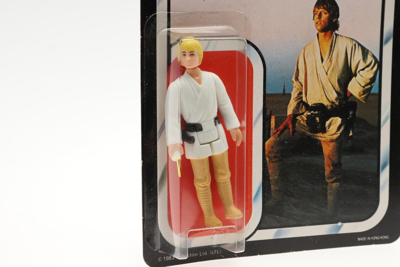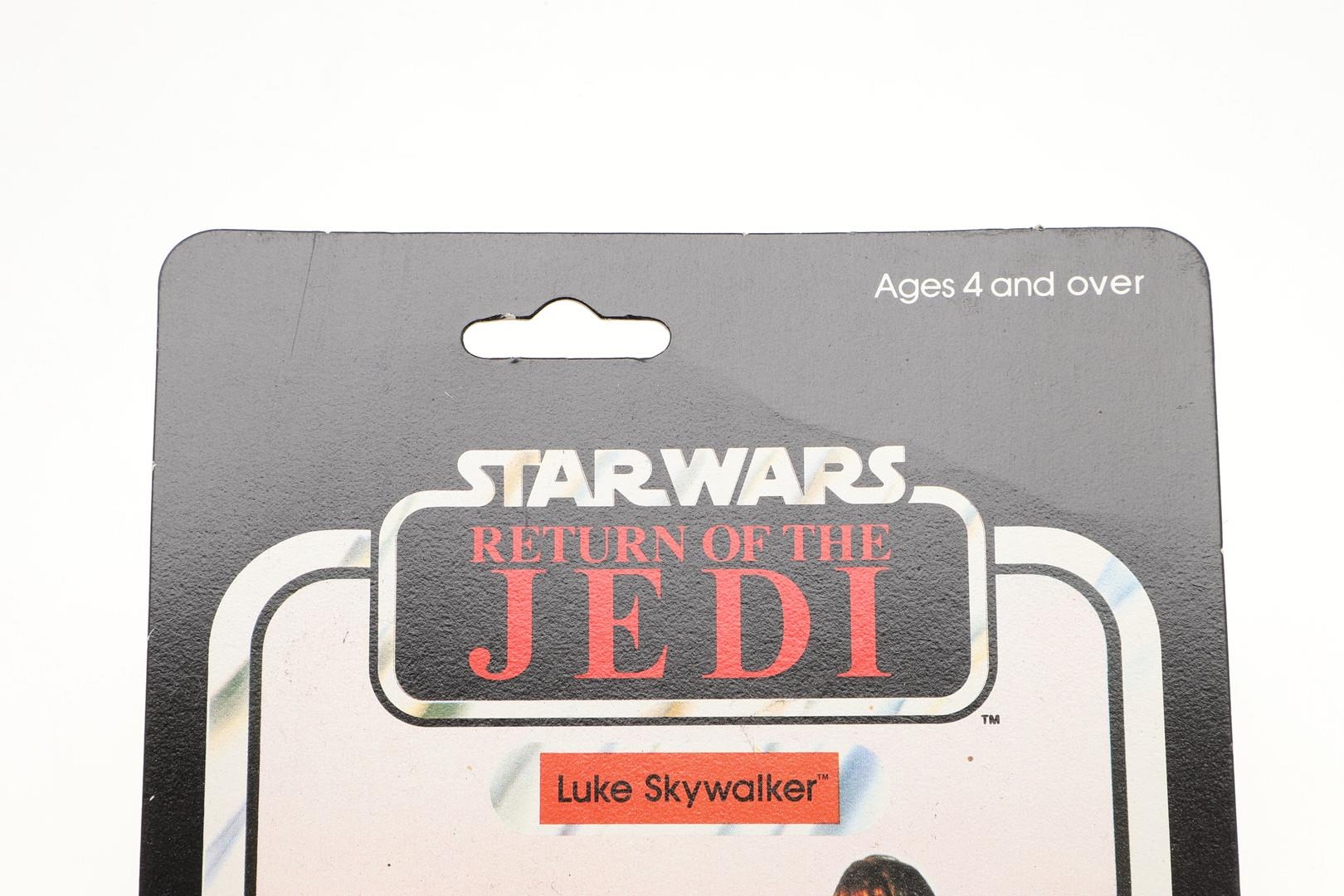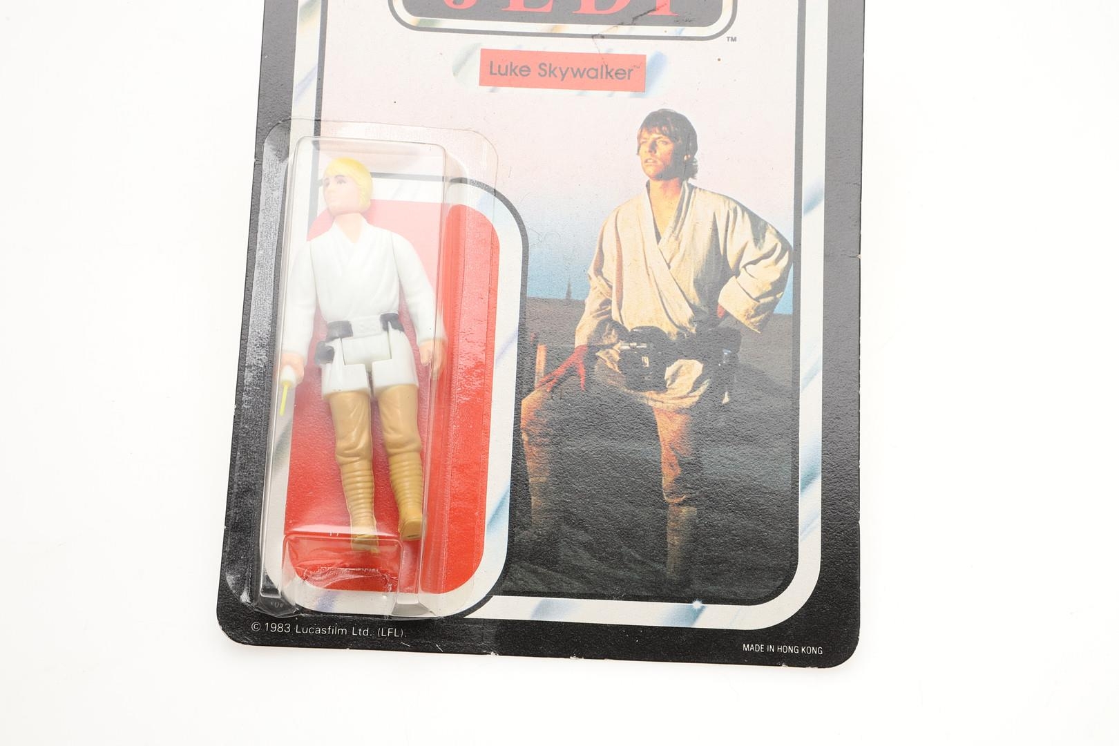 STAR WARS CARDED FIGURE BY PALITOY - LUKE SKYWALKER. A carded MOC Return of the Jedi figure of Luke Skywalker, with a punched 65 back and made in 1983 by Palitoy. *CR Generally good condition, a crease to the card at the top above the writing which runs across, touch of wear to the edges of the card.