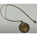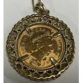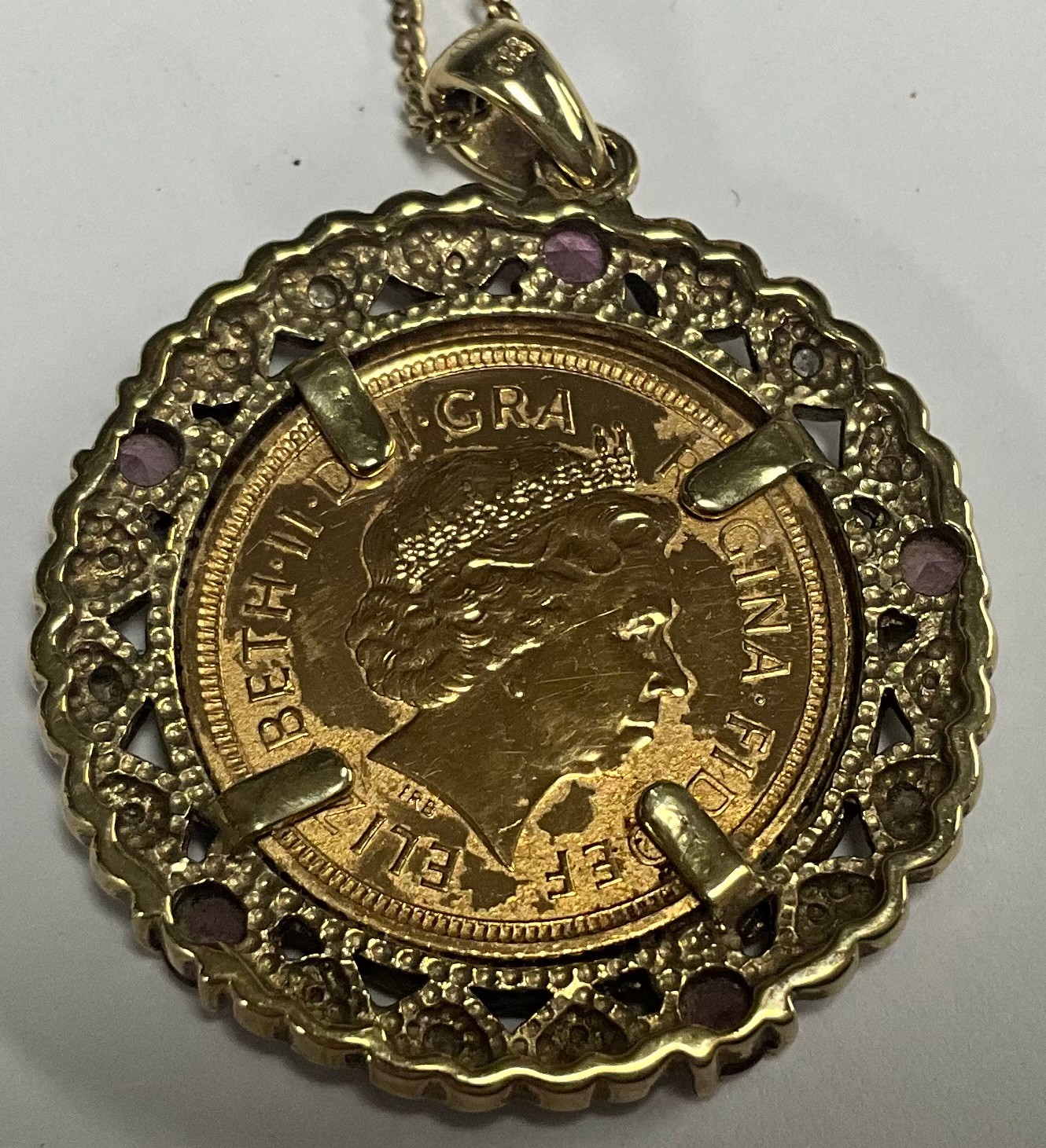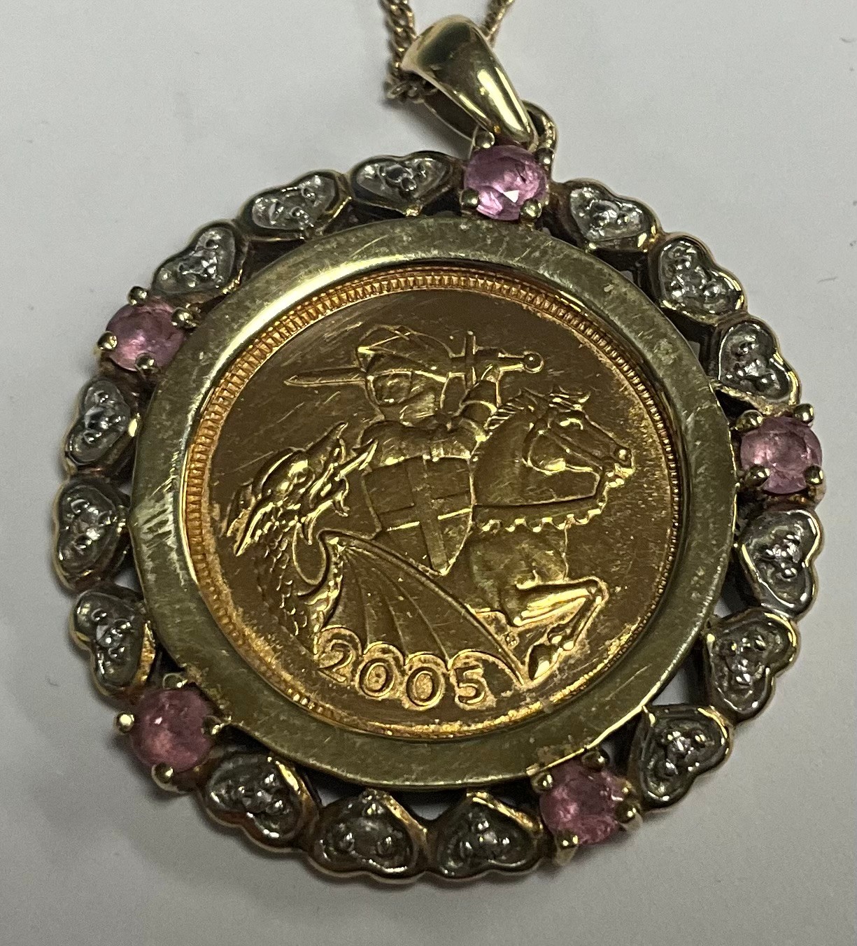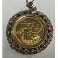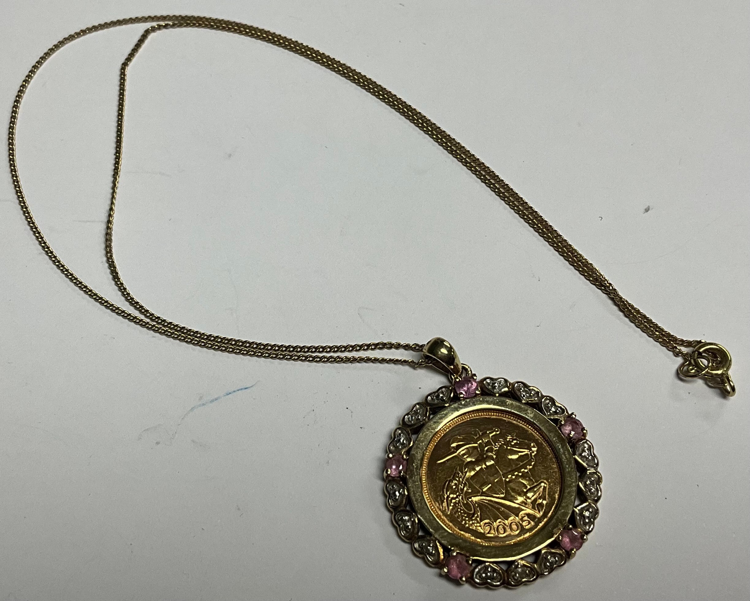 A half soverign, 2005, in mount set with diamond chips and pink stones, 9ct gold chain, 10.9g gross