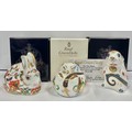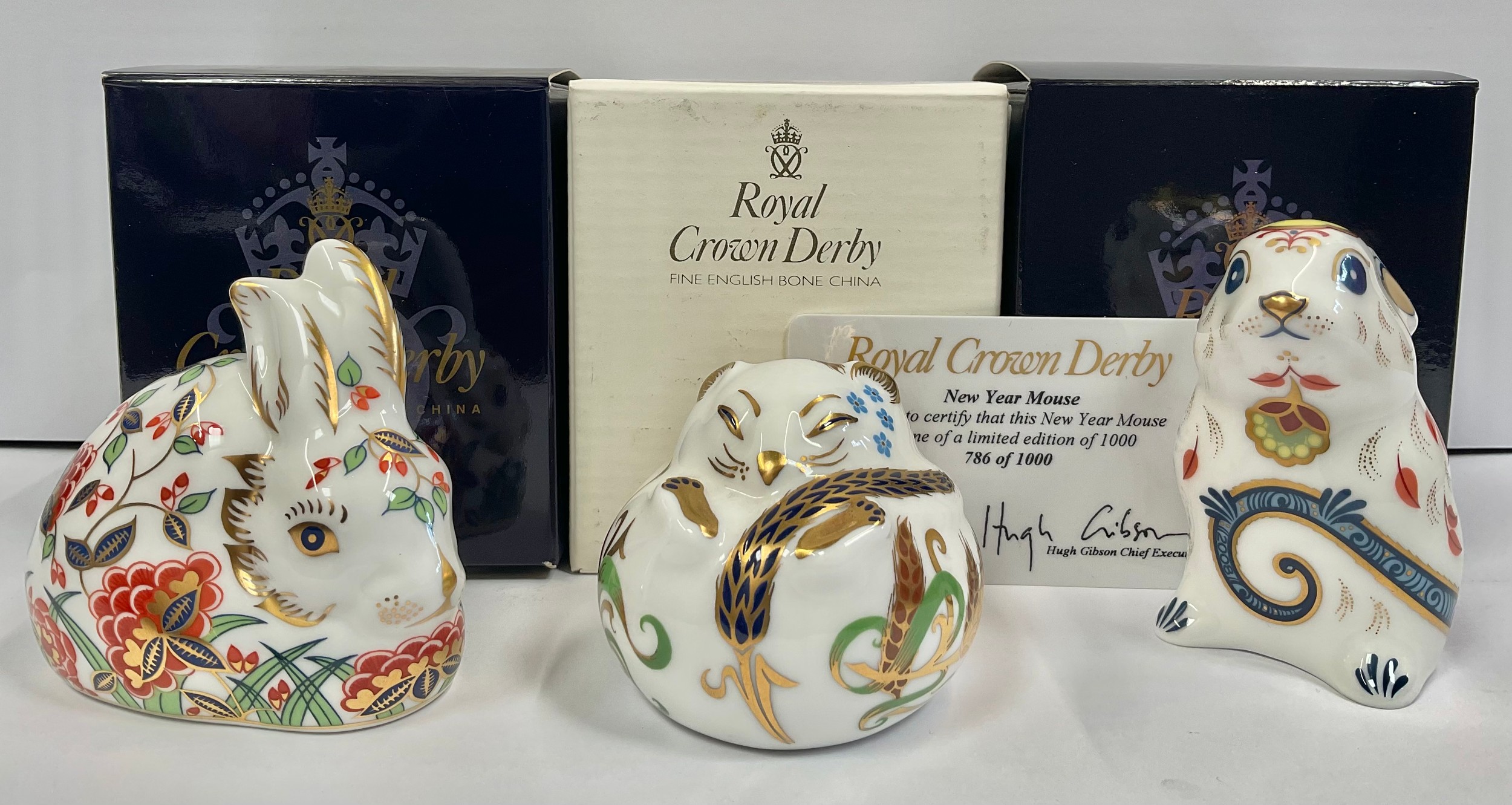 A Royal Crown Derby paperweight, New Year Mouse, exclusive limited edition 786/1,000; gold stopper, 7.5cm, printed mark in gold, certificate, boxed; others, Dormouse, gold stopper, printed mark, boxed; Meadow Rabbit, Collectors Guild exclusive, gold stopper, printed mark, boxed (3)