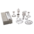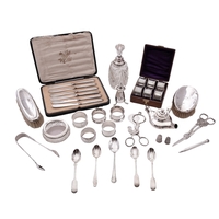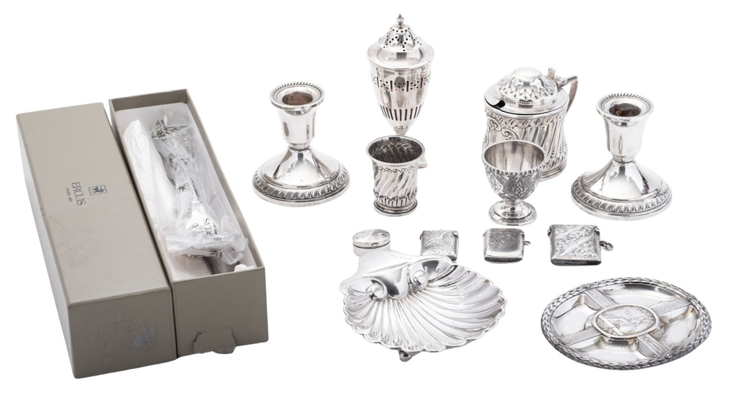 A mixed lot silver and silver plate including; an embossed mustard pot (blue glass liner), a vase-shaped caster (red glass liner), a pair of dwarf candlesticks (loaded bases), a continental shot beaker, a modern dish, a butter shell dish, a modern pill box and three engraved vesta cases, by different makers & dates; together with a cased silver plated place setting, by Ercuis of Paris and a plated egg cup; the butter shell dish 5'' (12.7cm) long; 12ozt (13)