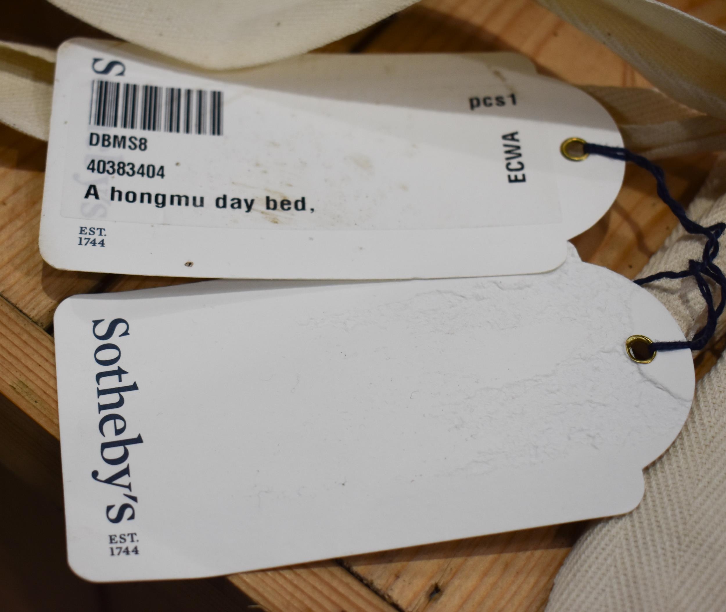 A FINE AND LARGE CHINESE QING DYNASTY CARVED HONGMU DAY BED Ex Sotheby's, of monumental proportions. 230 cm x 165 cm x 55 cm.