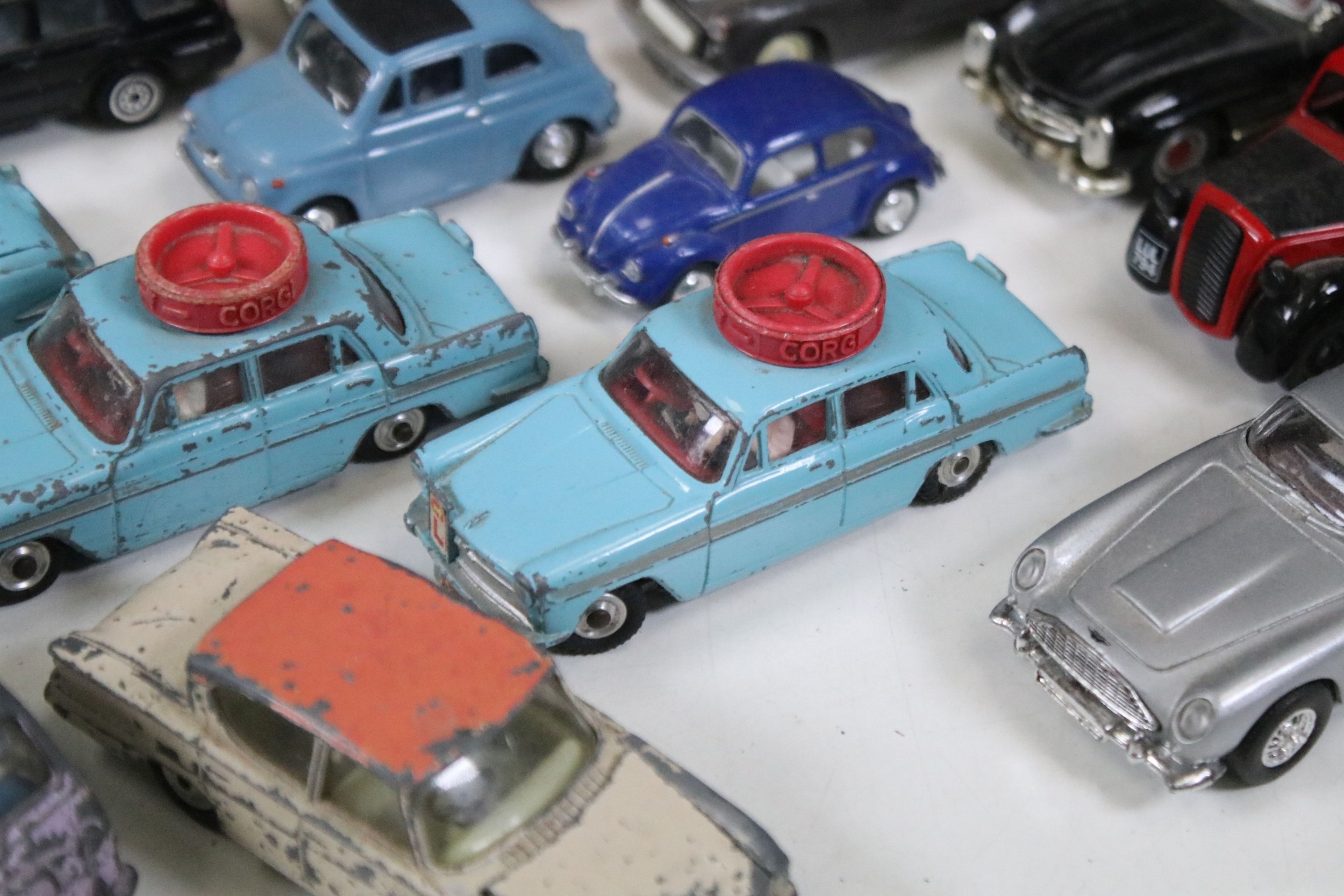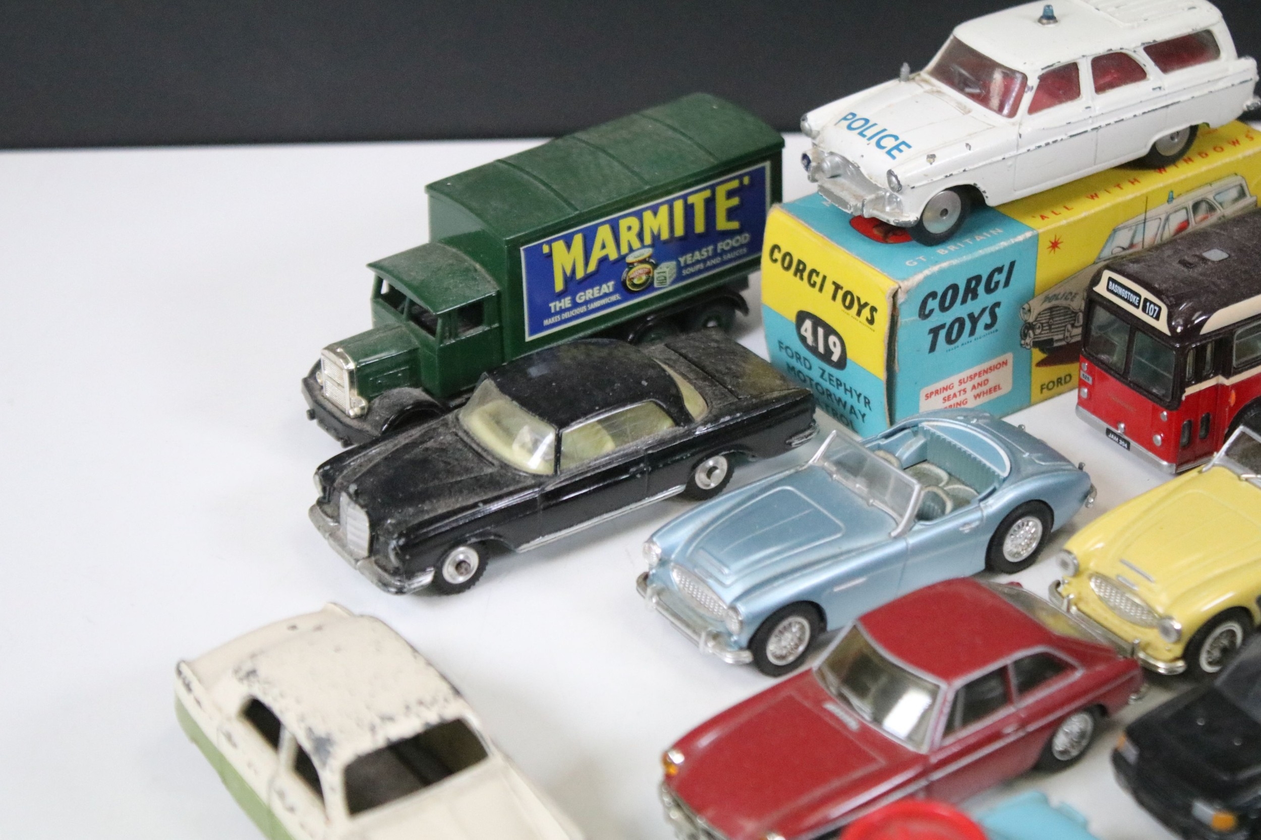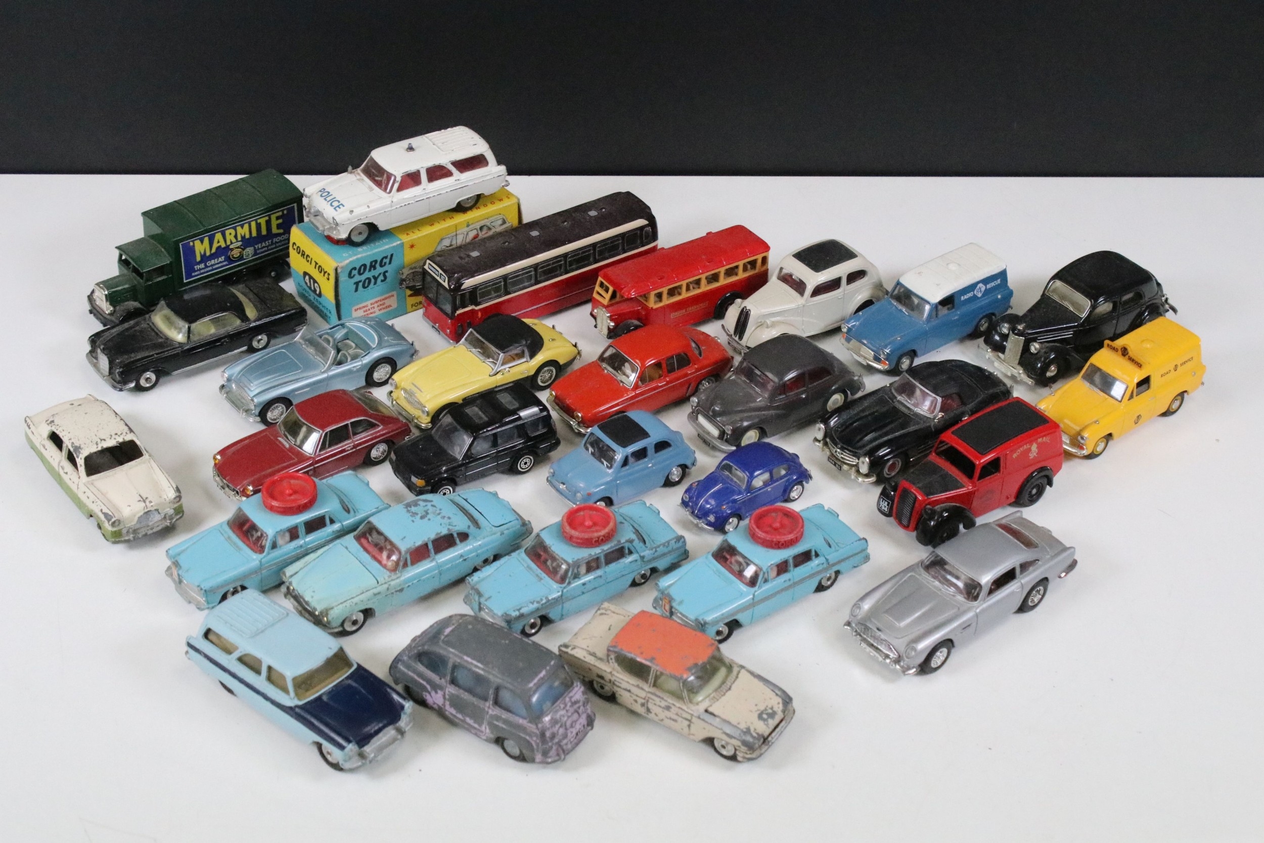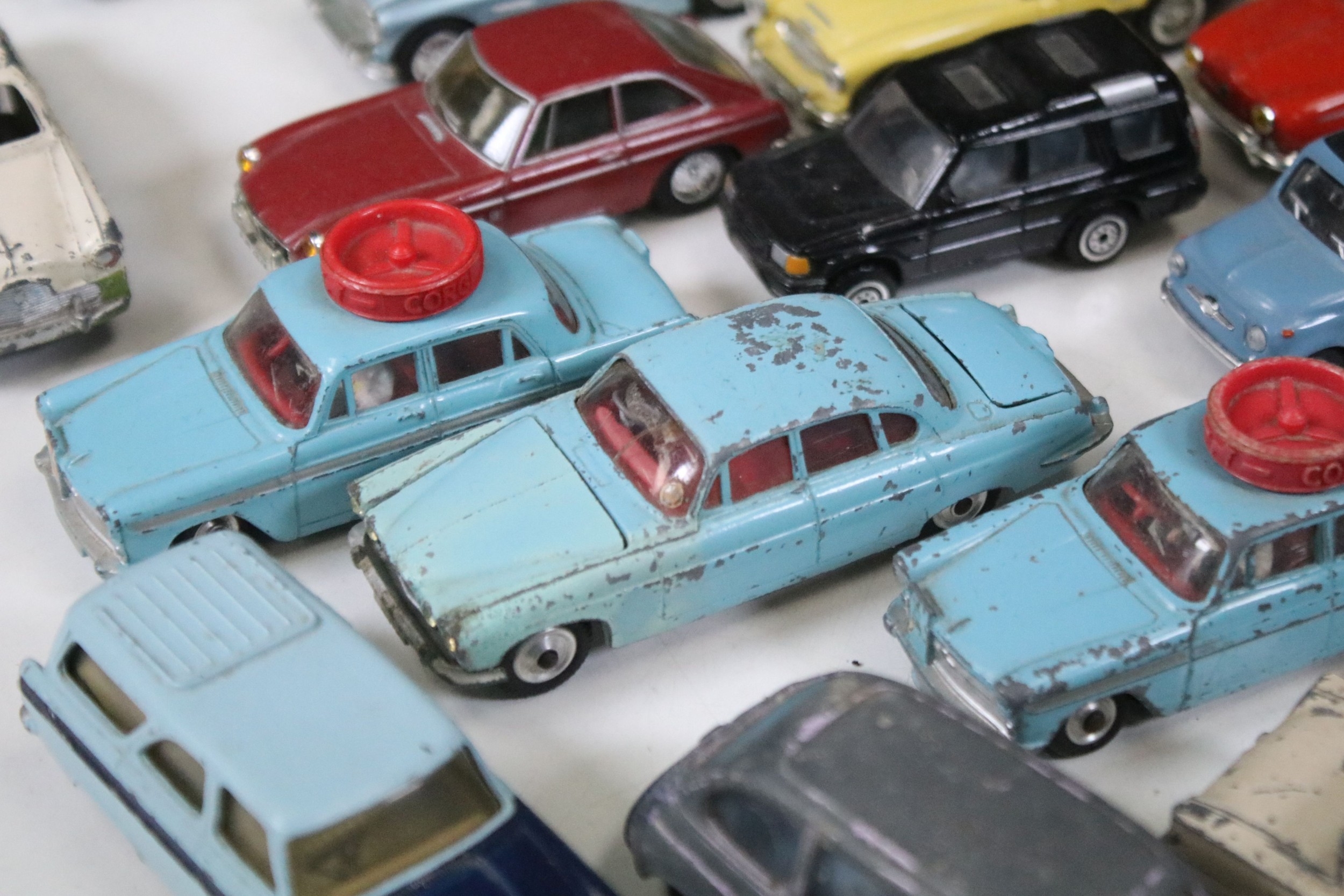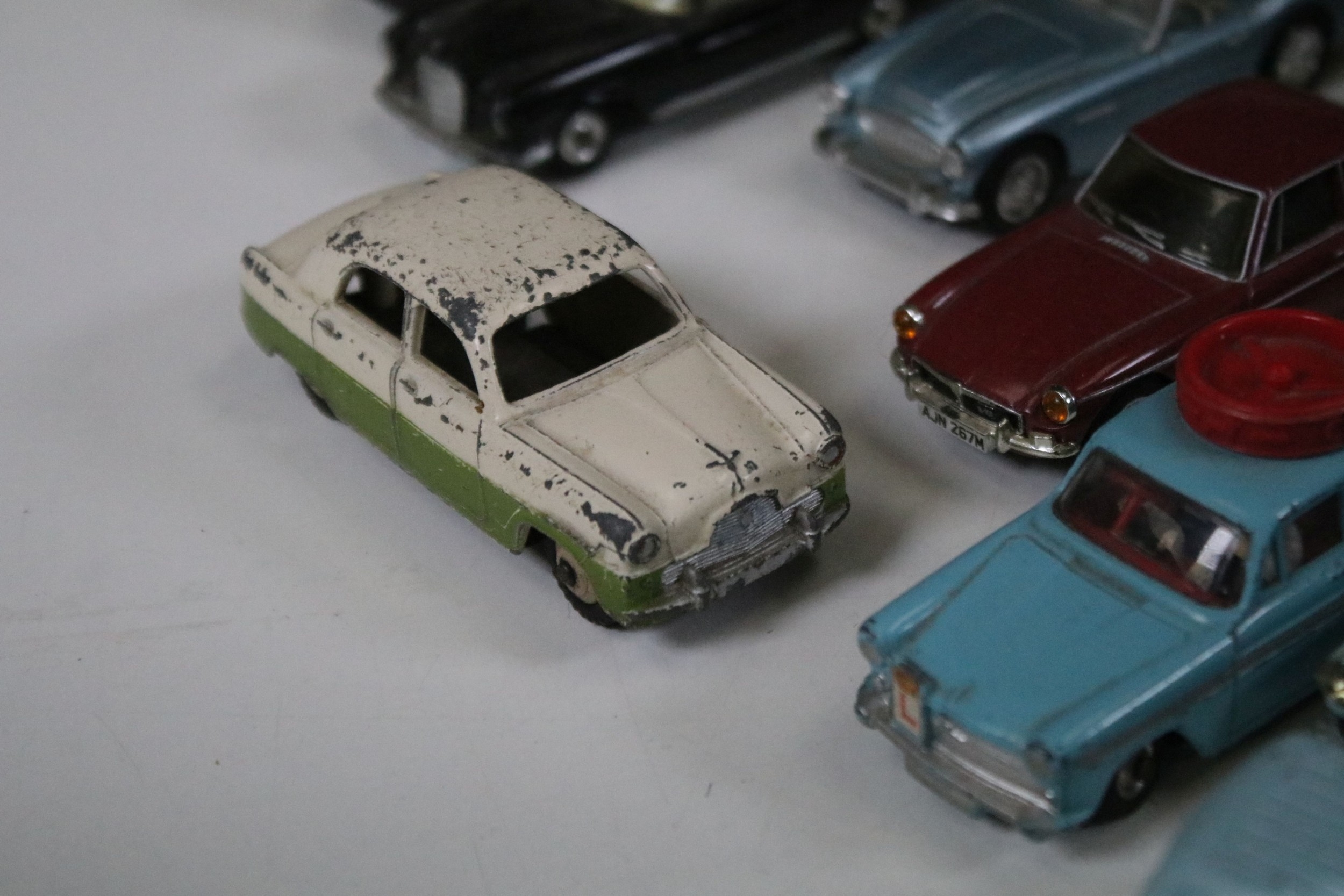 28 Diecast models from the mid 20th C diecast models to include 3 x Corgi Austin A60 Driving School, boxed Corgi 419 Ford Zephyr Motorway Patrol (play worn), Triang Spot On Fiat Multupla etc, earlier examples showing play wear