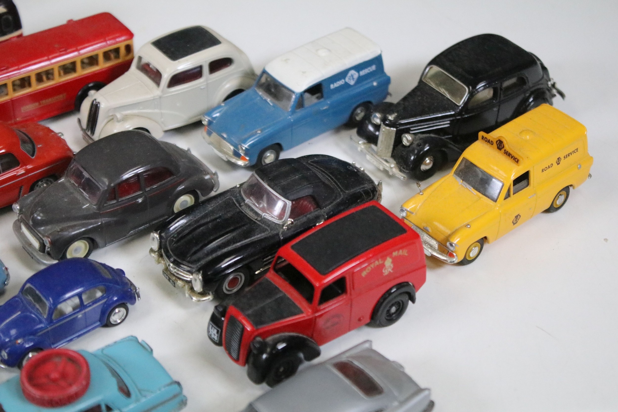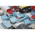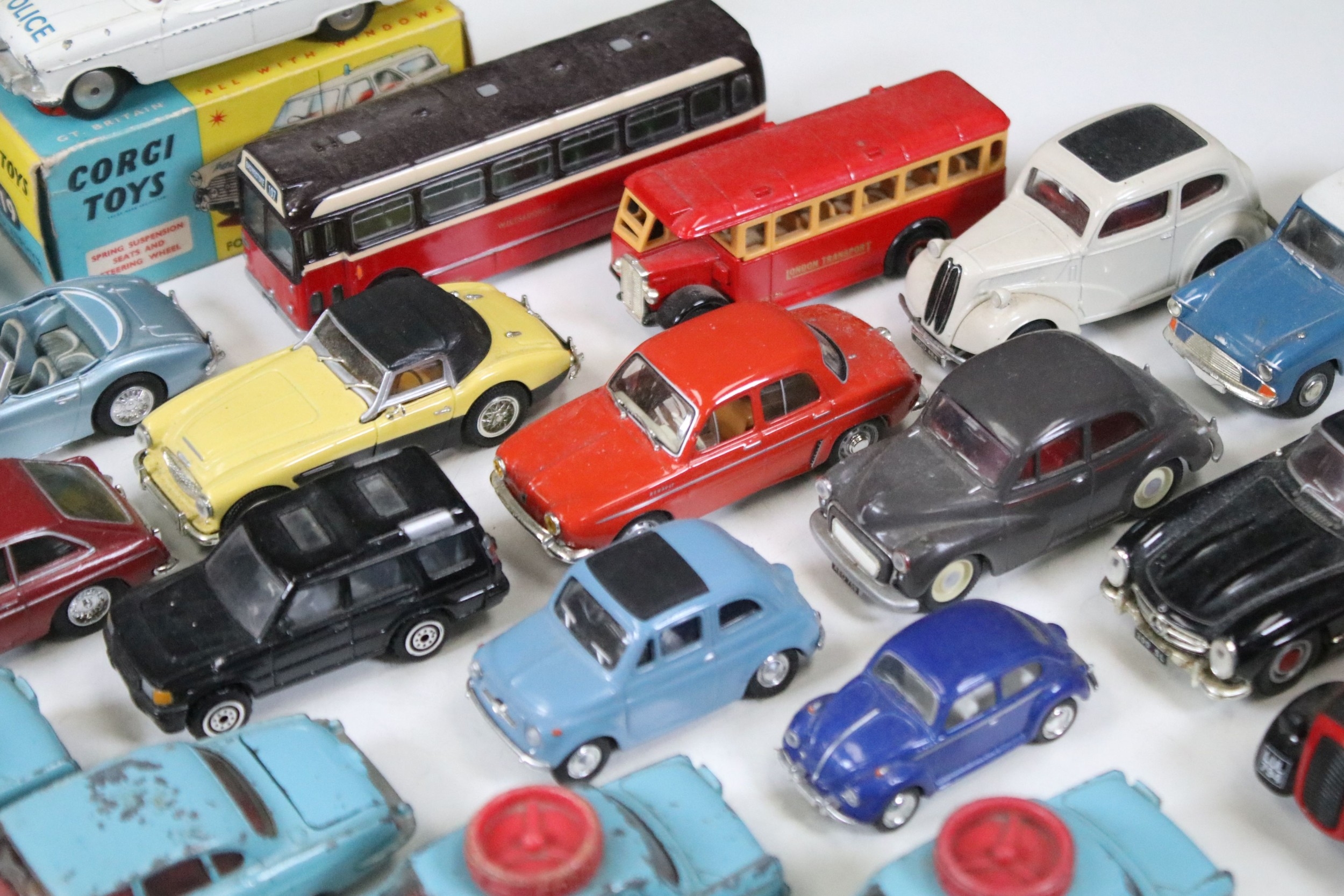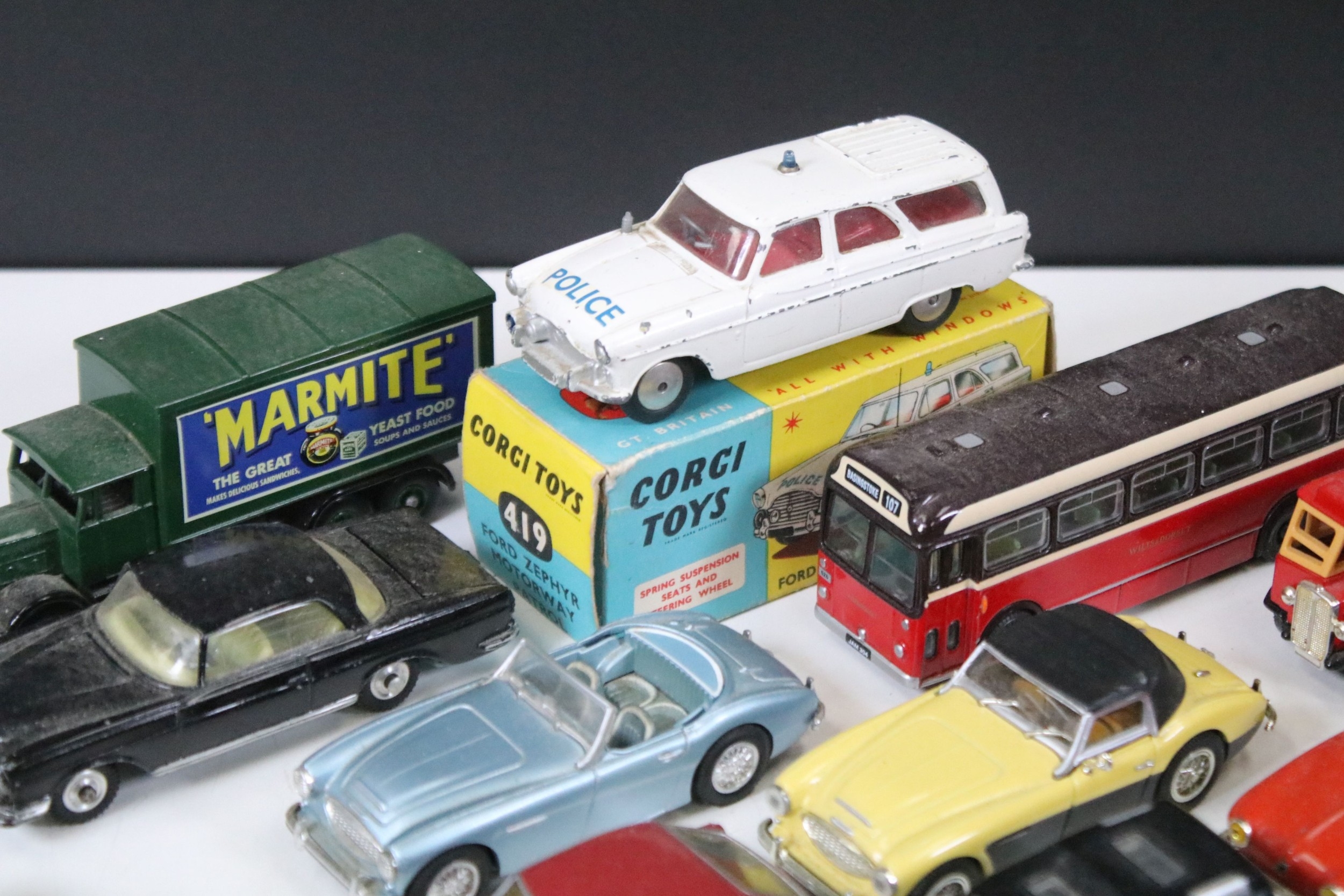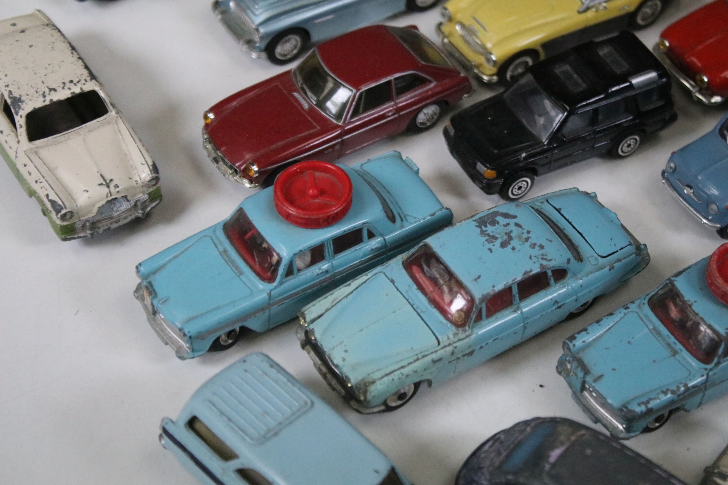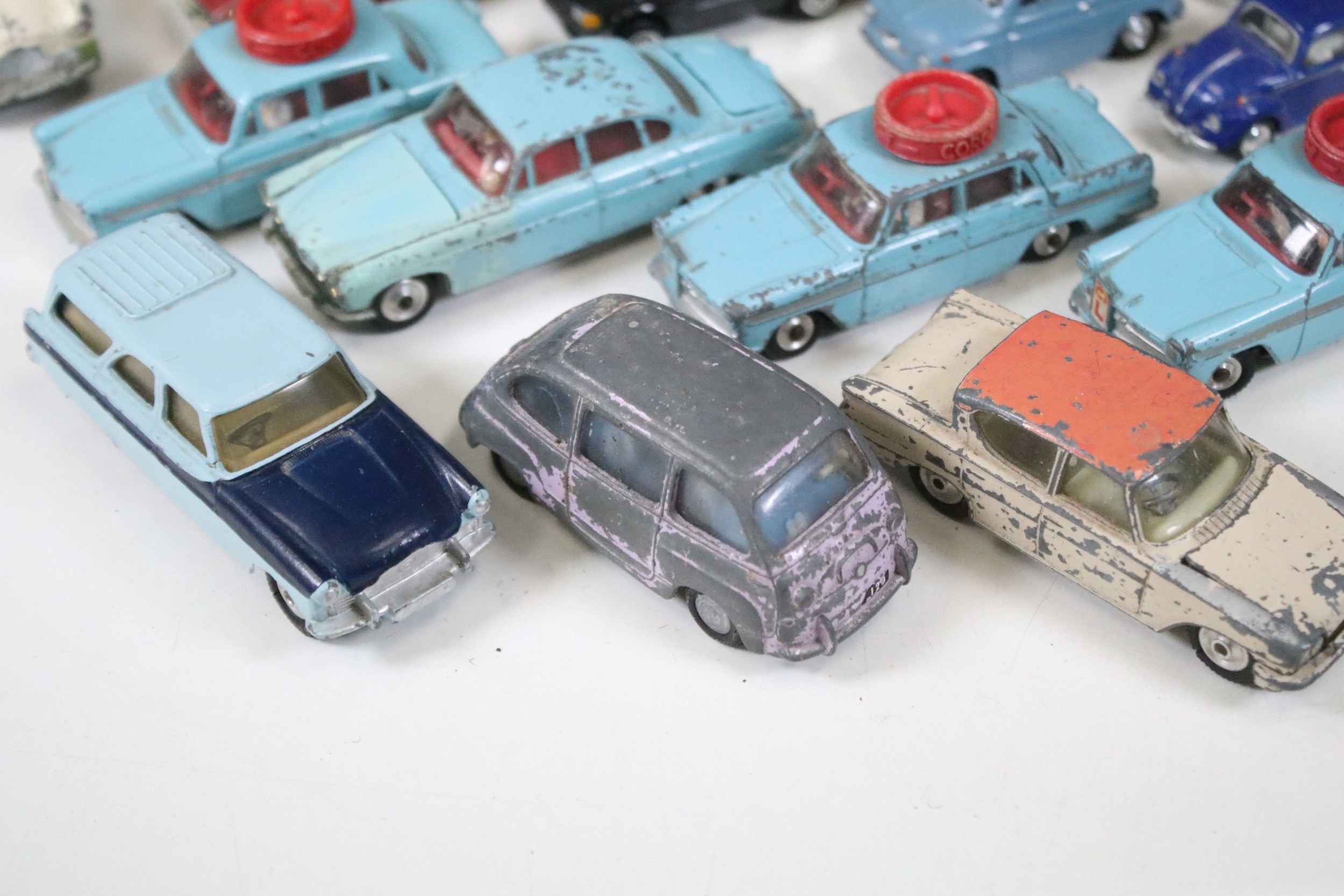 28 Diecast models from the mid 20th C diecast models to include 3 x Corgi Austin A60 Driving School, boxed Corgi 419 Ford Zephyr Motorway Patrol (play worn), Triang Spot On Fiat Multupla etc, earlier examples showing play wear