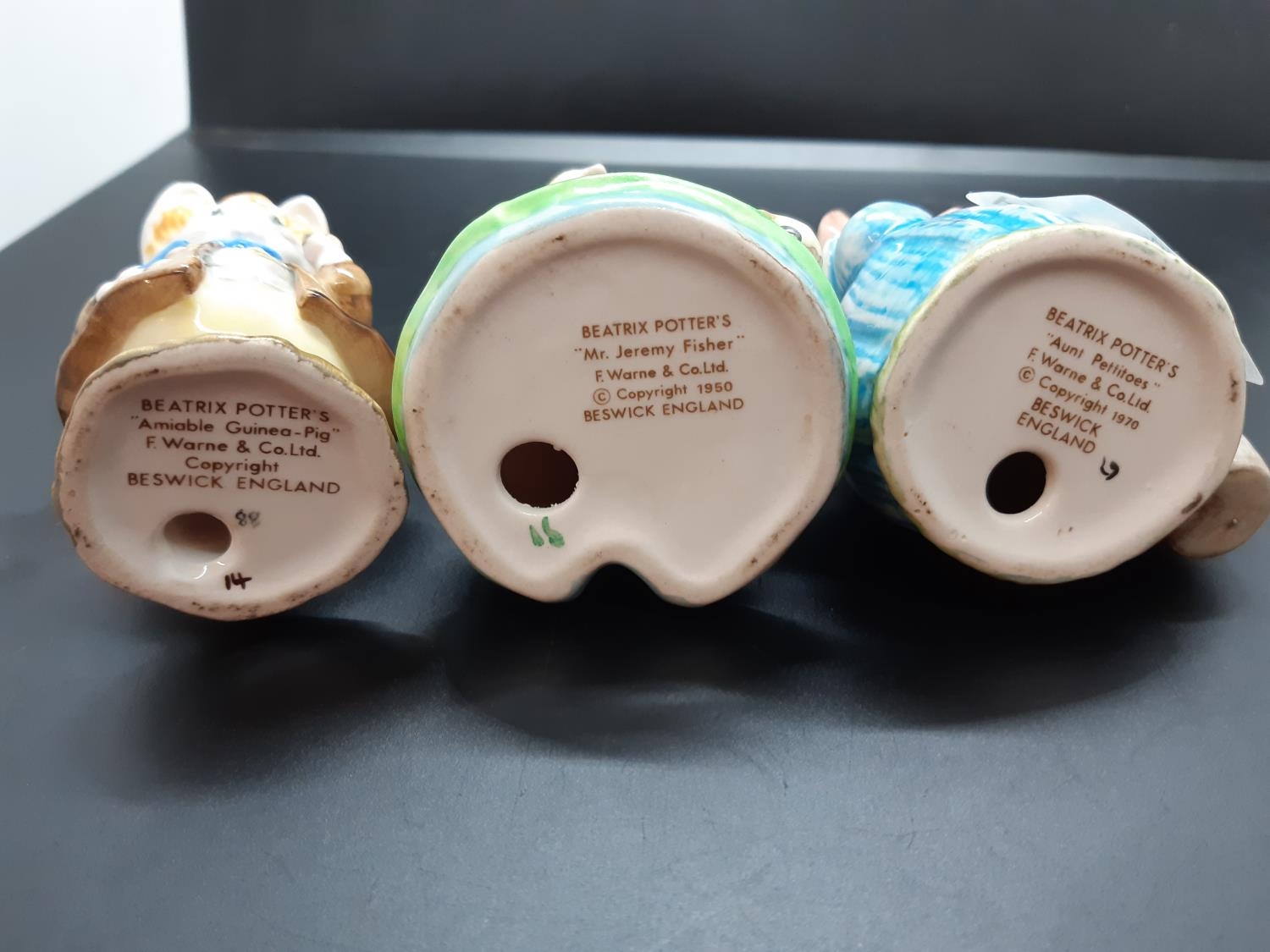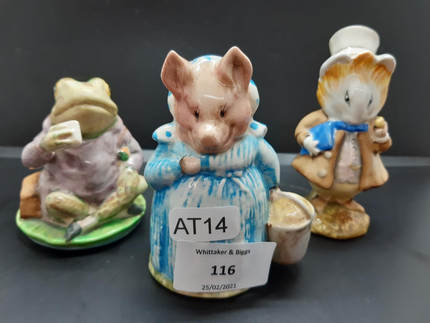 Three Beswick Beatrix Potter figurines to include Mr. Jeremy Fisher, Aunt Pettitoes and Amiable Guinea Pig