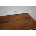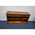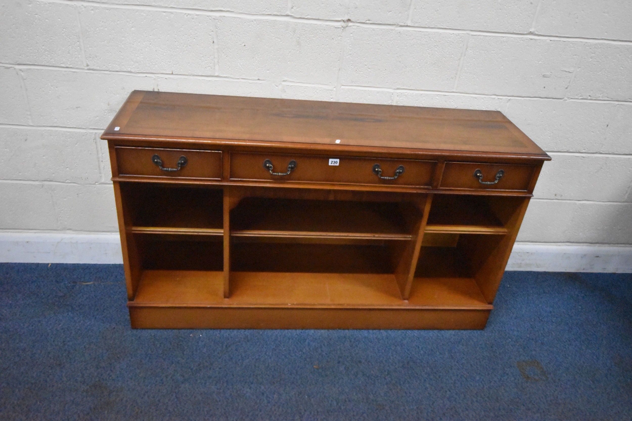 A REPRODUCTION YEW WOOD SIDEBOARD, fitted with three drawers and three shelves, width 140cm x depth 42cm x height 79cm, condition report: marks, scuffs, other wear and usage