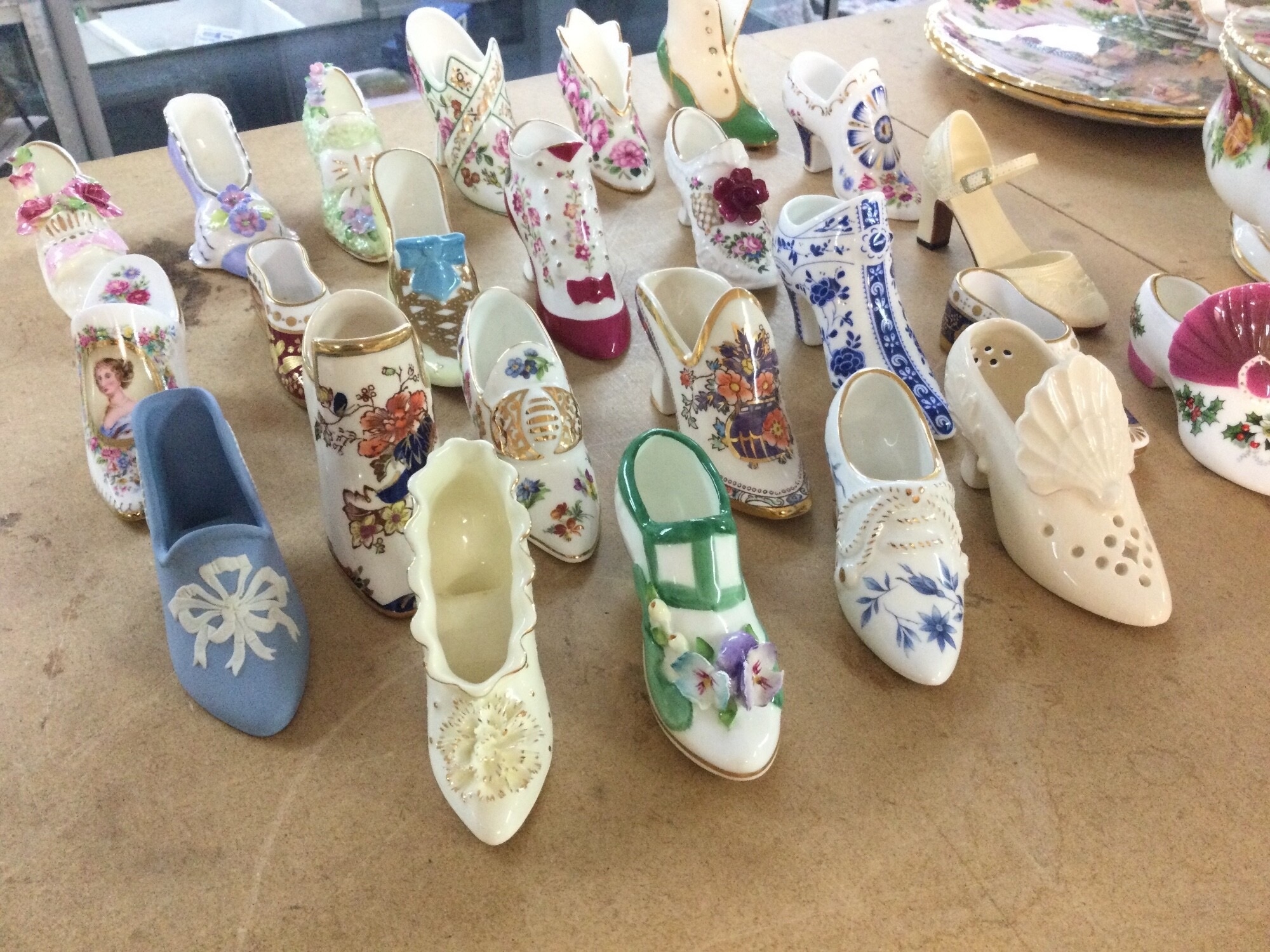 A collection of assorted ceramic shoe ornaments.