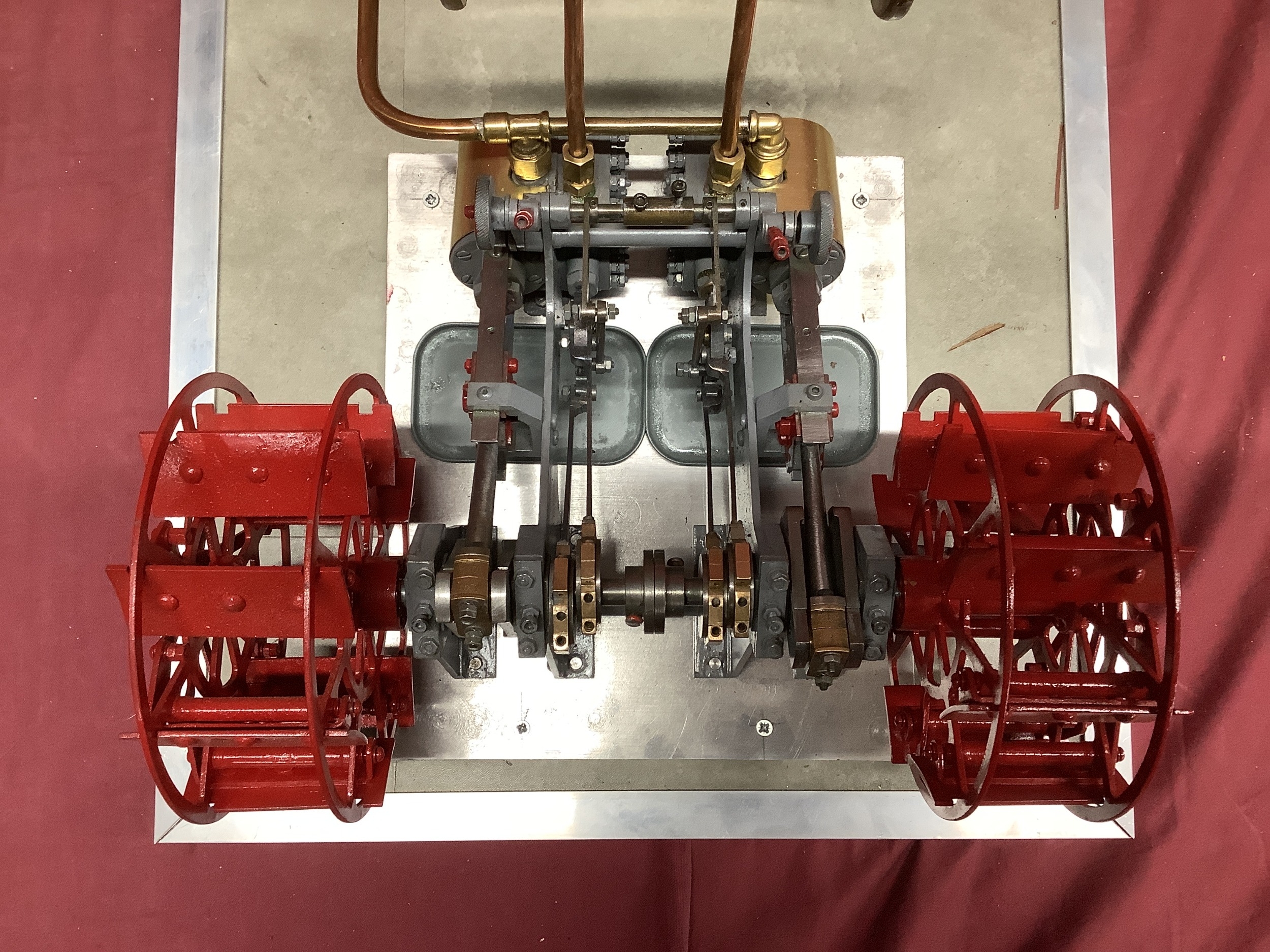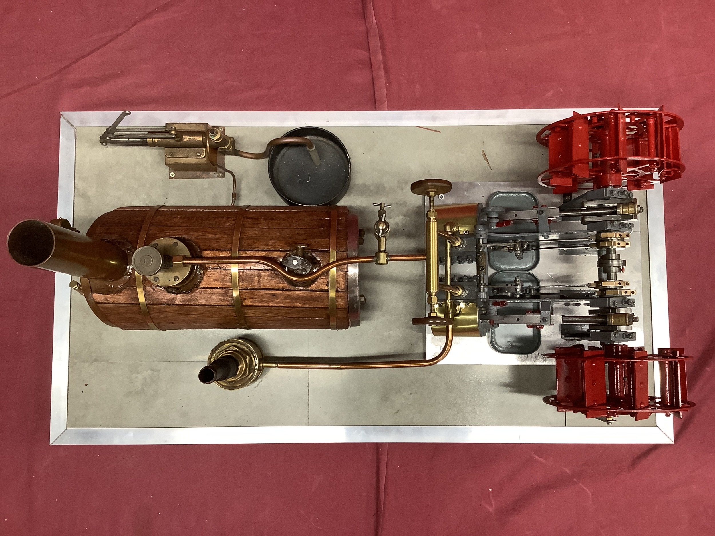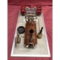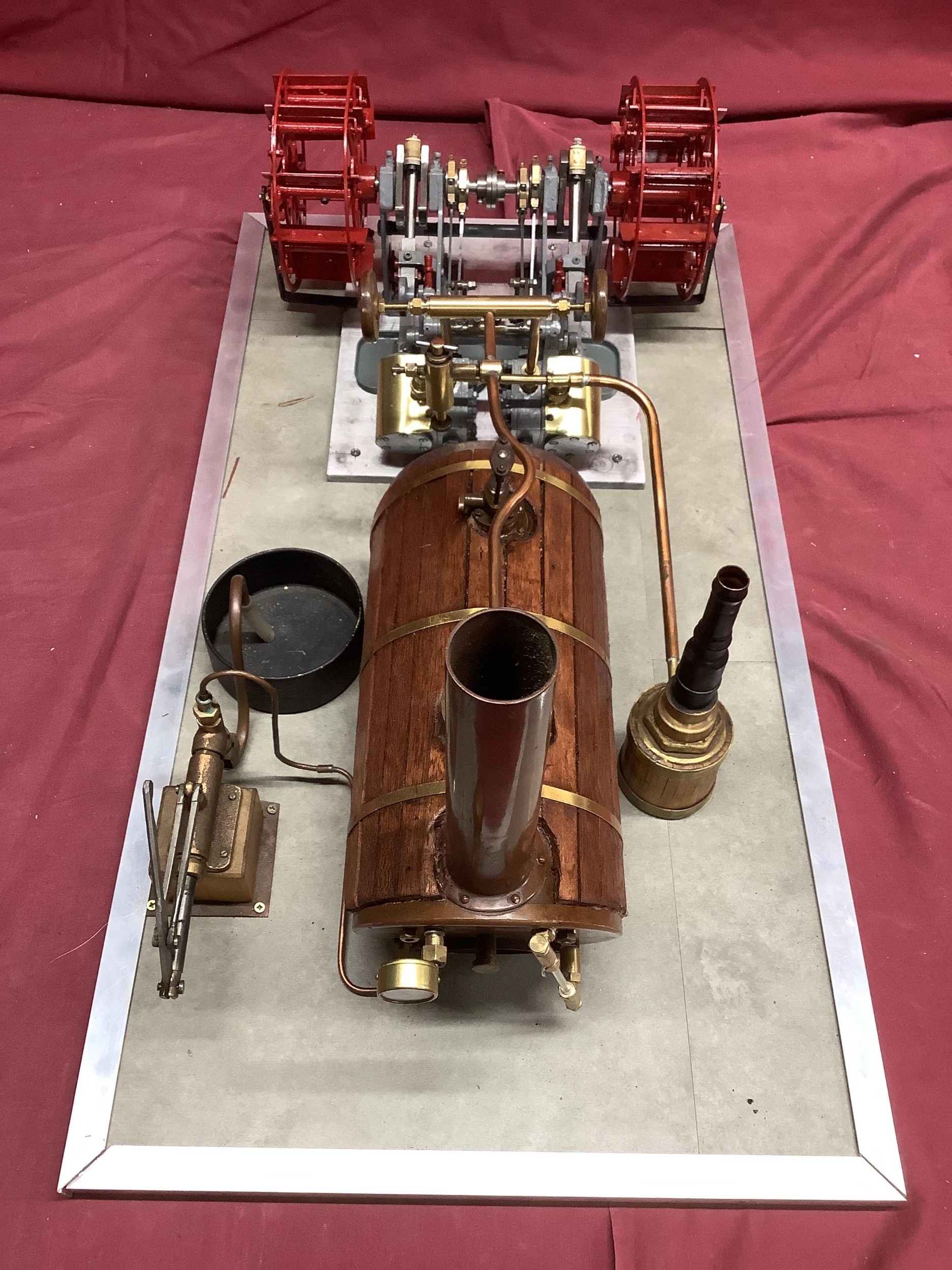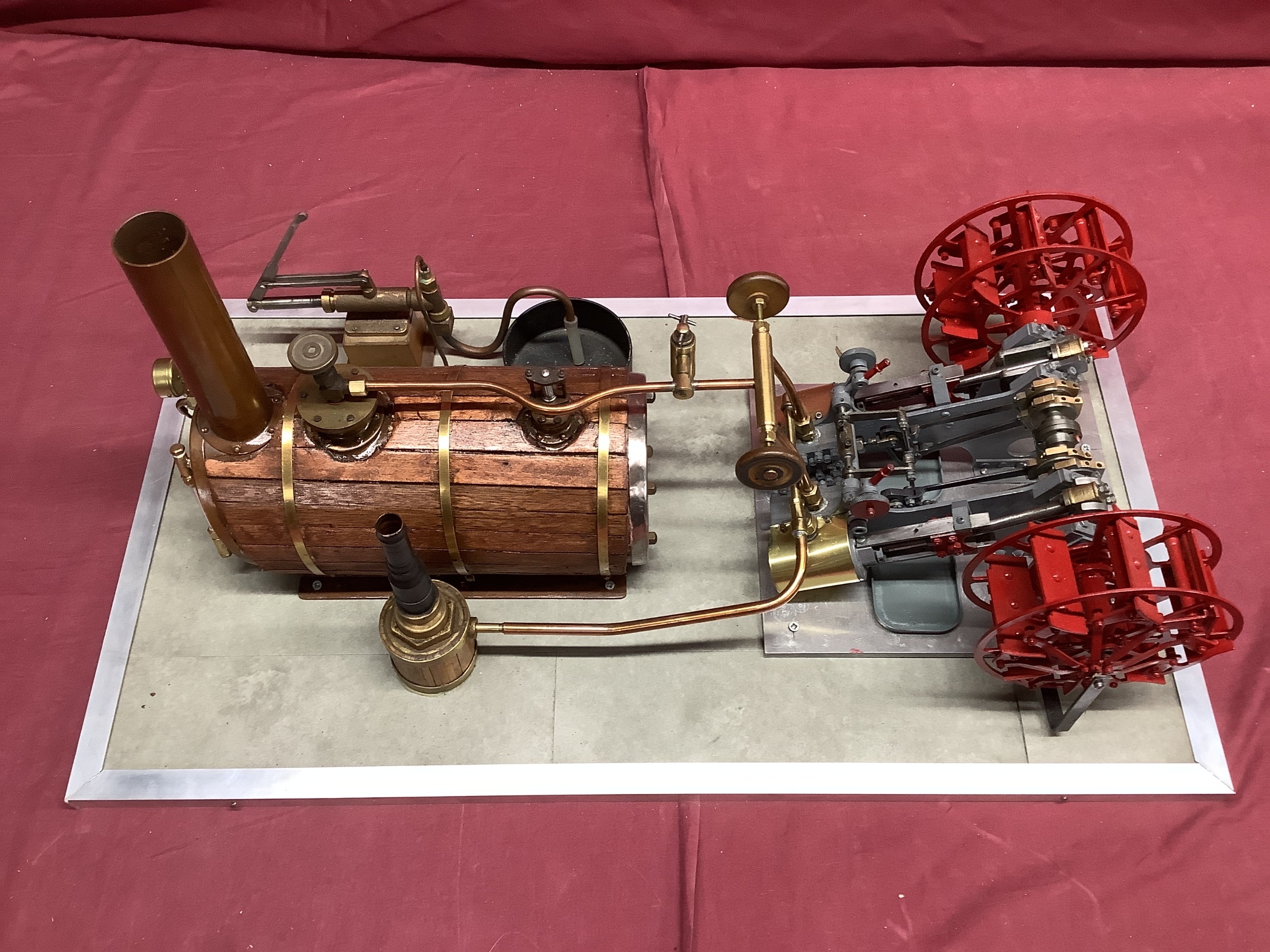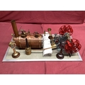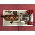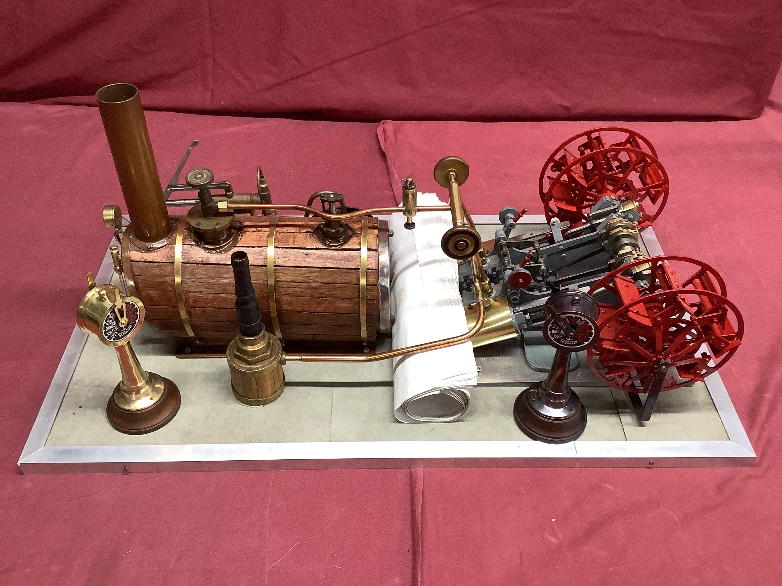 A Large "E.T. Wesbury" Live Steam "Paddle Steamer" Model Engine, consisting of twin independent reversing cylinders, 0.75 inch bore and 1.5 inch stroke, powering two 6 inch (6") diameter feathering paddles. a Westbury type horizontal copper boiler 5 x 10 inch with wood cladding, pressure gauge and sight glass, etc; boiler designed for a (unfitted) gas burner system, plus a water pump, flyball governor and two engine room telegraphs (scenic only); finished in red, grey, bright metal, varnished wood, all fitted to a 16 x 29 inch base, overall condition very good.