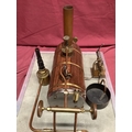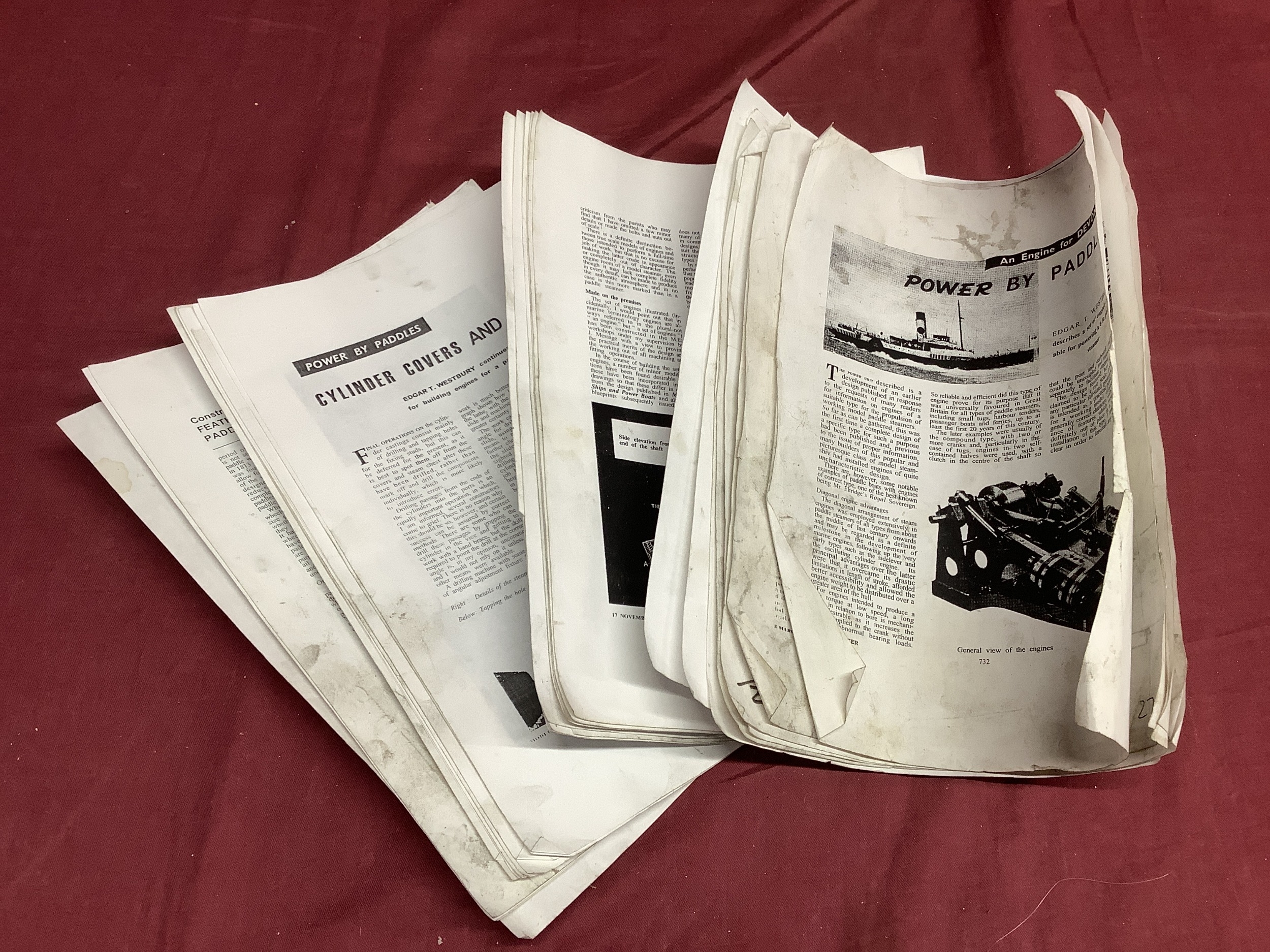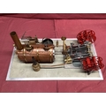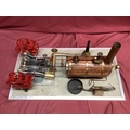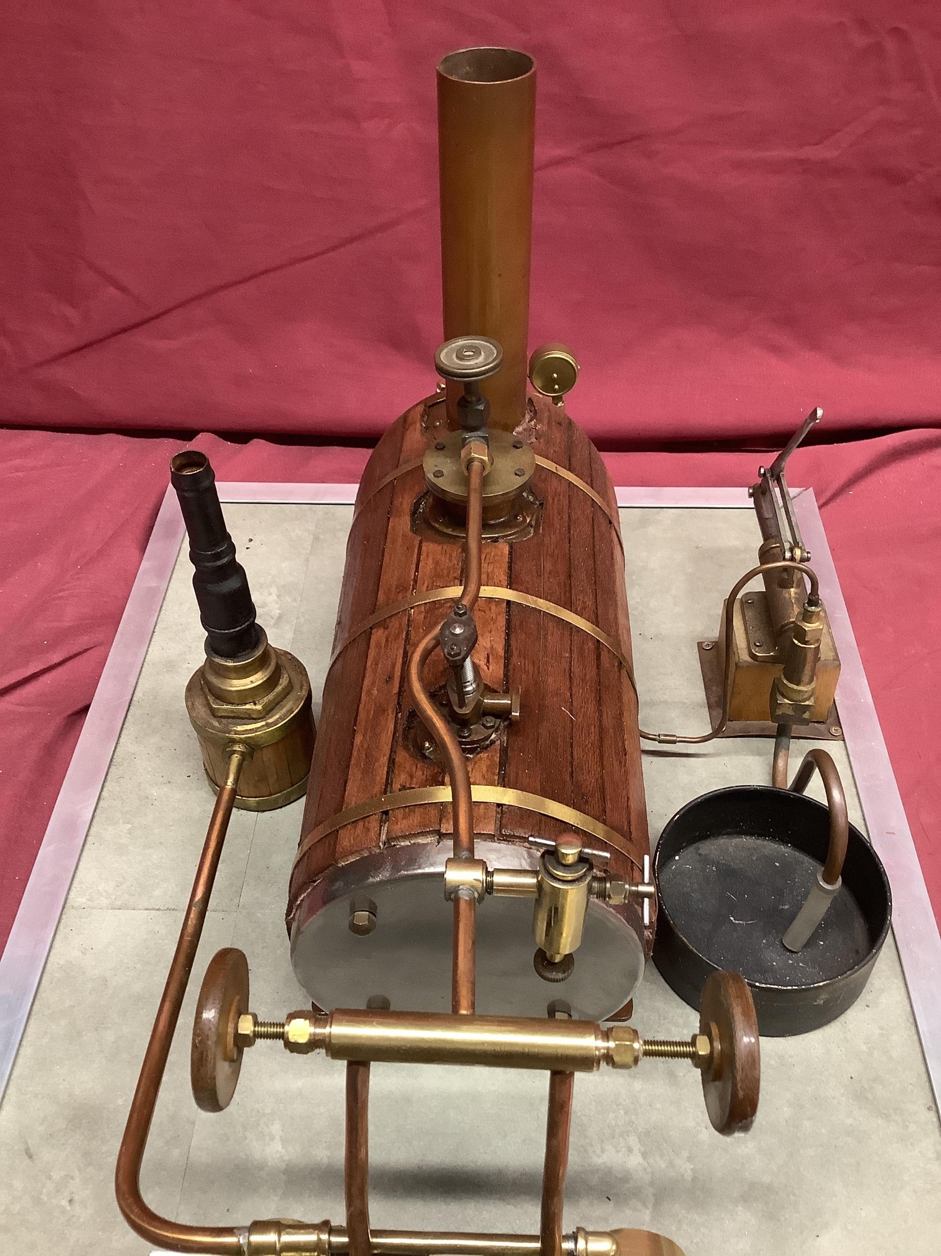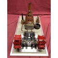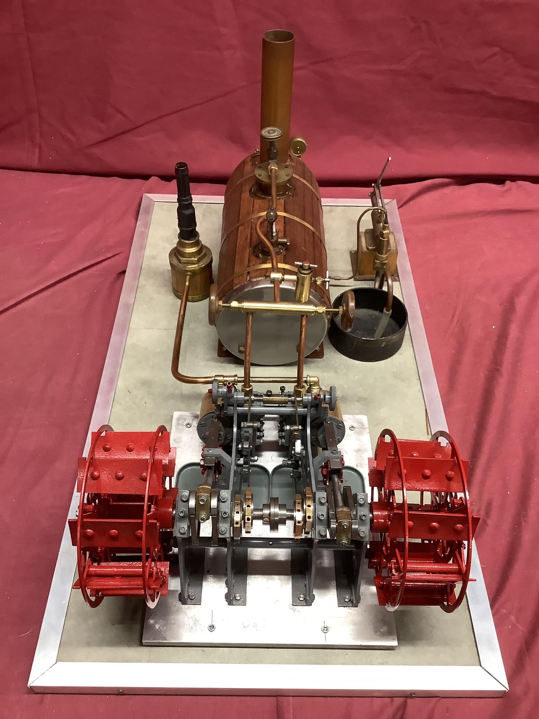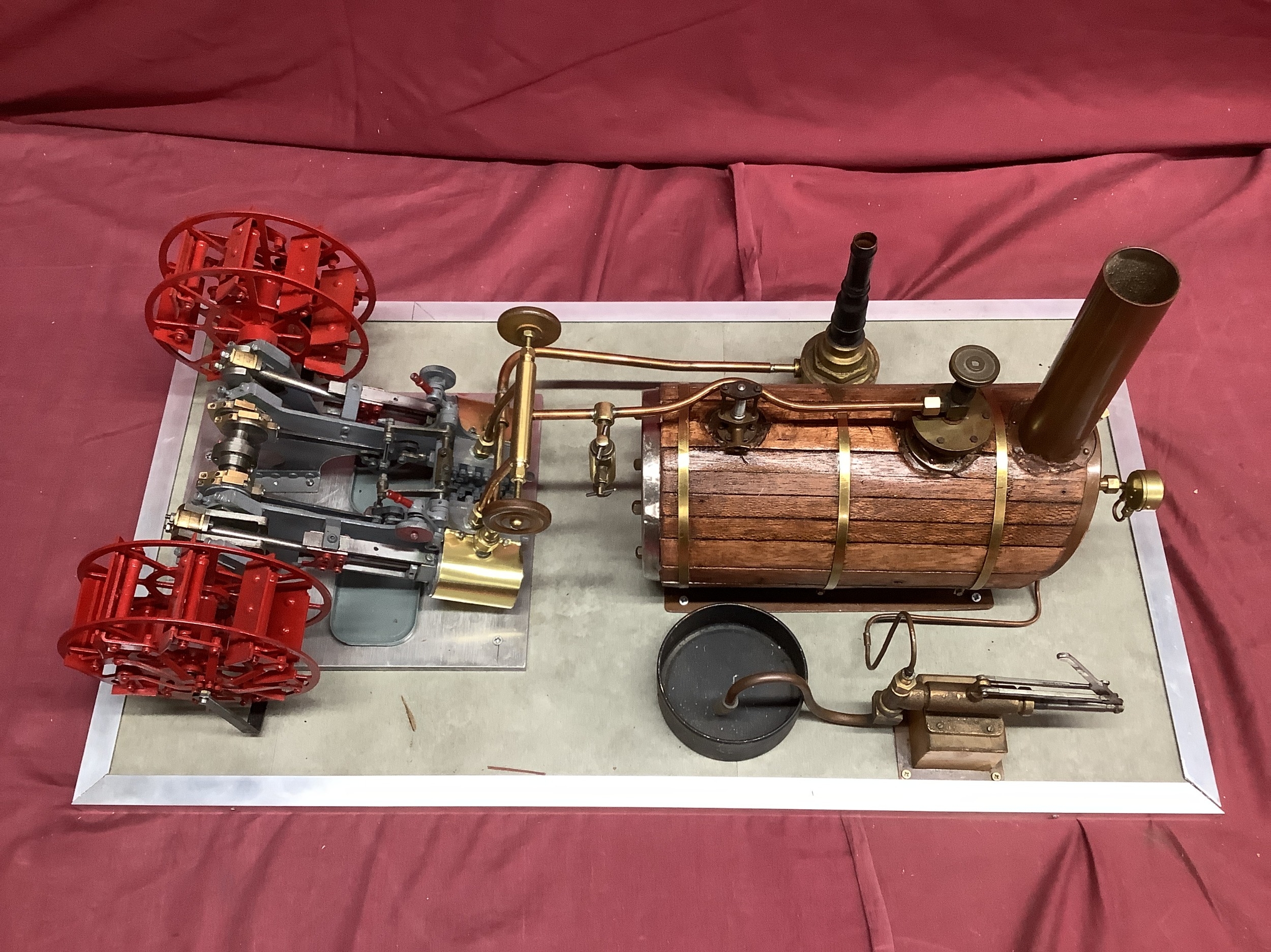 A Large "E.T. Wesbury" Live Steam "Paddle Steamer" Model Engine, consisting of twin independent reversing cylinders, 0.75 inch bore and 1.5 inch stroke, powering two 6 inch (6") diameter feathering paddles. a Westbury type horizontal copper boiler 5 x 10 inch with wood cladding, pressure gauge and sight glass, etc; boiler designed for a (unfitted) gas burner system, plus a water pump, flyball governor and two engine room telegraphs (scenic only); finished in red, grey, bright metal, varnished wood, all fitted to a 16 x 29 inch base, overall condition very good.