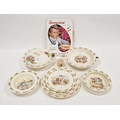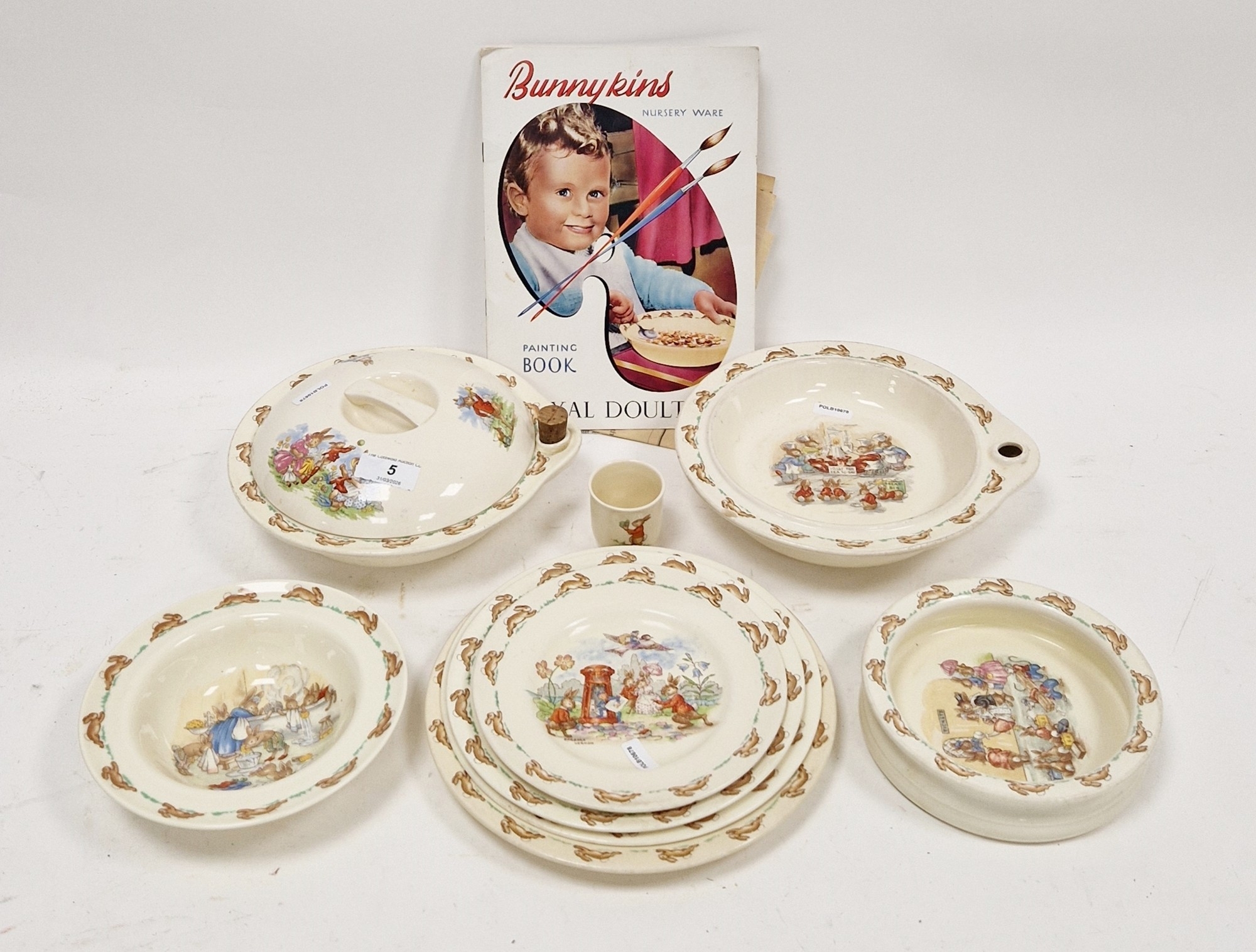 Royal Doulton Bunnykins pattern nursery wares, printed marks, comprising: an egg cup, two warming dishes and one cover, a feeding dish, a bowl and four plates in sizes, together with a Bunnykins pamphlet