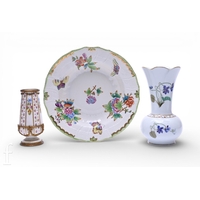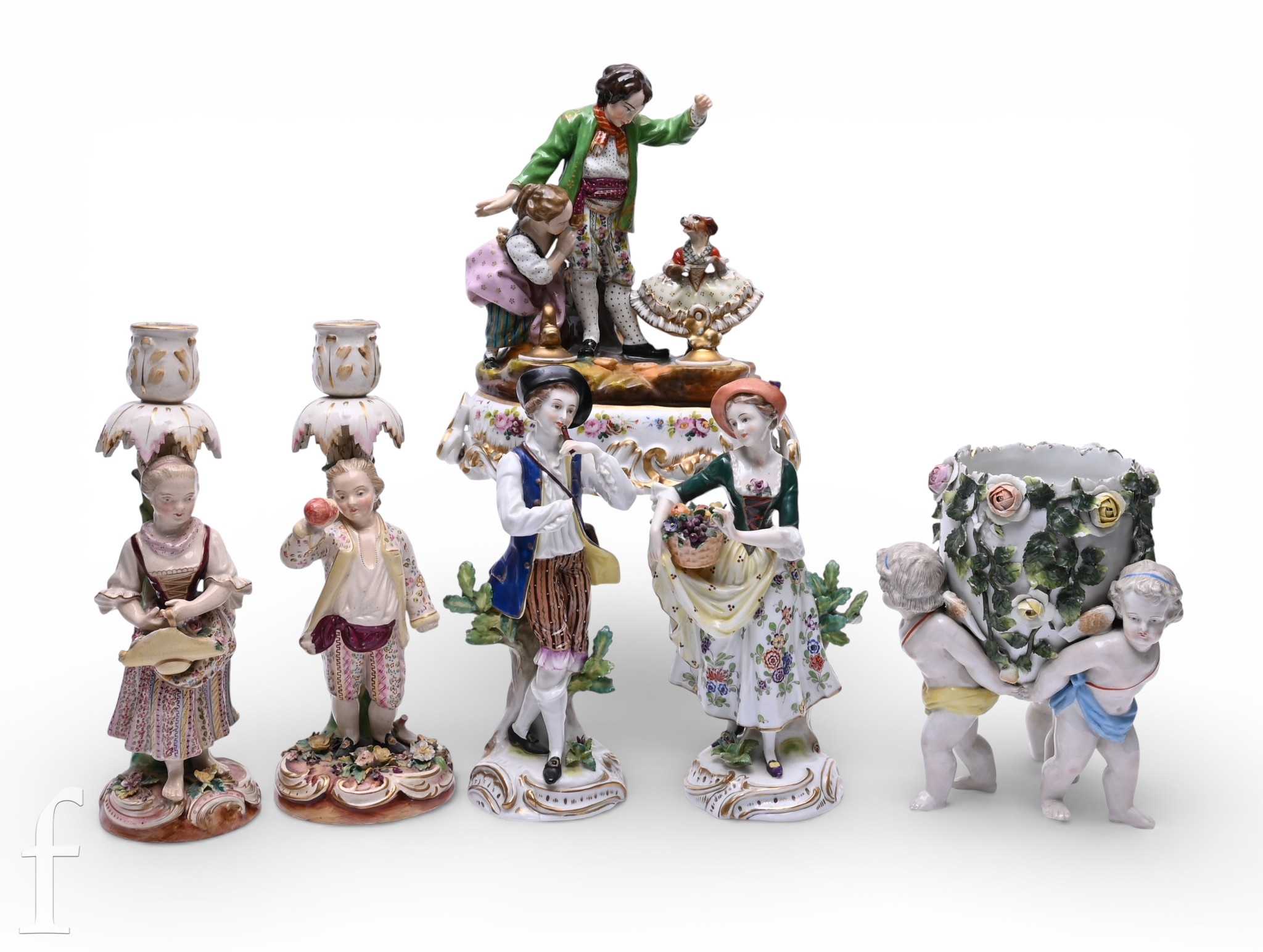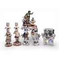 A Jacob Petit Fontainebleau porcelain figural inkwell, circa 1850, surmounted with two children and a dancing dog in traditional dress, on naturalistic base with two lidded wells and and pen apertures above gilt heightened relief moulded acanthus scrolls and painted floral band, painted JP marks, height 24cm, together with a Sitzendorf vase, of ovoid form with floral encrustations, supported with three winged cherubs, height 19cm, a pair of late 19th Century continental porcelain figures, gallant and companion, height 24cm, and a pair of earthenware figural candlesticks. (6)