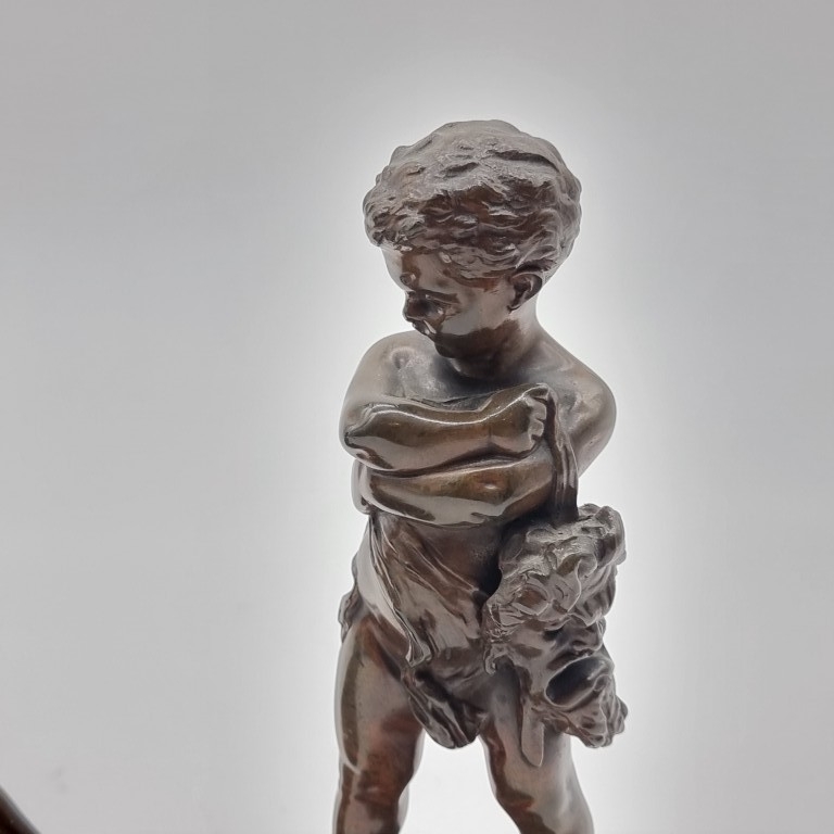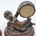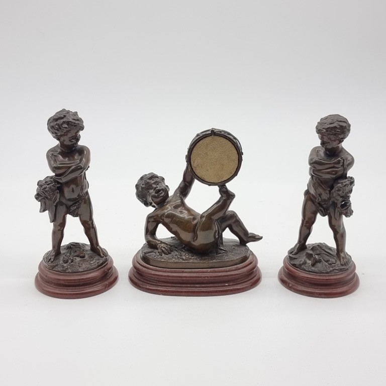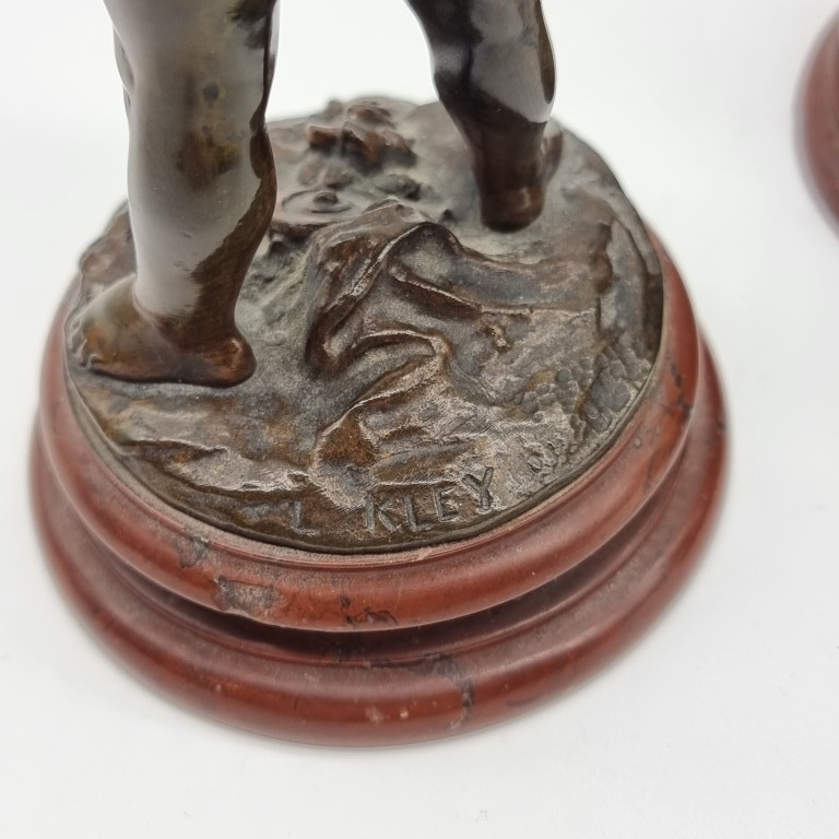 Louis Kley, a group of three bronze cherubs, each on red marble base, largest 17.5cm high.