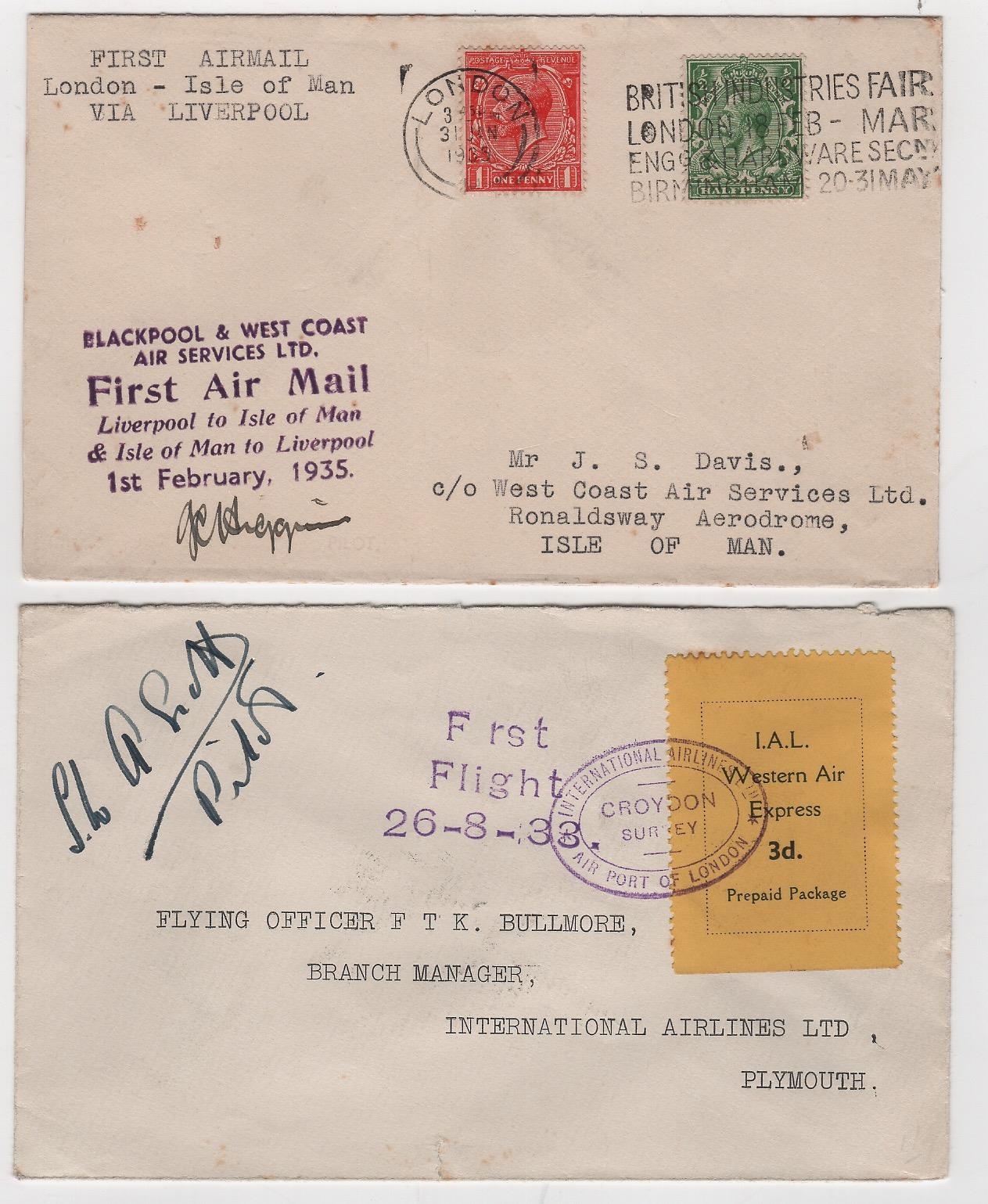 1933 (Aug 26) International Air Lines Ltd Croydon to Plymouth first flight, cover franked I.A.L 3d stamp, signed by the pilot S.W.A Scott; and 1935 (Jan 31) London to Isle of Man via Liverpool first flight by Blackpool & West Coast Air Services Ltd, cover franked ½d + 1d with six line flight cachet, signed by the pilot J.C Higgins. Scarce pilot signed covers. (2).