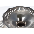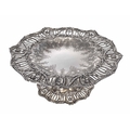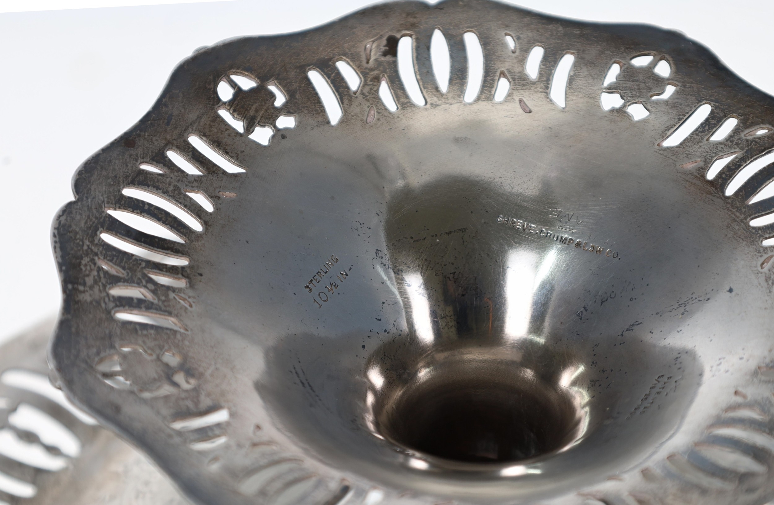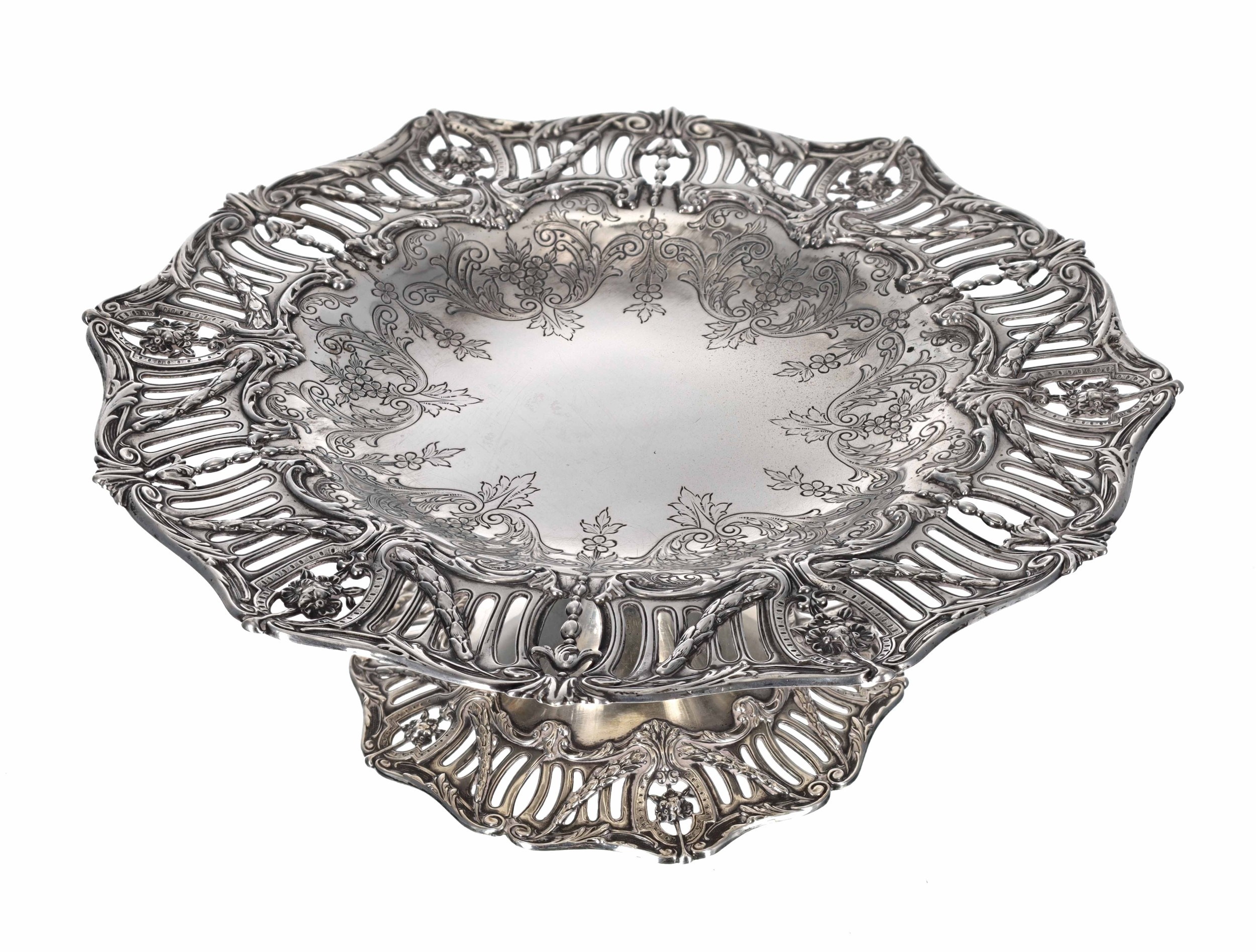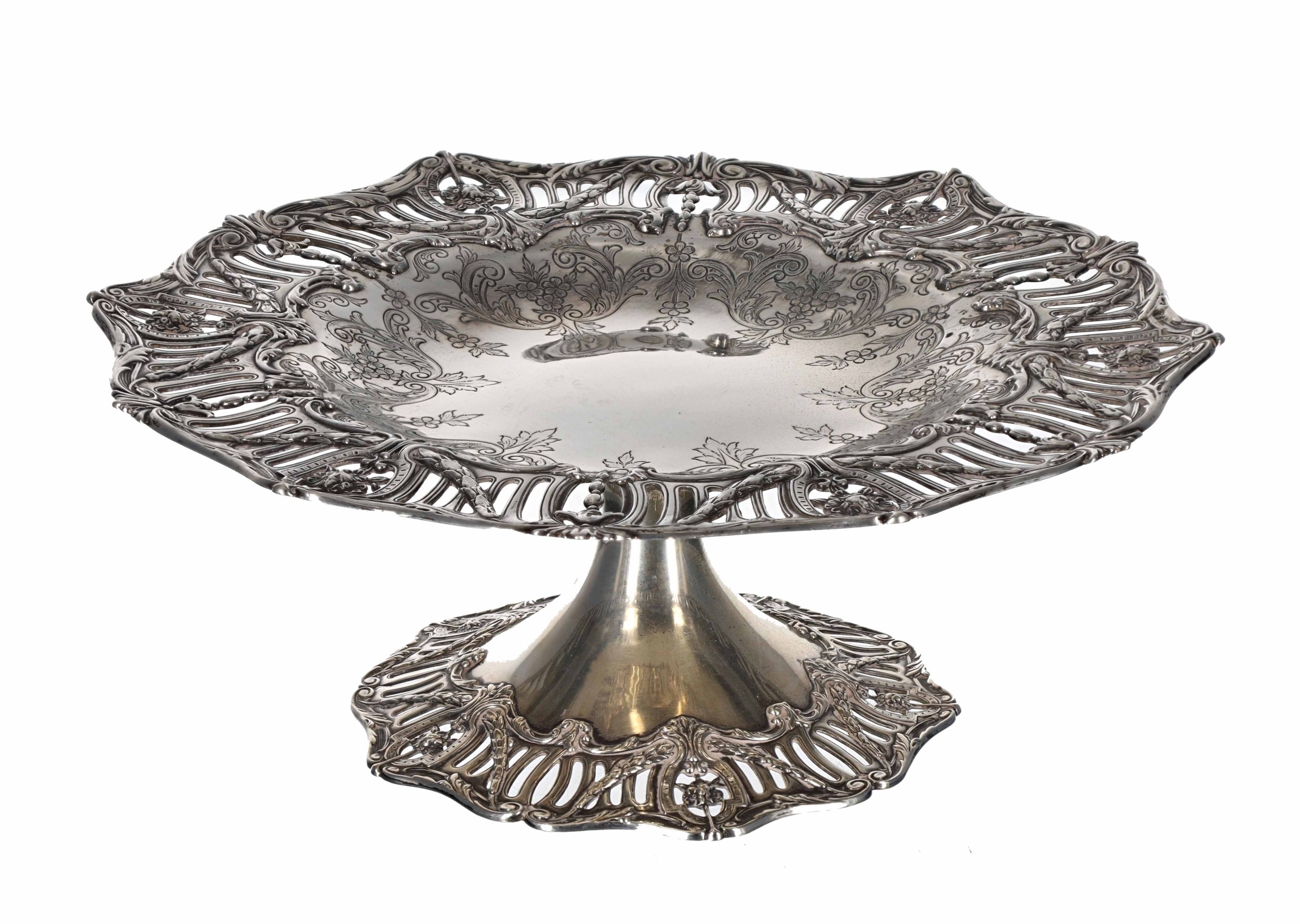 American Sterling silver tazza, the engraved shallow bowl with pierced swag shaped rim, raised on a central support with similar foot rim, maker Shreve, Crump & Low Co. 11" diameter, 4" high, 20.6oz t