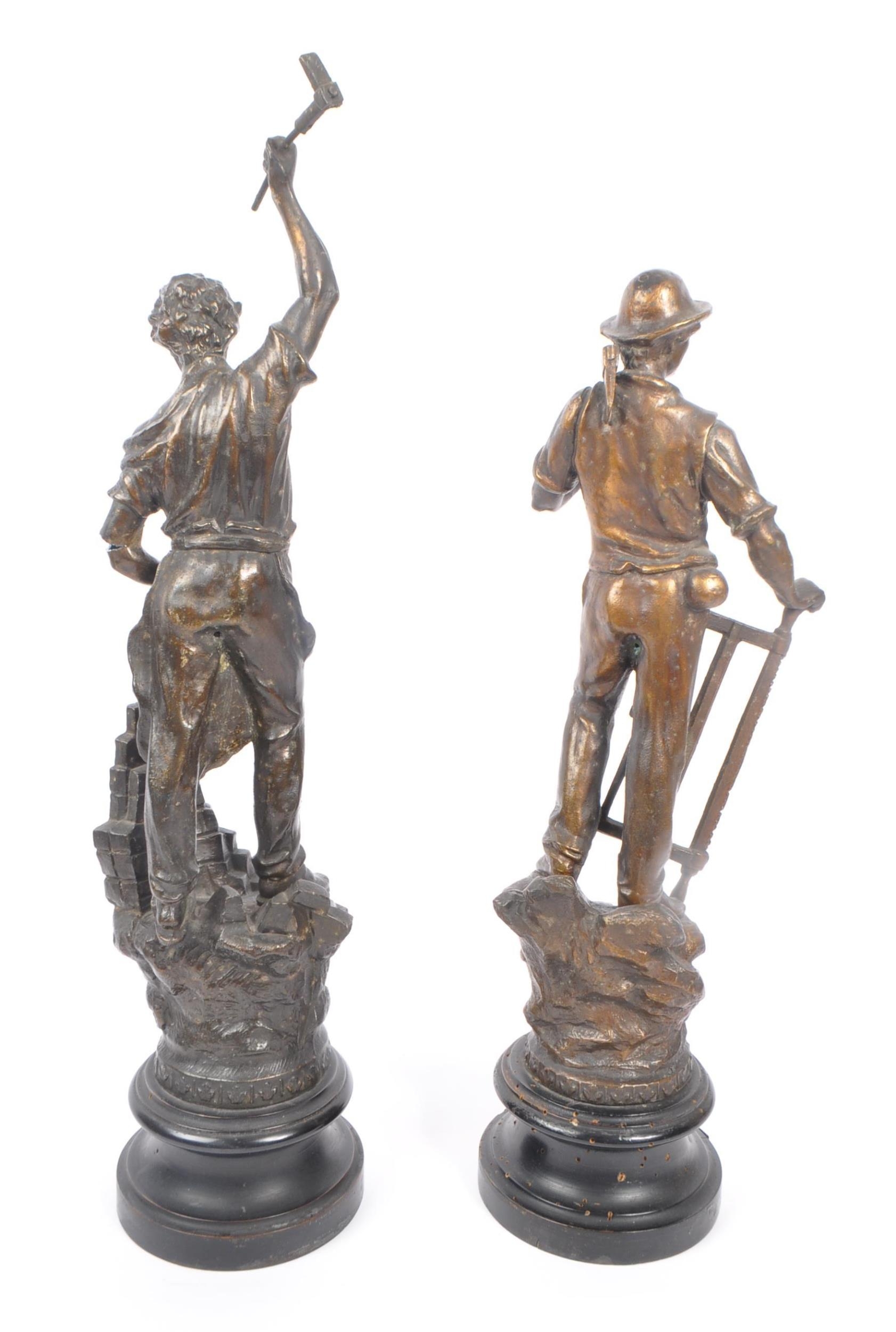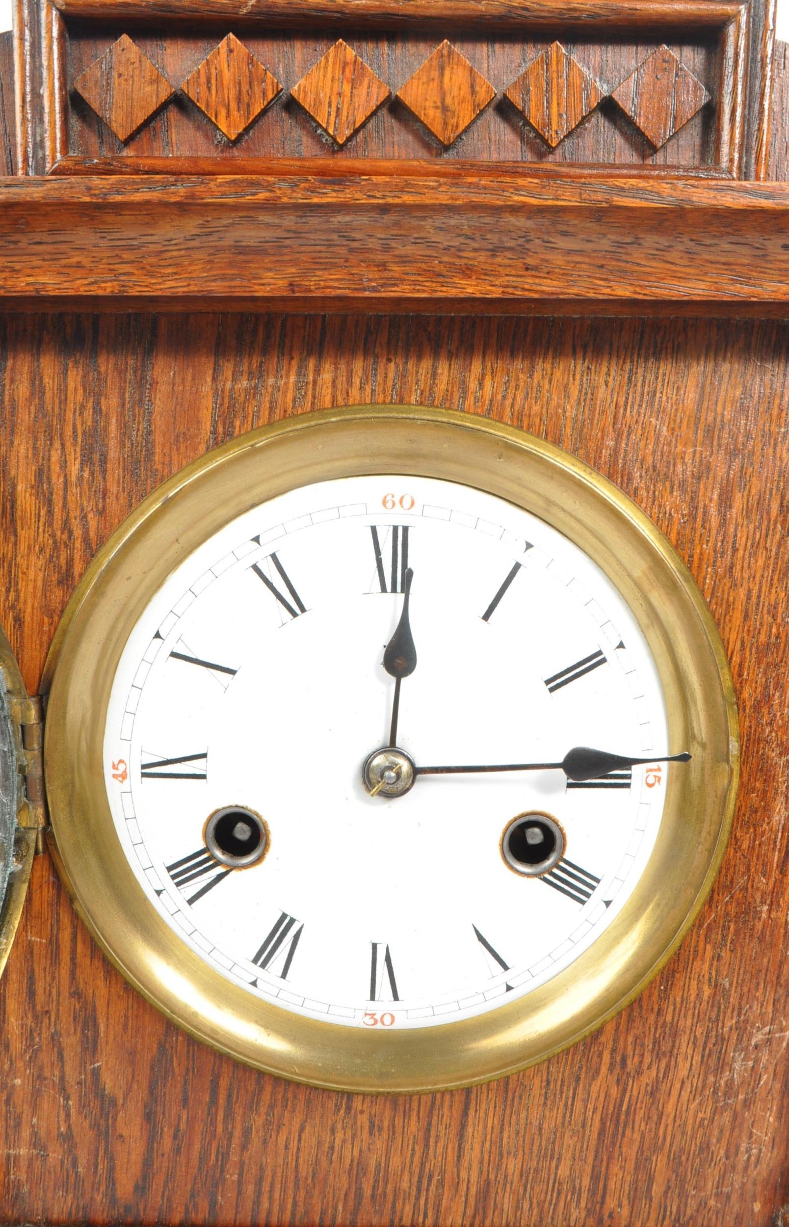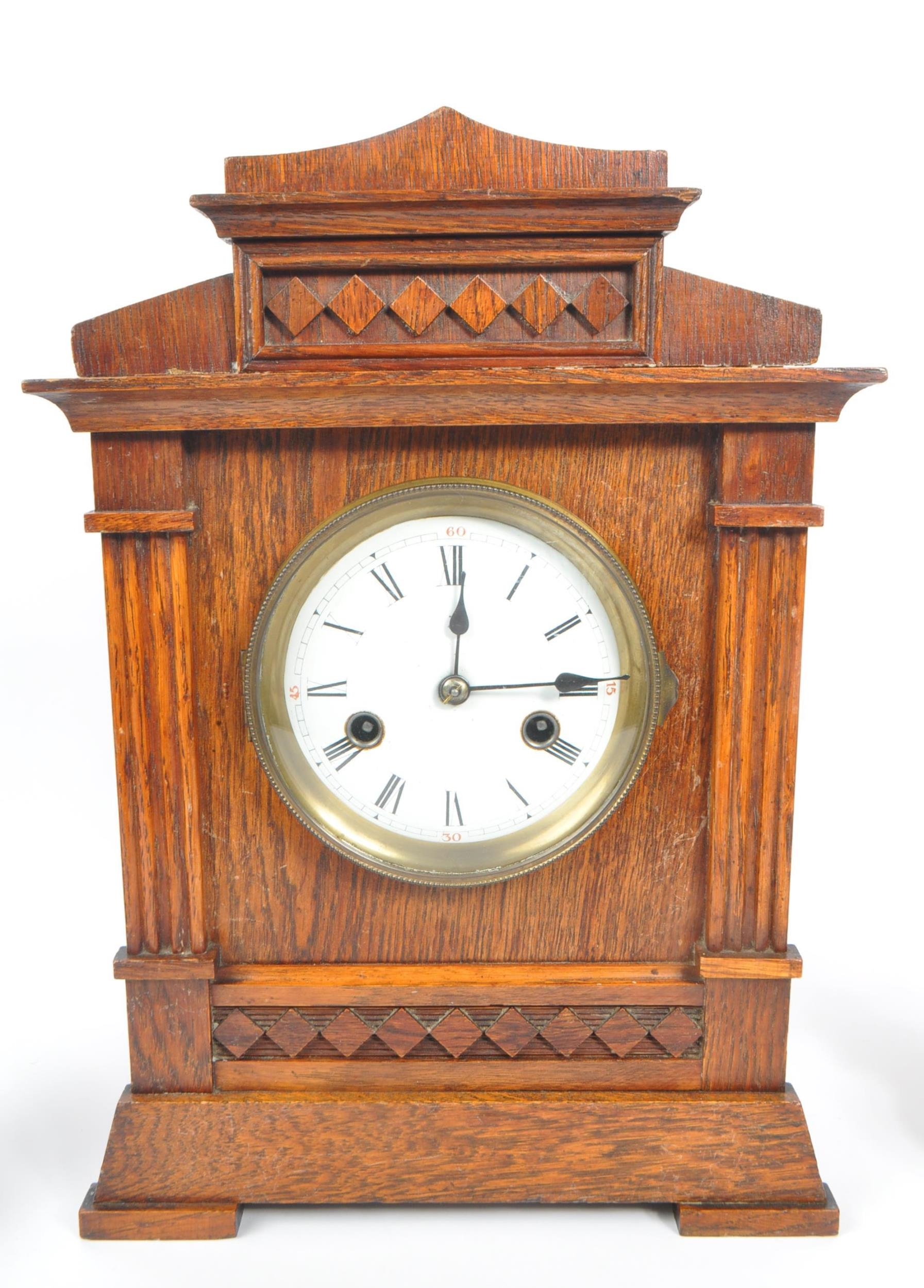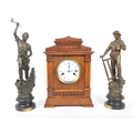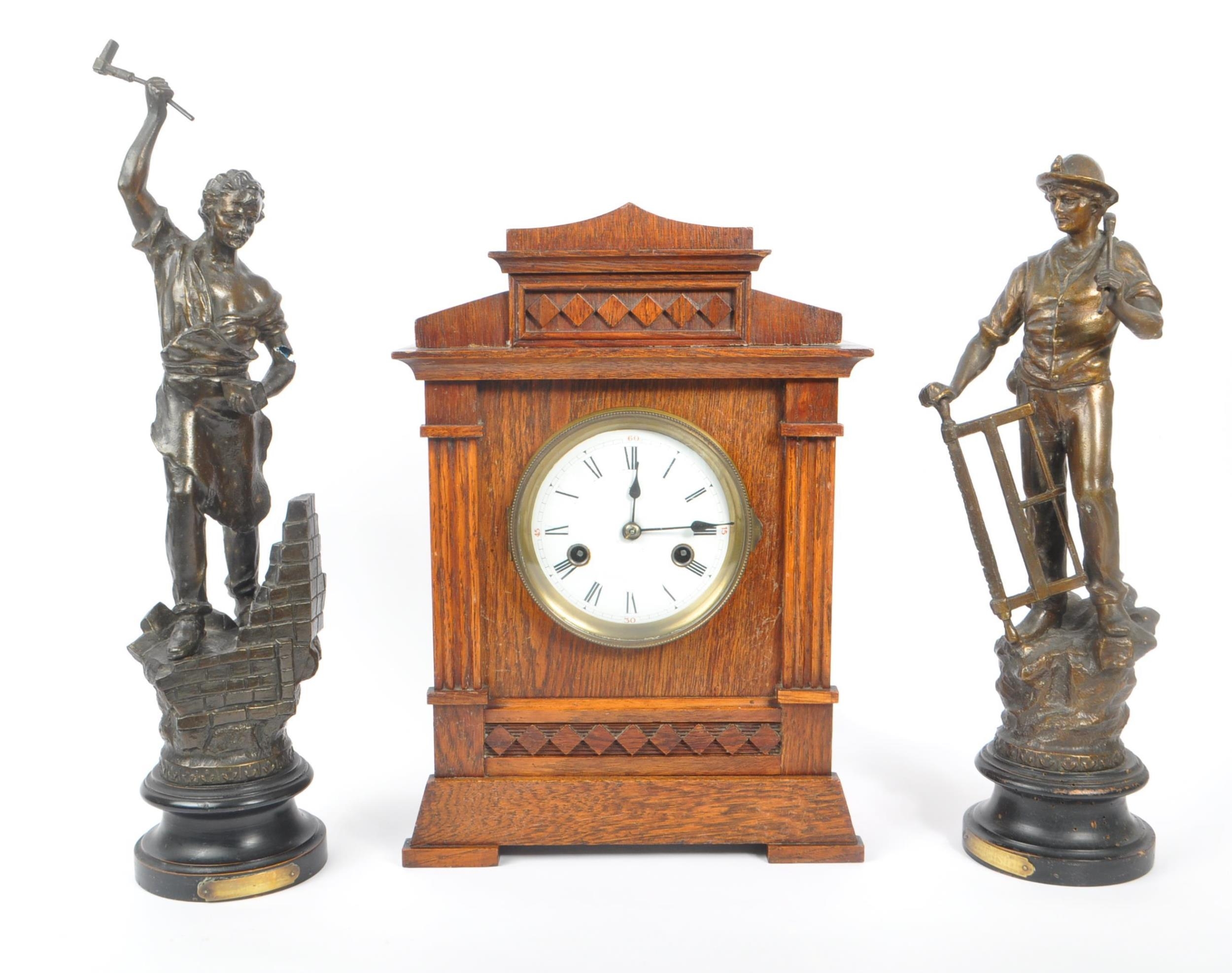 A vintage 20th century oak eight day movement mantel clock. With flared chamfered edge top, white enamelled face with roman numeral chapter ring, raised on a bracket feet. Together with two spelter figures of labourers, brick worker and saw man. Raised on a circular pedestal plinth base. Measures approx. 37cm tall.
