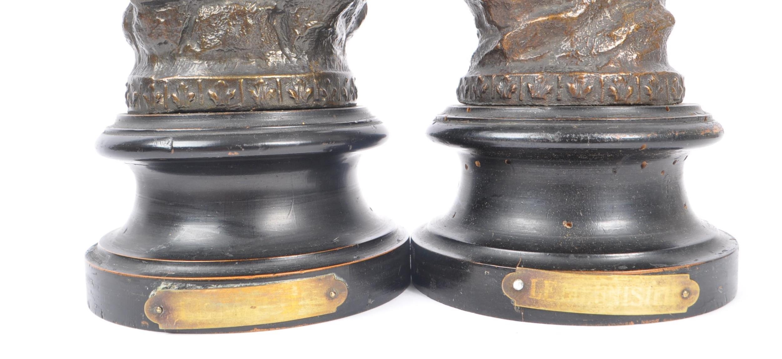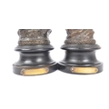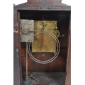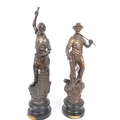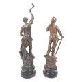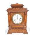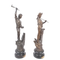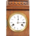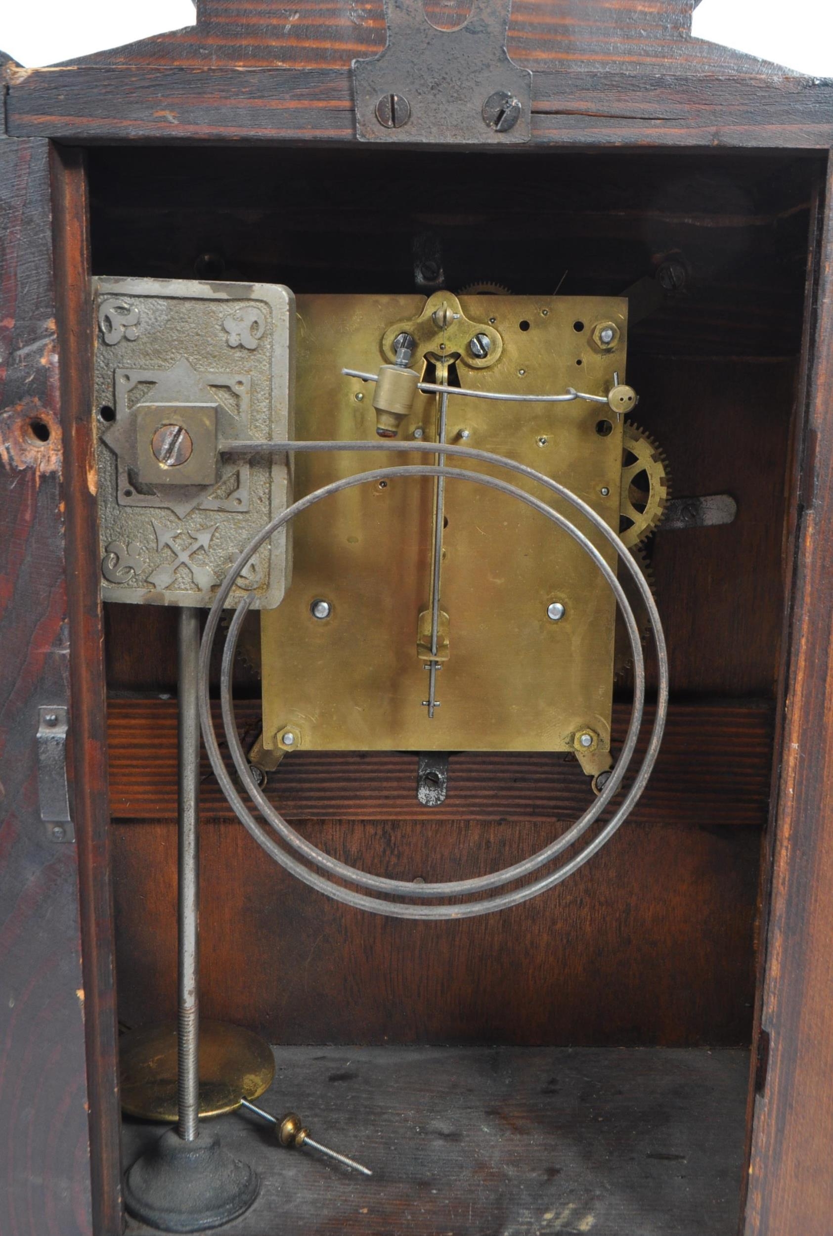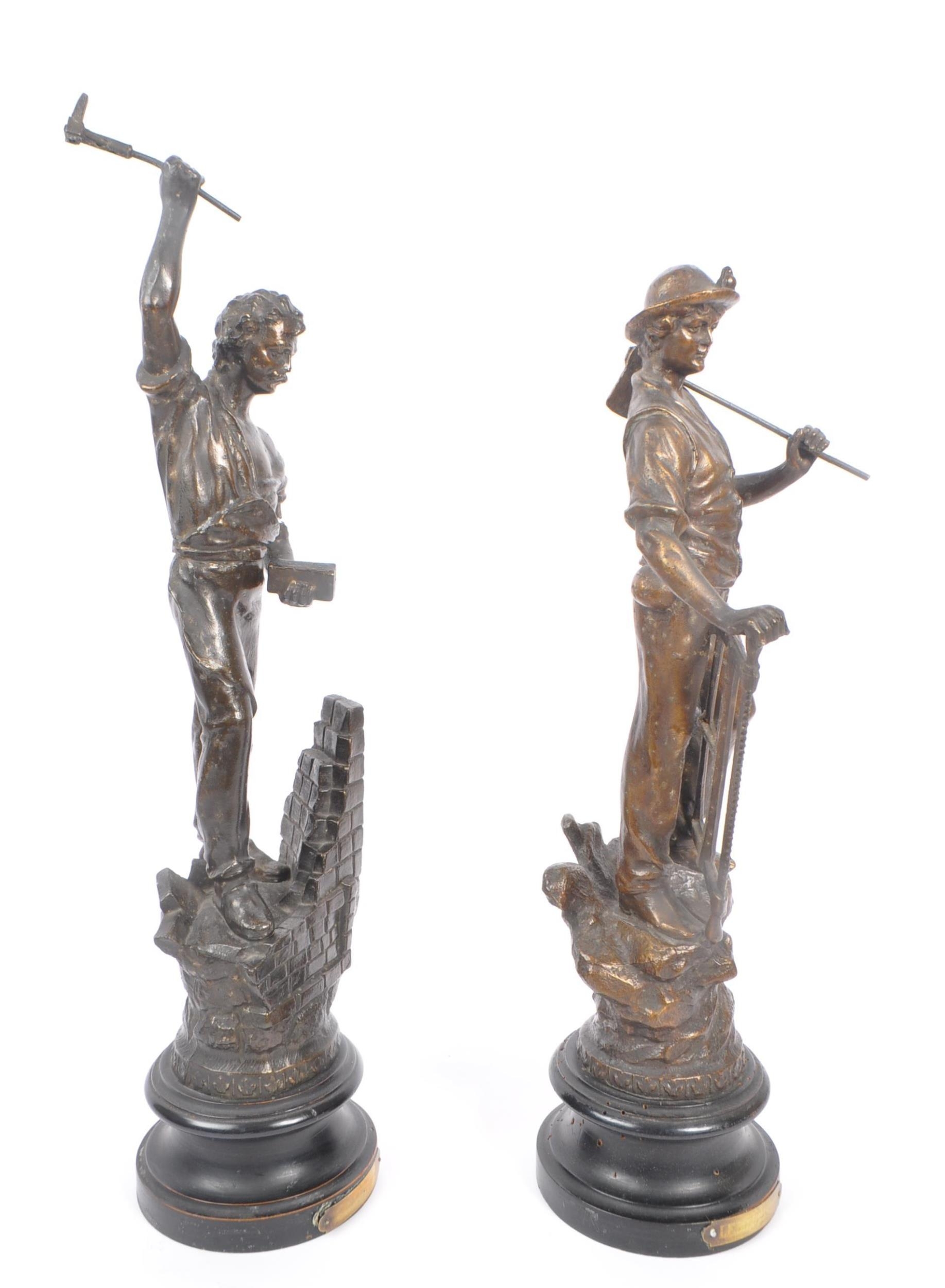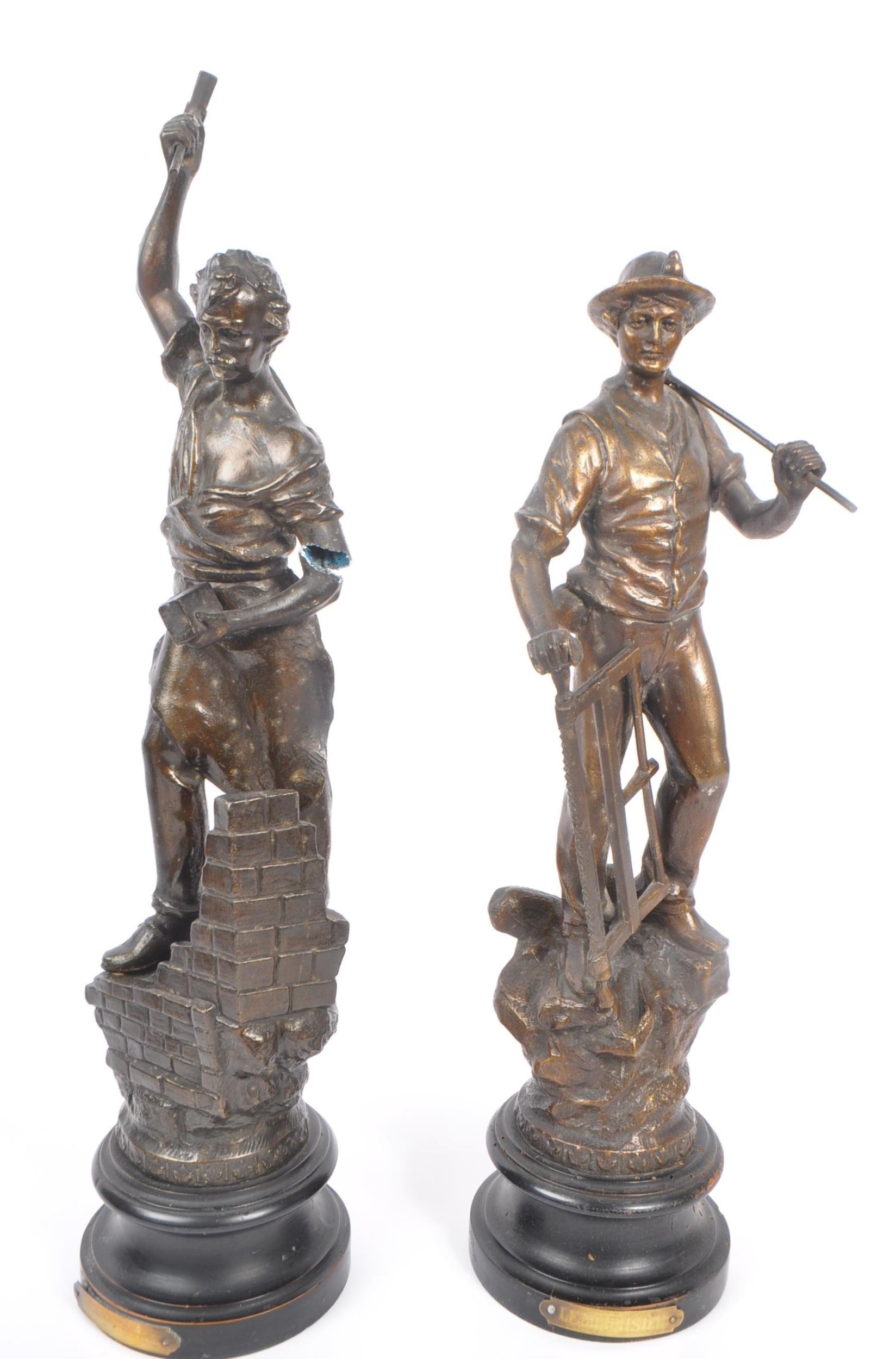 A vintage 20th century oak eight day movement mantel clock. With flared chamfered edge top, white enamelled face with roman numeral chapter ring, raised on a bracket feet. Together with two spelter figures of labourers, brick worker and saw man. Raised on a circular pedestal plinth base. Measures approx. 37cm tall.