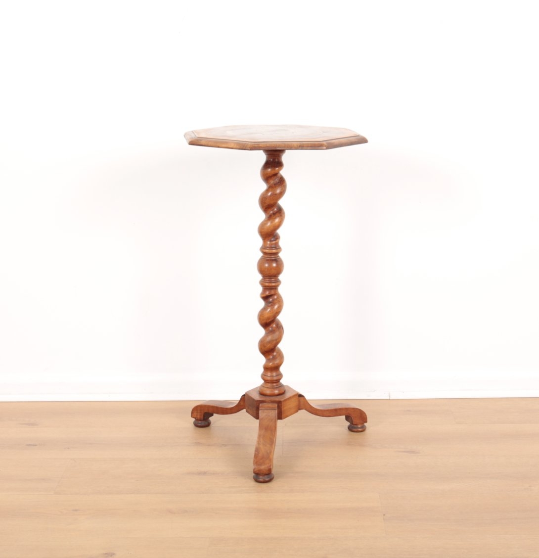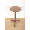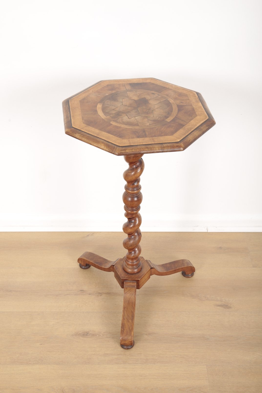 the octagonal crossbanded top inlaid with a central star, on a barley twist column to downswept legs, 69cm high x 37cm wide