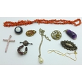 Jewellery including a Victorian silver brooch, a coral necklace, an amethyst quartz pendant, etc., horseshoe brooch lacking stones