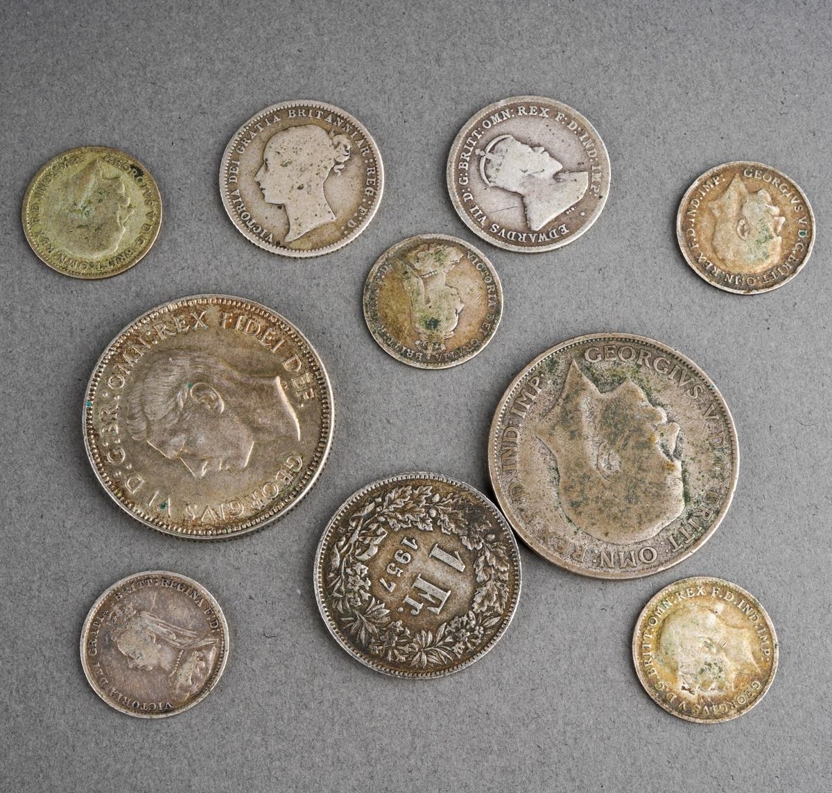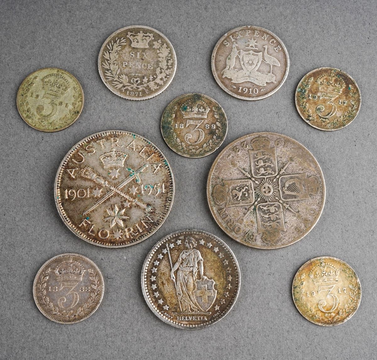 Collection of silver and other coinage to include 3pences, Australian florin etc
