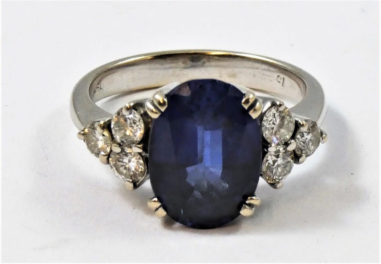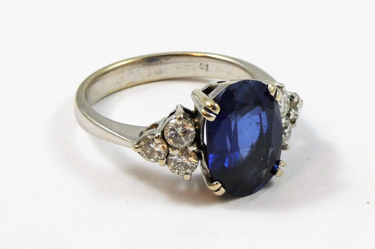 An 18ct white gold synthetic sapphire and diamond ring, claw set with an oval mixed cut stone, weighing 7.22 cts, with brilliant cut diamond trefoil shoulders, diamond weight approximately 1.2 cts, size T.