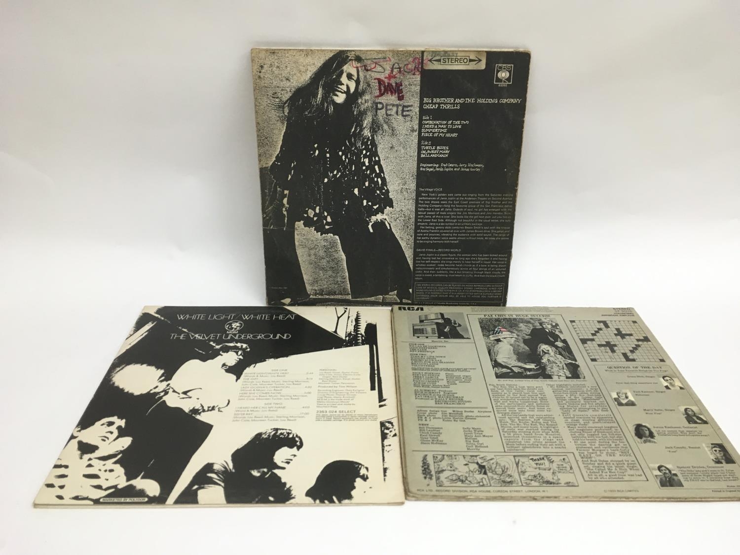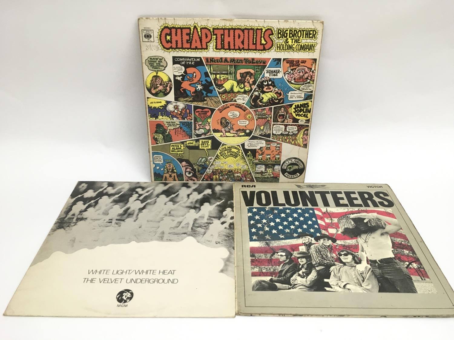 Three LPs comprising 'Volunteers' by Jefferson Airplane, 'Cheap Thrills' by Big Brother & The Holding Company and 'White Light/White Heat' by The Velvet Underground (3). 'Volunteers' is scratched to both sides and has spindle marks to the label, the other two albums are in a good condition despite having age related wear to the sleeves.