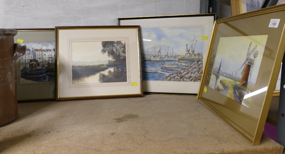 Four original watercolours, shipping scenes, windmills, country river etc