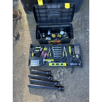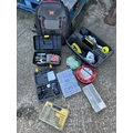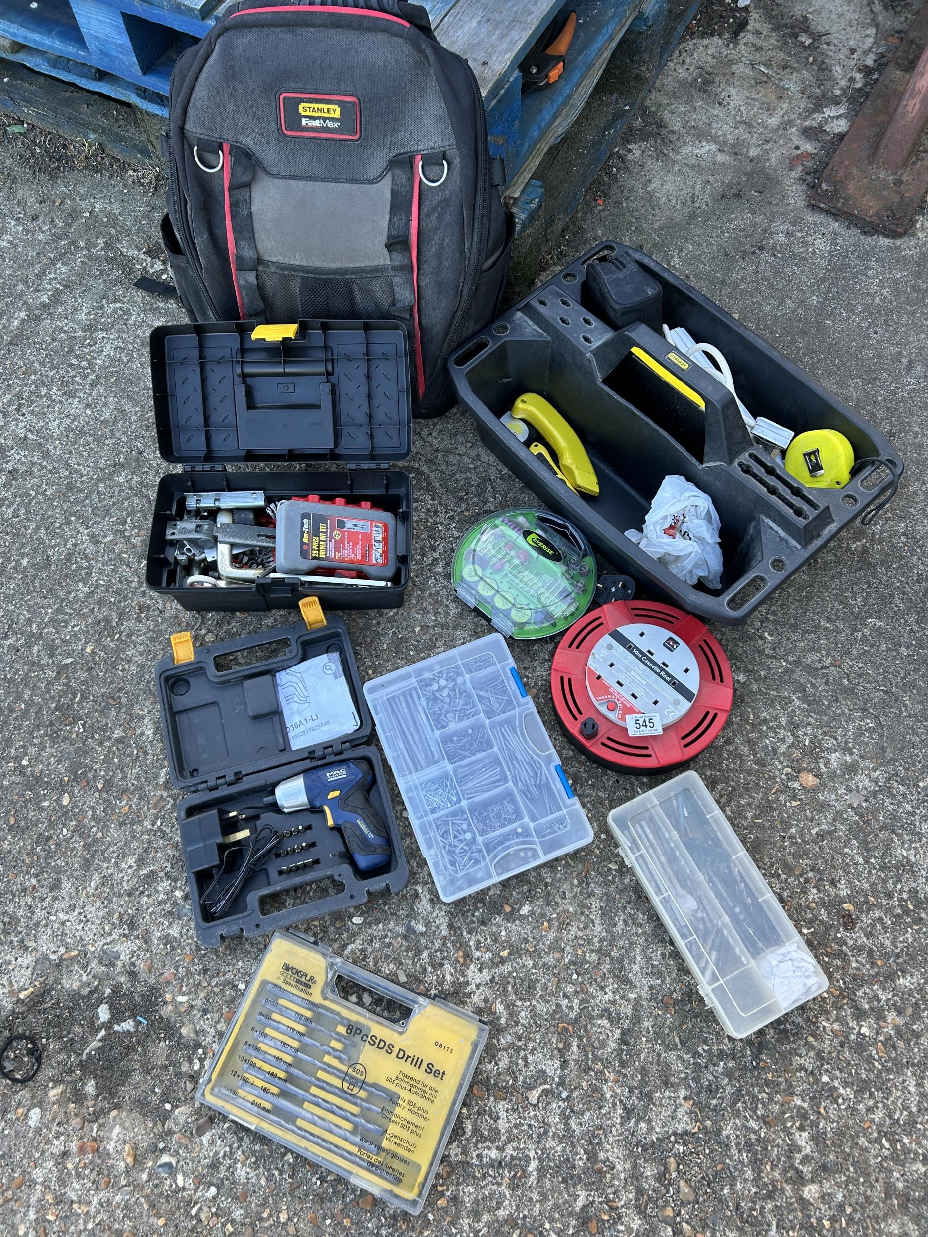 Extension lead, tool back pack, two tool boxes and mini driver etc