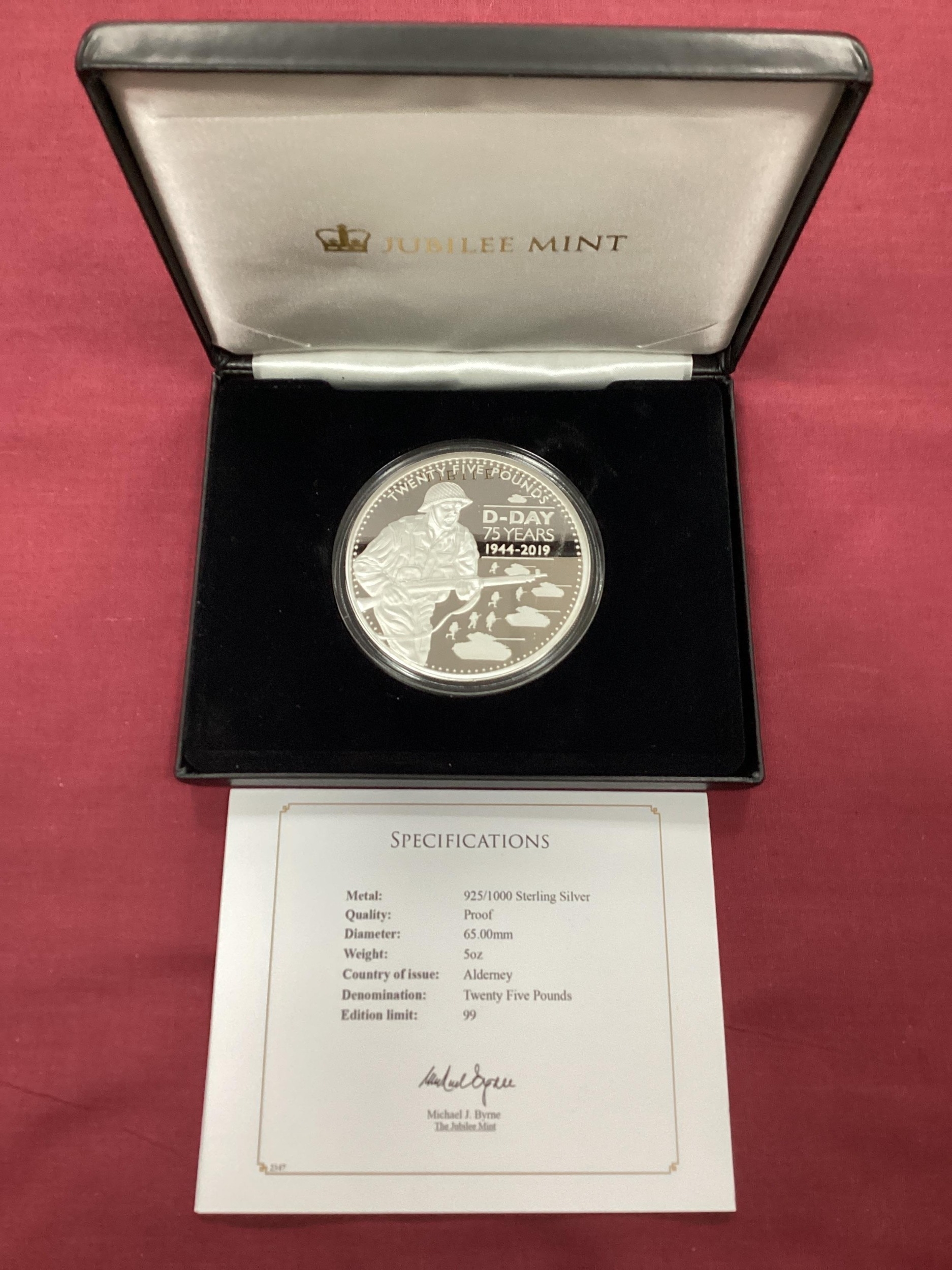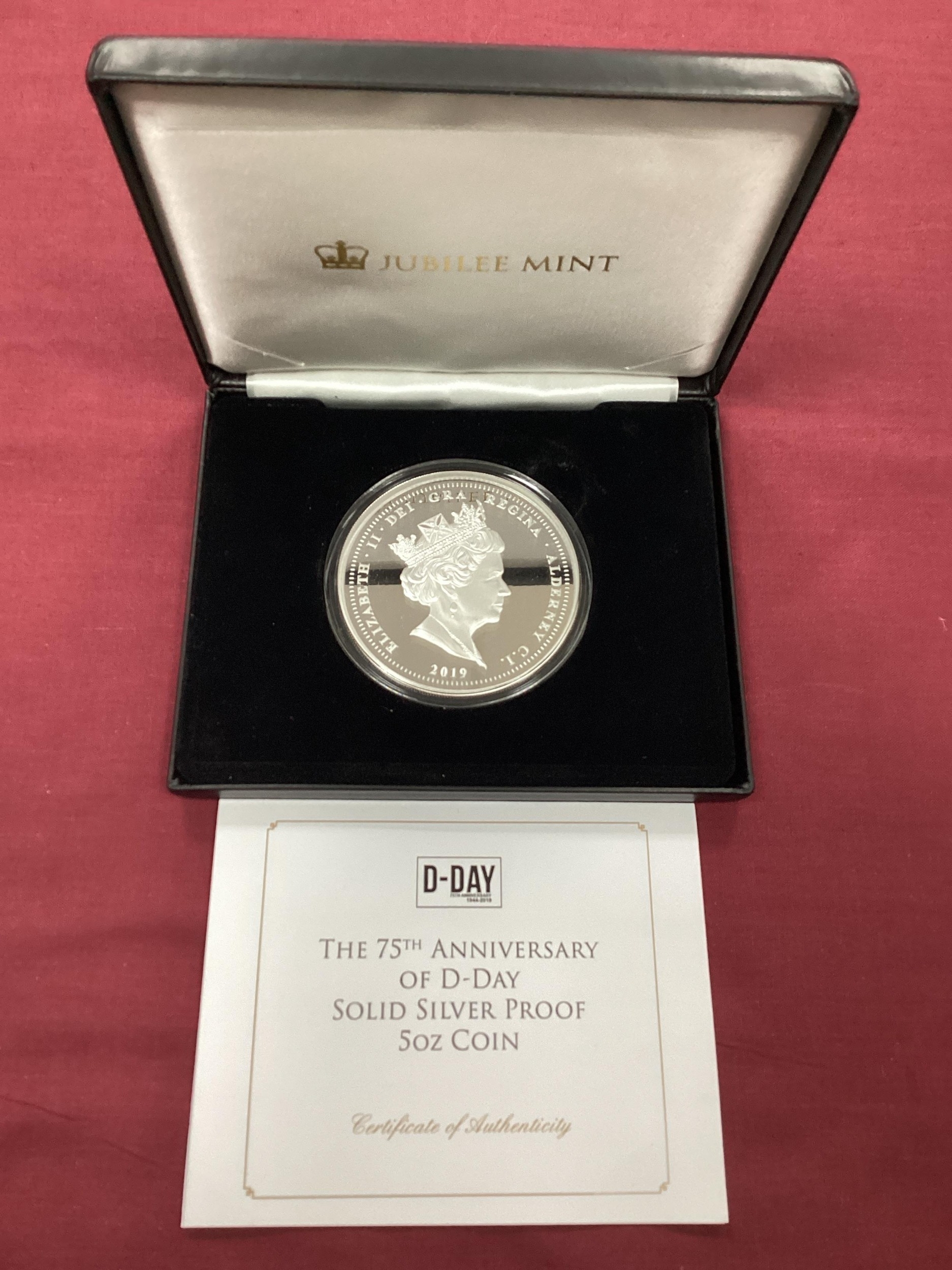 2019 Jubilee Mint QEII 'The 75th Anniversary Of D-Day' Five Ounce Silver Proof Coin, cased with a certificate of authenticity.