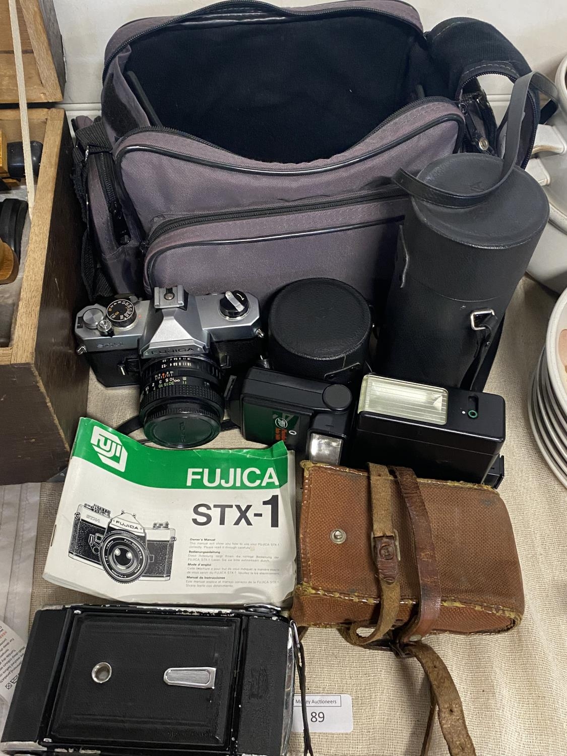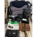 A selection of assorted vintage cameras and accessories.