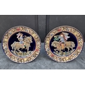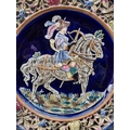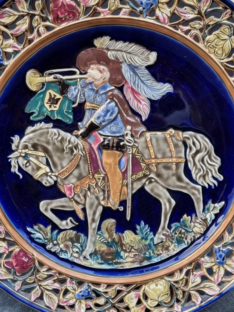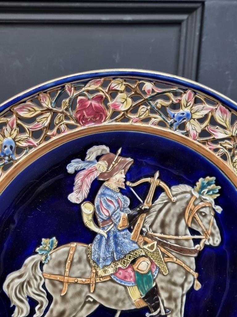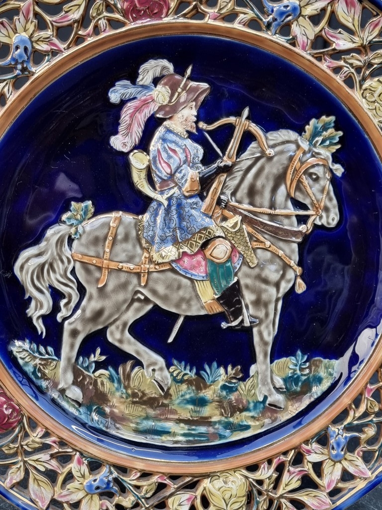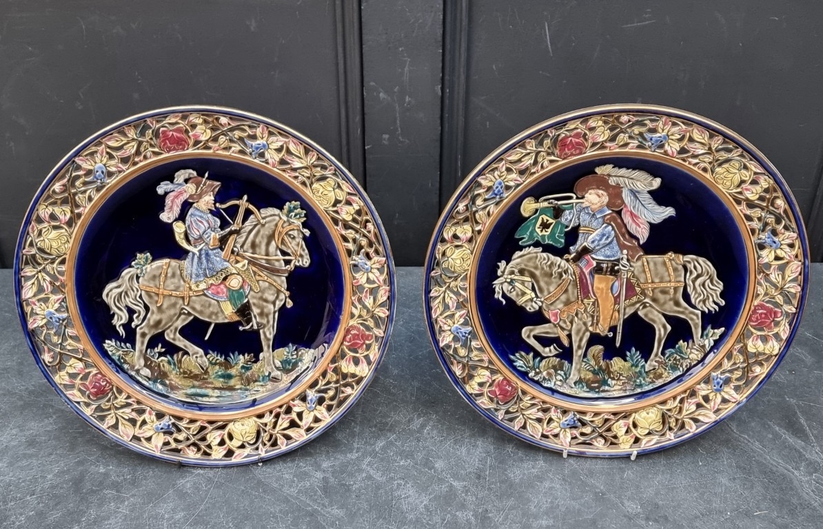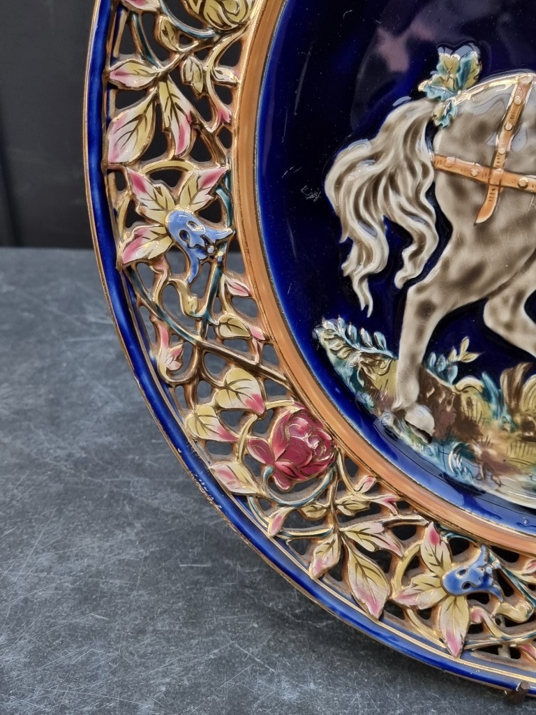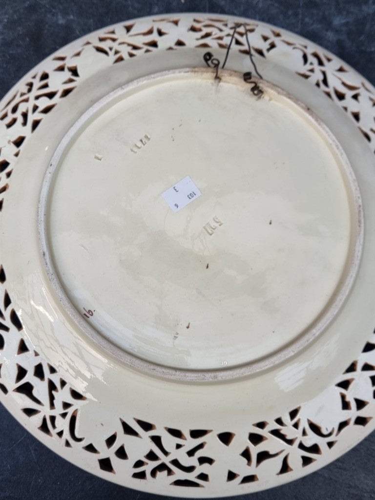 A large pair of Continental Majolica plates, in the manner of Zsolnay, with pierced rims and relief decoration, 36cm diameter.