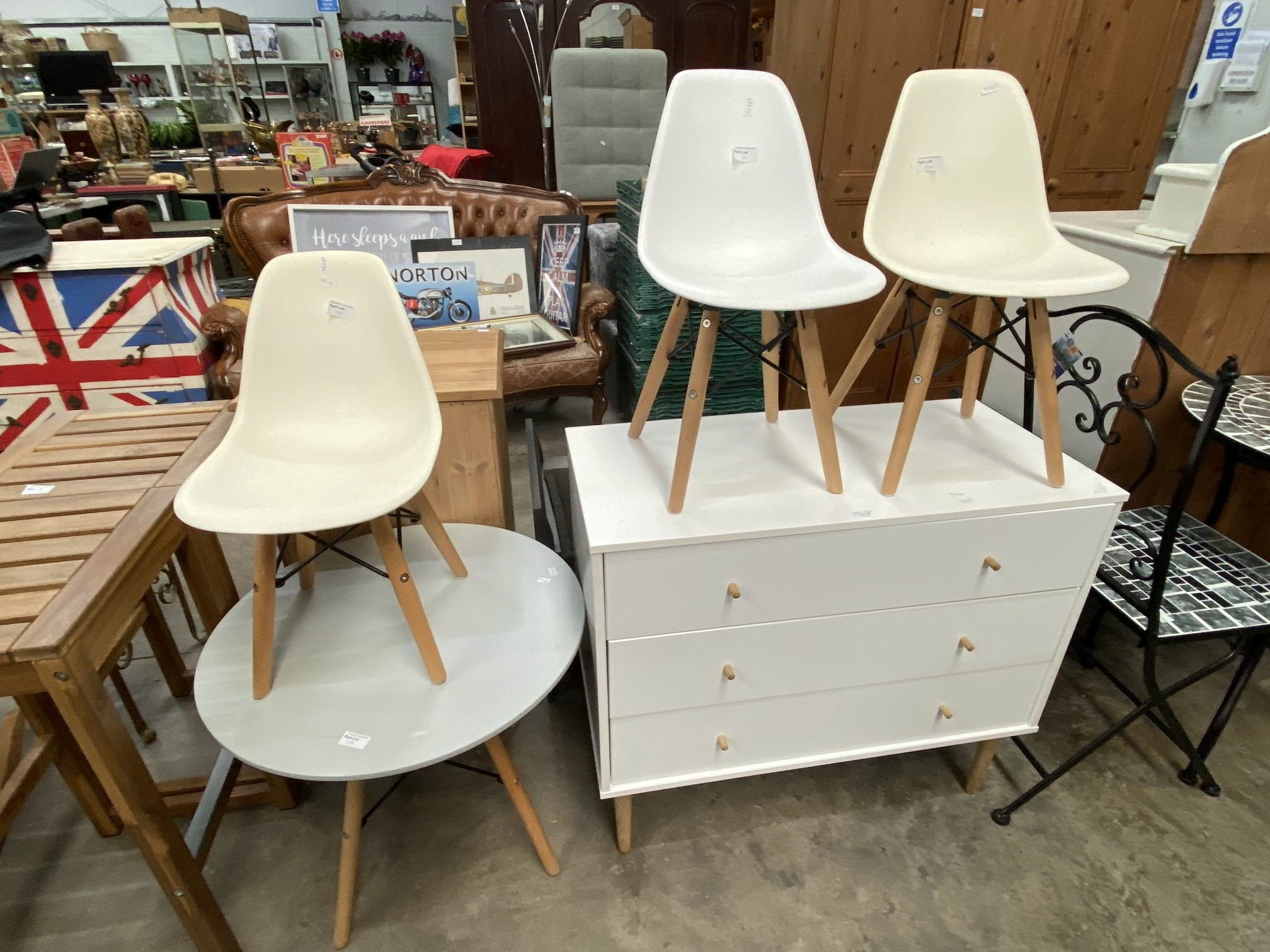 White three drawer chest 73H 82W 39D & a child's table 50H 60W with three Eames style chairs