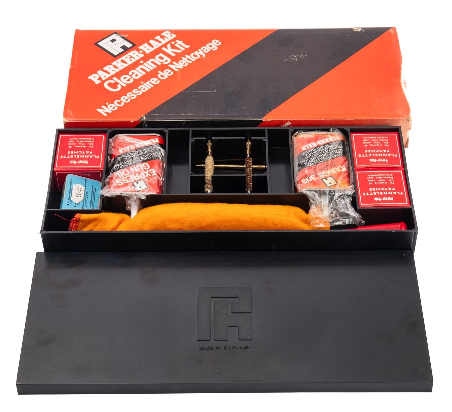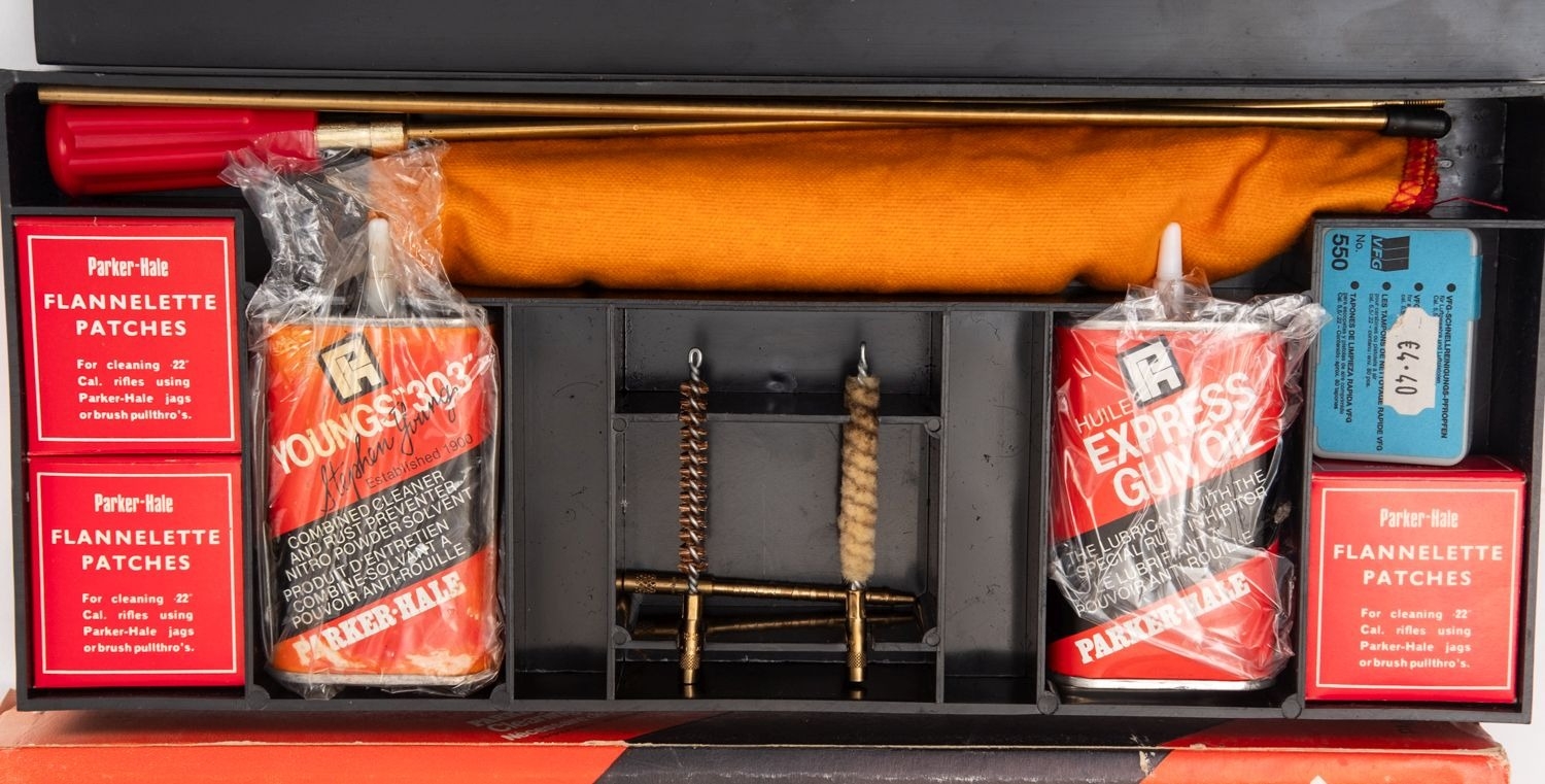 A Parker Hale .22 calibre rifle cleaning kit. Comprising brushes and oil etc in original box.