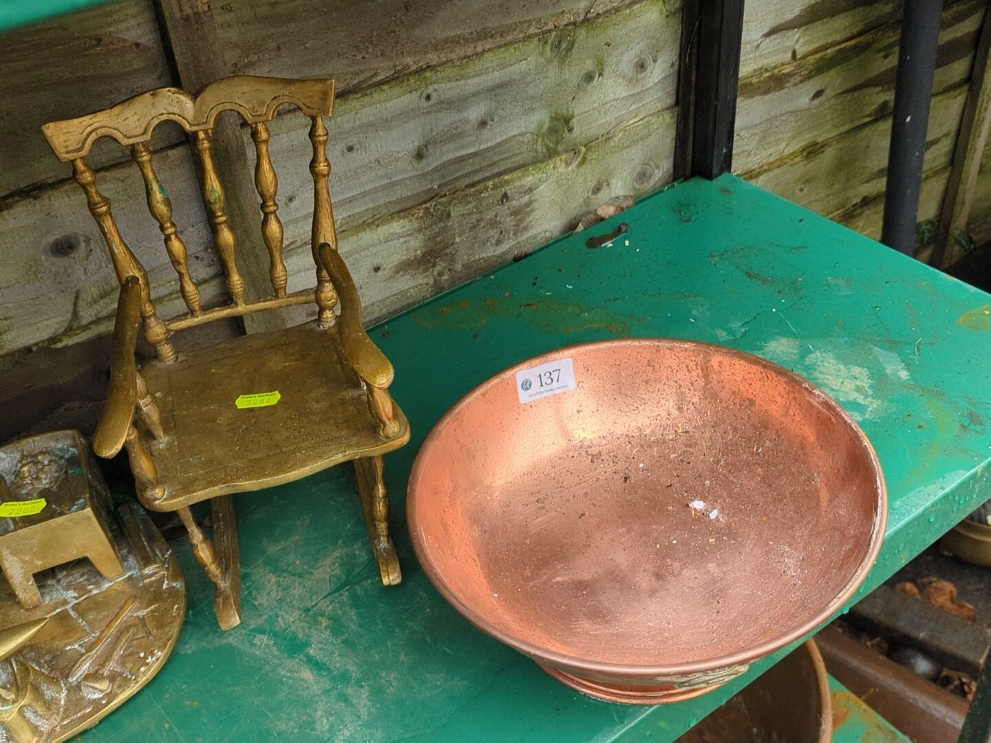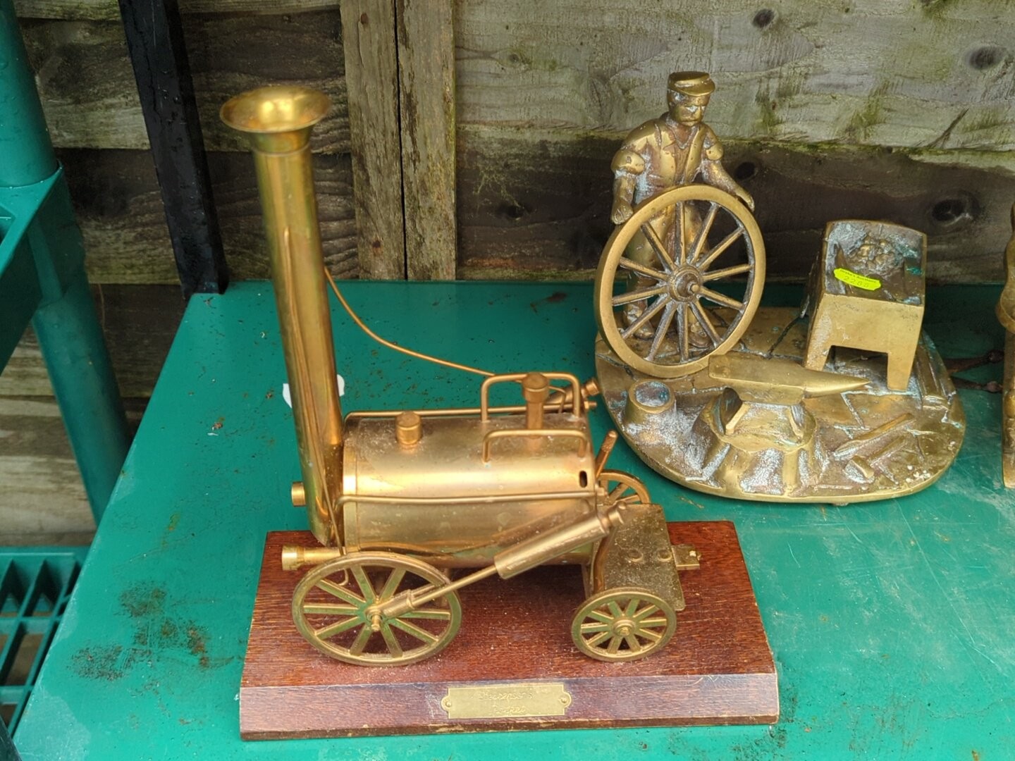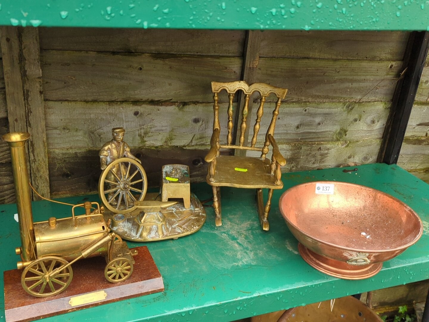 A group of decorative metal models comprising a brass locomotive on wood plinth titled ‘Stephenson’s Rocket’, a cast-metal blacksmith’s forge group, a miniature spindle-back chair, and a copper pedestal bowl applied with ‘St Dunstan’ badge.